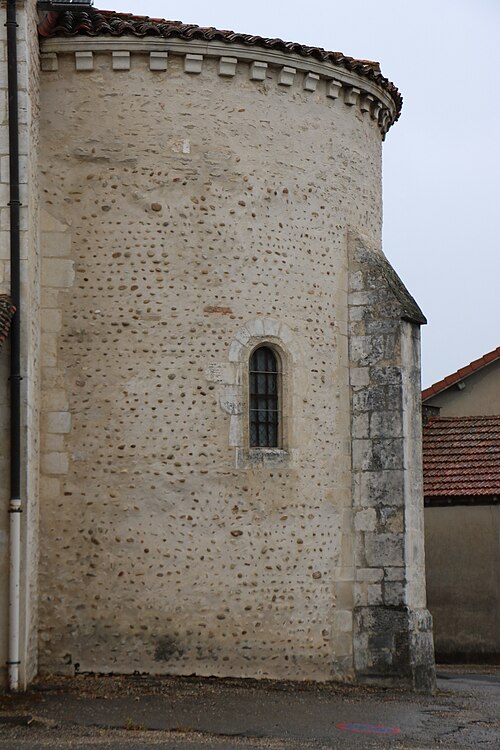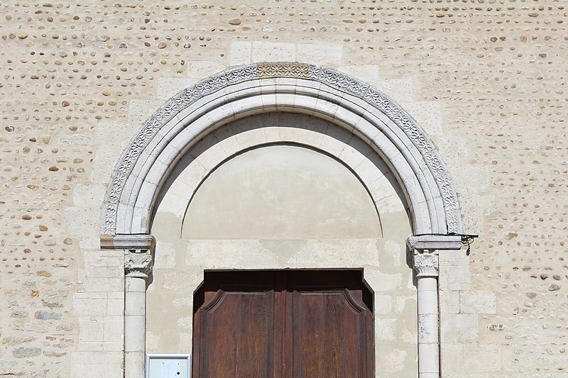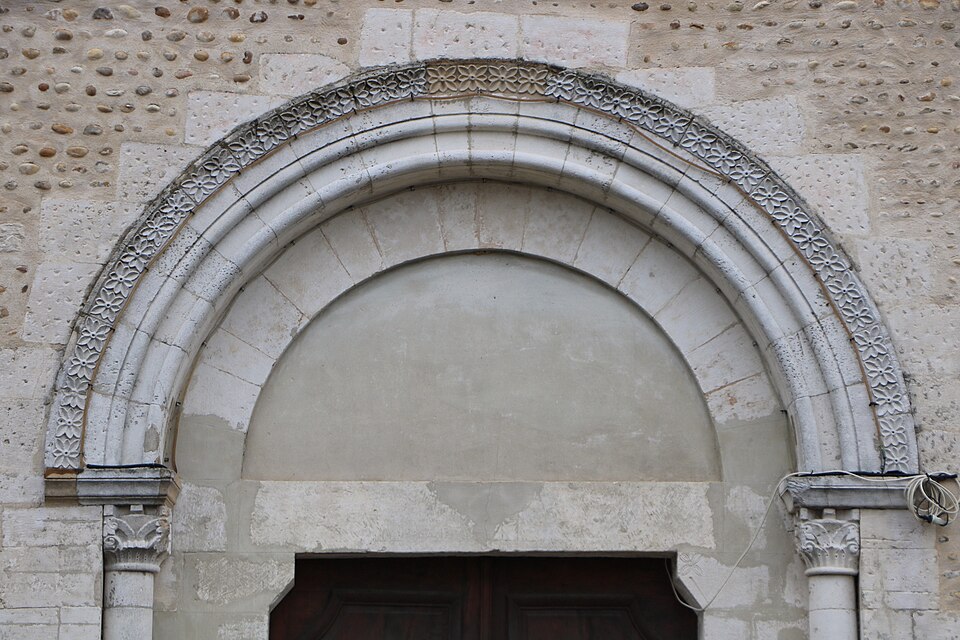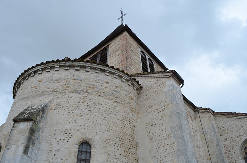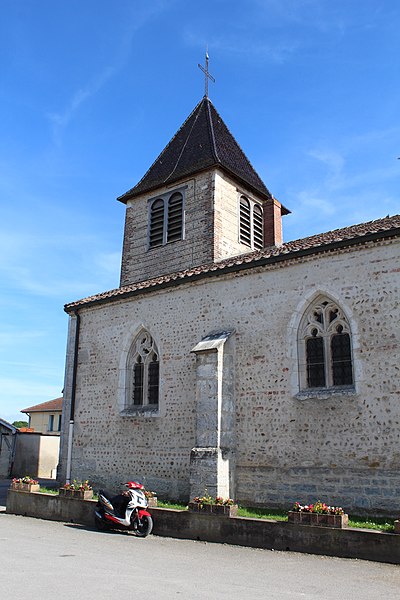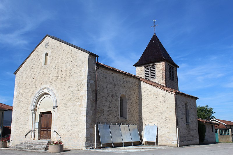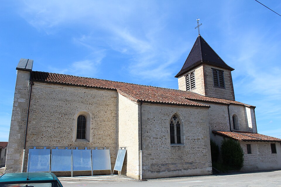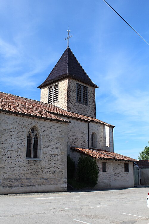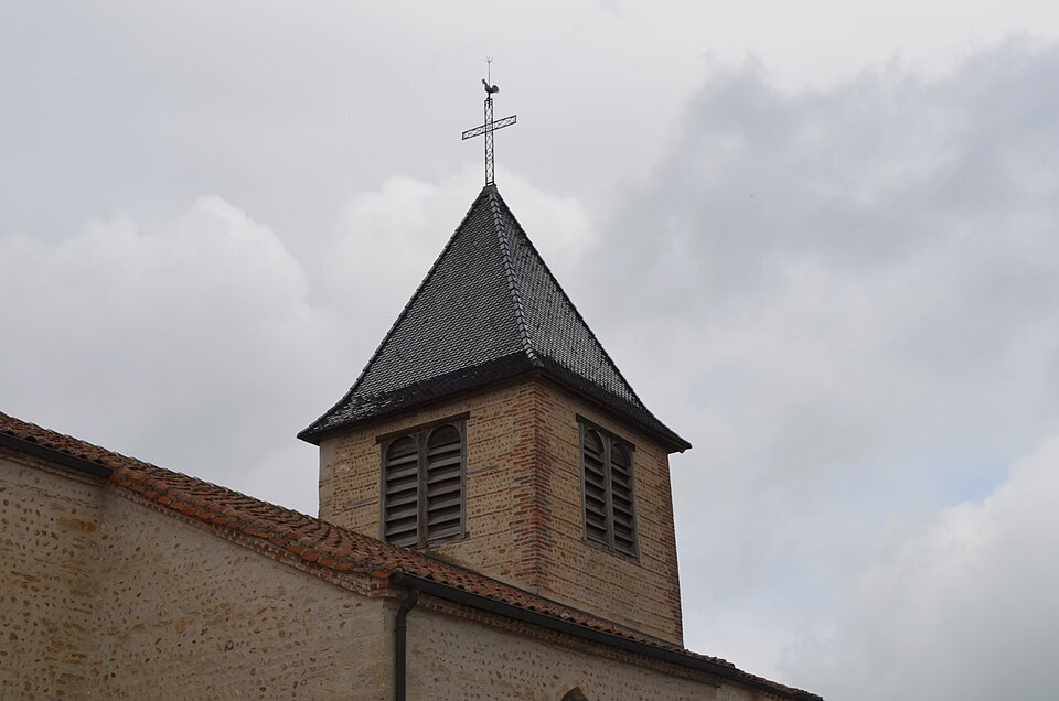 L’église Saint-Nizier, située à Saint-Nizier-le-Désert dans l’Ain (Auvergne-Rhône-Alpes), est inscrite au titre des monuments historiques depuis le 21 octobre 1926. Orientée ouest-est, elle présente un plan basilical avec une large nef épaulée de deux chapelles et un portail roman à double battant surmonté d’un linteau et d’un tympan en plein cintre. La nef, aujourd’hui enduite de blanc, est couverte d’une voûte en anse de panier et abrite plusieurs œuvres, tableaux et sculptures ; elle bénéficie de grandes baies en retrait ornées de vitraux à motif géométrique qui lui apportent une luminosité inhabituelle pour un édifice roman. Les chapelles latérales se distinguent par leur voûtement en croisée d’ogives et leurs baies pourvues d’un remplage élégant avec mouchettes. Le chœur, élevé d’une marche et non enduit, est polychrome : rythmé par des colonnes adossées, il est couvert d’une voûte en cul-de-four peinte en bleu étoilé et ornée d’un chrisme visible depuis la nef. Au centre se trouvent l’autel et un retable de pierre ; derrière le retable, des bancs de bois occupent l’abside pour les clercs. Les archives montrent que la nef était également polychrome au début du XXe siècle, avec un décor d’appareil rectangulaire orné de détails cruciformes, et l’on distingue encore des traces de la voûte étoilée là où l’enduit a disparu. Le décor et les éléments sculptés comprennent notamment le chrisme du chœur, la croix sommitale de la tour surmontée d’un coq visible sur des cartes postales anciennes, un chemin de croix gravé ainsi que diverses statues, dont une Vierge à l’Enfant et saint Denis représenté avec sa tête coupée.