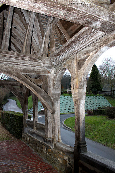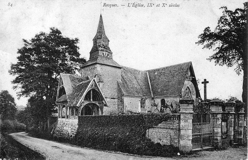 L'église Saint-Ouen de Rocques, située dans le Calvados à l'intersection des routes Lisieux–Fauguernon et Hermival‑les‑Vaux–Ouilly‑le‑Vicomte, est classée monument historique en 1946. Elle se dresse au centre d'un ancien cimetière, marqué par les bras d'une vieille croix de pierre. Une tour massive et carrée du XIIIe siècle, coiffée d'un petit clocher ardoisé du XVIe siècle, constitue l'avant‑corps de la nef. L'édifice a été partiellement endommagé lors de la Libération entre le 22 et le 24 août 1944 (vitraux, porches et contrefort droit du transept) et restauré en 1948‑49 par les services de la reconstruction et des Beaux‑Arts. Deux porches en bois juxtaposés, qui précèdent la porte principale, forment la partie la plus originale de l'édifice. Le premier, le moins orné, semble empiéter sur le cimetière et présente des poutres tronquées laissant penser qu'il a été réduit. Le second, adossé au portail, comporte des poutres sculptées de torsades et porte, sur deux pieds droits, un écusson aux armes du cardinal Le Veneur, ce qui situe sa construction durant son épiscopat (1505‑1539). Au milieu du galbe figure une grosse salamandre, emblème de François Ier, confirmant l'époque de construction. Le pavage du chœur, composé de briques rouges à six côtés, et les torchères attirent également l'attention des connaisseurs.
