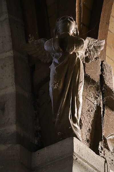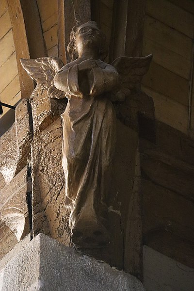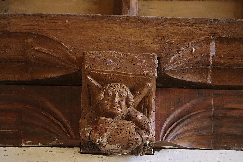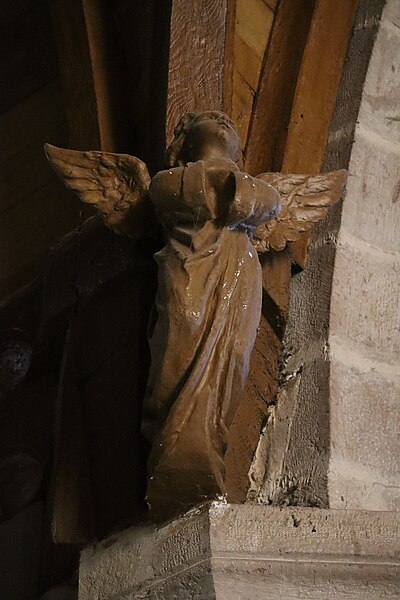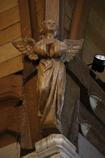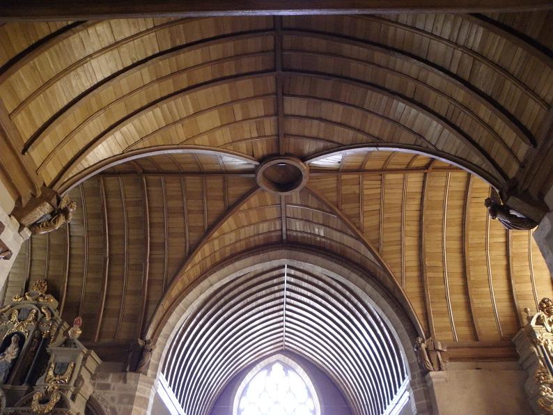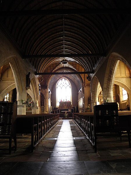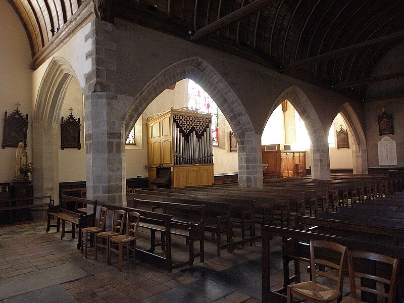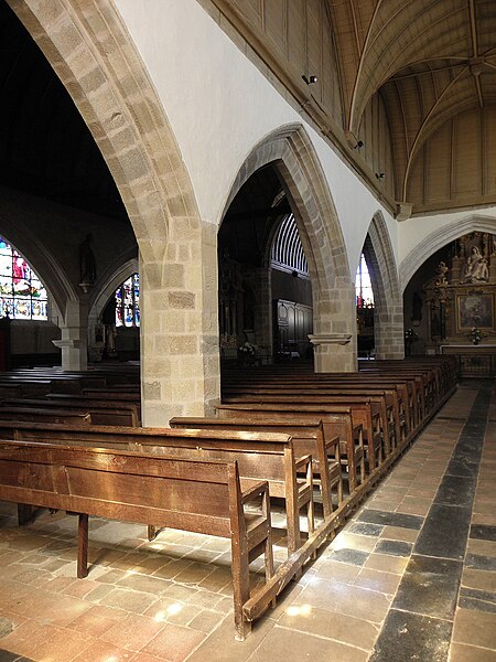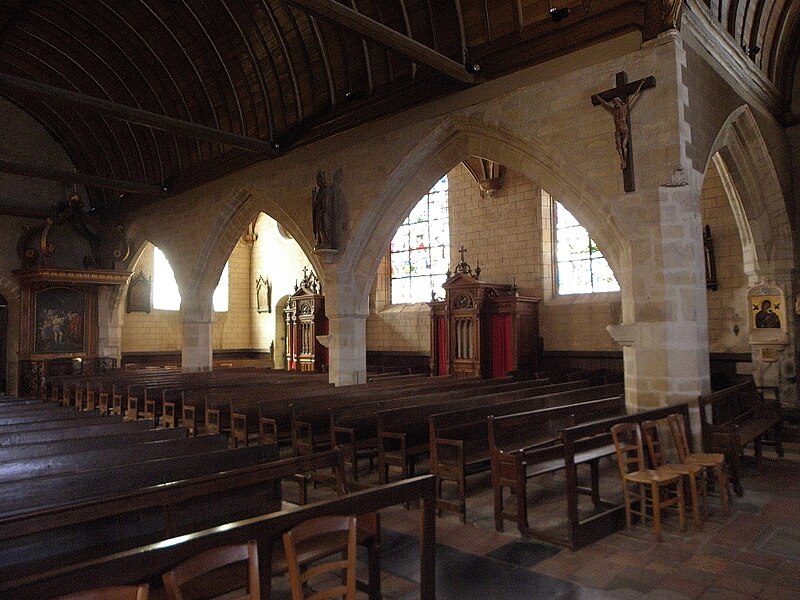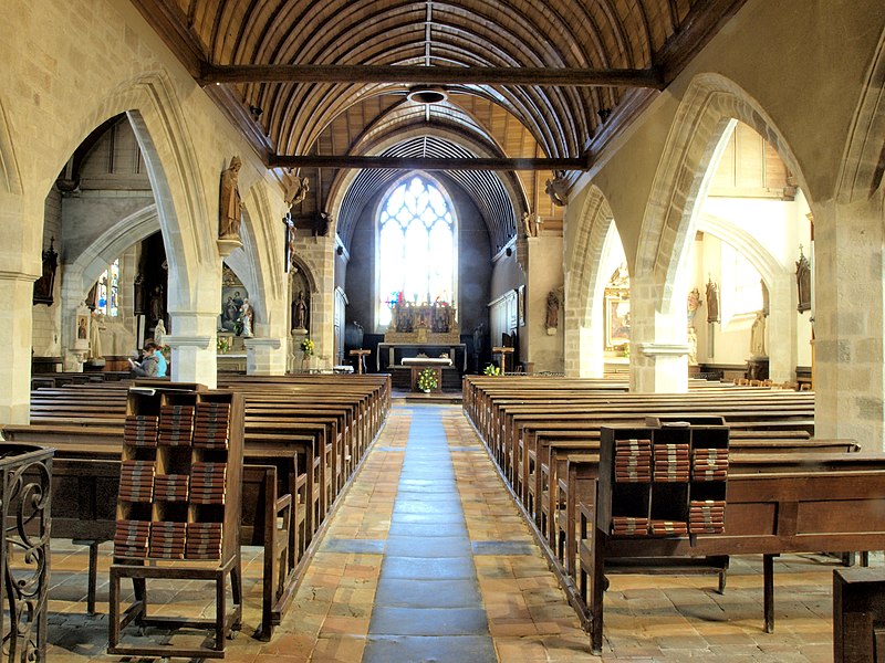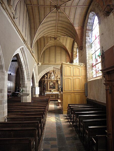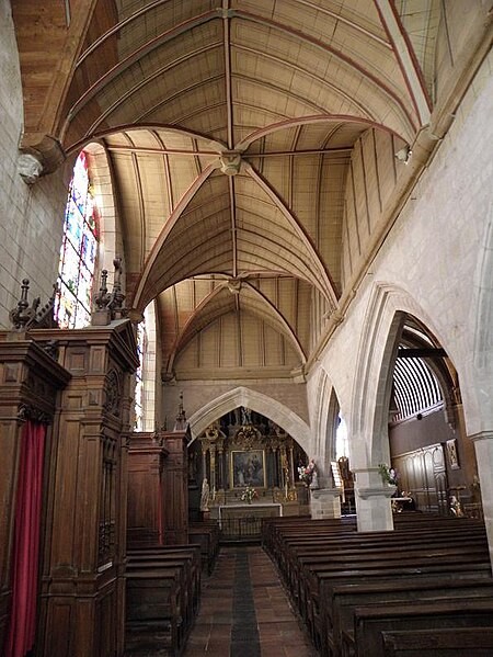 L'édifice est entièrement voûté en bois ; la longueur intérieure hors tour est de 30,80 m, la nef mesure 16,40 m de long sur 7,30 m de large, et l'ensemble nef et bas‑côtés atteint 16,90 m de largeur ; le chœur mesure 9,20 m sur 5,80 m. La nef principale, aveugle, est rythmée par trois arcades de chaque côté, sommées de sablières portant un douvis ogival maintenu par quatre poutres transversales, tandis que les collatéraux sont voûtés d'ogives. La croisée du transept s'orne, aux angles, de quatre blochets sculptés d'anges et l'éclairage provient principalement des vitraux des collatéraux, des transepts et du chœur, qui sont munis de meneaux et de remplages.