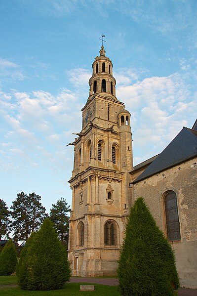 Le clocher, seul élément classé de l'édifice, s'élève hors‑œuvre sur le flanc sud et présente six niveaux mêlant ordonnances classiques et lanternes superposées ; une tourelle d'escalier octogonale donne accès aux étages supérieurs. Le rez‑de‑chaussée de la tour, distinct de la nef, servait de baptistère et conserve une fontaine en marbre du XVIIe siècle ainsi qu'un écusson armorié portant les armes du bourgeois Samson ; une pierre porte l'inscription de l'année 1544. La nef, reconstruite en 1863 par les architectes Martial Pelfresne et Alphonse Delaunay, s'harmonise avec le style du clocher.