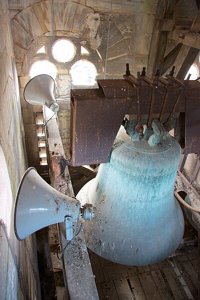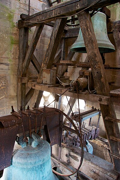 Le clocher renferme encore trois anciennes cloches en bronze, mais la sonnerie a été modernisée par un système électronique et les mécanismes anciens ne sont plus utilisables ; l'une des cloches porte une inscription commémorant 1947. Parmi les personnalités liées à la paroisse, l'abbé Réginald Outhier fut inhumé en 1774 dans la chapelle de l'Immaculée Conception et les sépultures anciennes sont devenues invisibles à la suite des destructions et reconstructions après la Révolution. Antoine Pilon, natif de Bayeux et baptisé à Saint‑Patrice en 1664, est commémoré par une plaque apposée sur le mur d'enceinte en 1994 par l'association des Pilon d'Amérique.