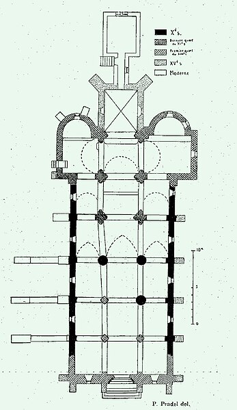 L'origine de l'église actuelle remonte à la fin du Xe siècle ; en subsistent la base des murs latéraux de la nef et trois piliers ronds, éléments rattachés au premier art roman selon Josep Puig i Cadafalch. Au XIe siècle, la partie orientale fut démolie pour reconstruire le transept et ses absidioles ; deux piles orientales de la nef furent élevées en forme cruciforme et cantonnées de demi-colonnes, sauf du côté des bas-côtés. Les voûtes de la nef s'appuient sur ces piles et sur les piliers ronds du Xe siècle, eux-mêmes surmontés d'un appareil comportant des chapiteaux remployés de facture rudimentaire.