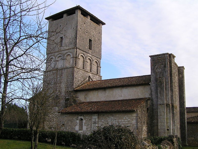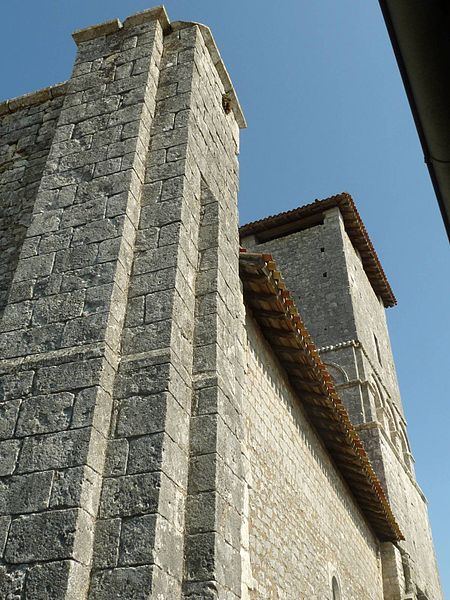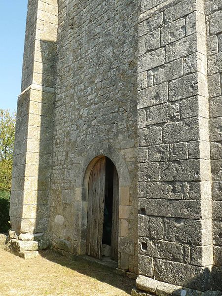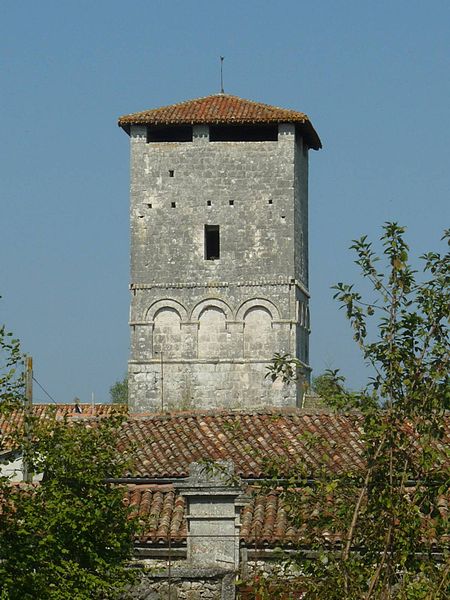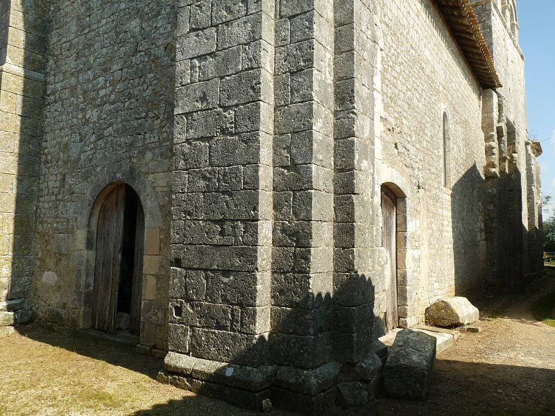 La façade ouest est flanquée de deux contreforts qui s'élèvent jusqu'à son sommet aux extrémités ; des contreforts doublés correspondent aux pilastres occidentaux de la coupole et des contreforts plus petits sont placés à l'ouest de la nef, sur la chapelle et l'abside. Le clocher, de plan rectangulaire, présente un premier niveau ajouré d'arcatures reposant sur un cordon mouluré ; au-dessus, un second niveau s'appuie sur un cordon orné de billettes verticales et percé d'ouvertures rectangulaires. Sous le clocher, le faux carré porte une coupole sur trompes dont les départs s'appuient sur des cordons horizontaux.