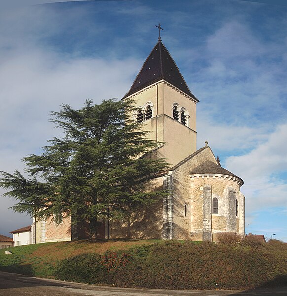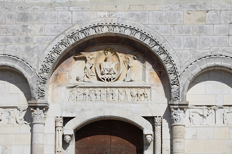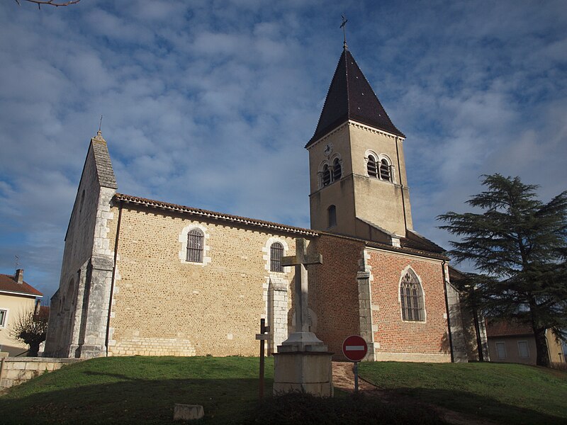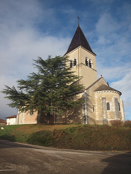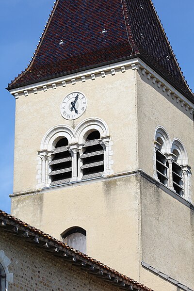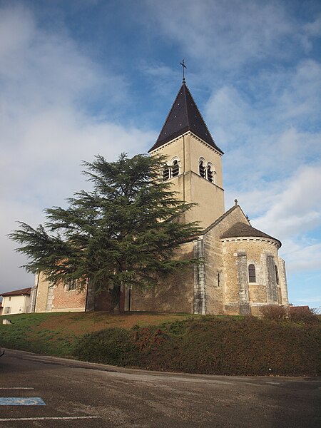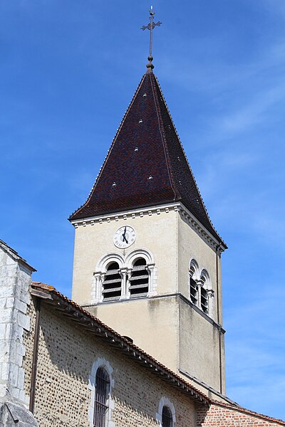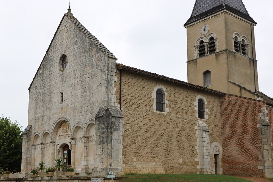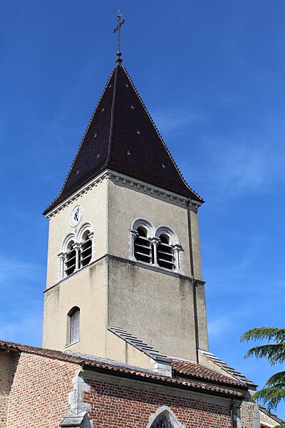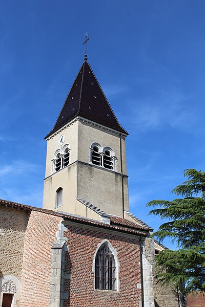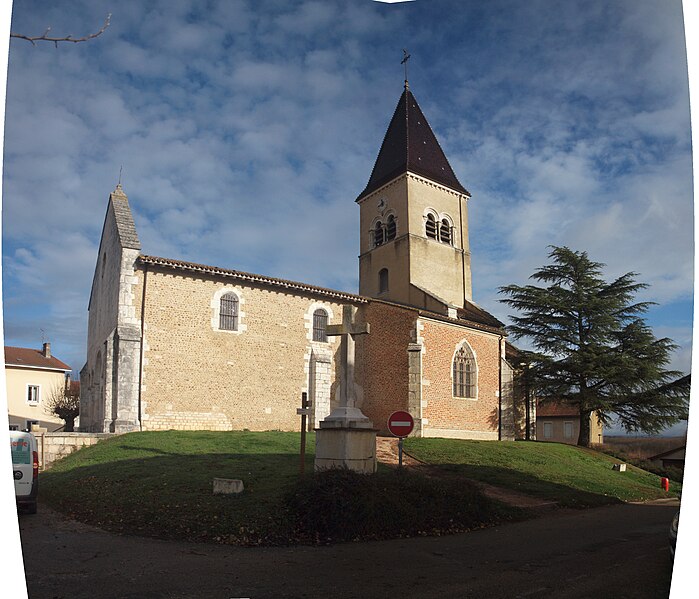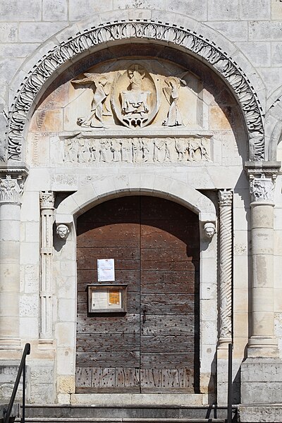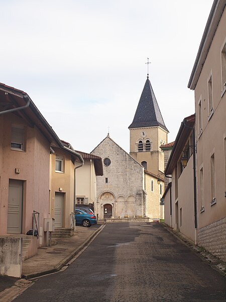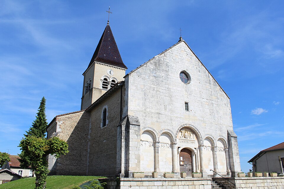 L'église Saint‑Paul, de type basilical, se situe à Saint‑Paul‑de‑Varax dans l'Ain. Construite entre 1103 et 1150 et souvent remaniée, l'édifice — classé au titre des monuments historiques en 1908, à l'exception du clocher — a vu son clocher d'origine détruit à la Révolution par les soldats du préfet Albite puis reconstruit au XIXe siècle. La façade occidentale en pierre blanche contraste avec le reste du bâtiment ; le portail en plein cintre et les arcades voisines sont ornés de colonnes, chapiteaux et archivoltes sculptés de motifs romans. Le tympan, dont l'arc est plus large que ceux des autres baies, porte une frise où figurent Marie et les apôtres ainsi qu'une mandorle montrant l'Ascension du Christ encadrée par deux anges ; on y lit aussi une inscription dédicatoire en latin honorant Jésus‑Christ, la Vierge, saint Paul et tous les saints de Dieu. D'autres frises racontent des épisodes de la vie de Paul, notamment sa conversion, la chute de Simon le magicien et sa mise à mort par Néron. L'intérieur présente une nef aux murs en galets disposés en arête‑de‑poisson ; une petite porte sud cintrée ouvre sur un tympan sculpté et les fonds baptismaux reposent sur un chapiteau romain. Les chapelles latérales, non placées en vis‑à‑vis, sont bâties en briques rouges locales appelées "carrons", tandis que le chevet et l'abside mêlent galets et pierres blanches.