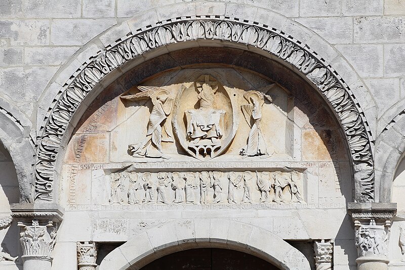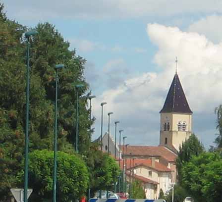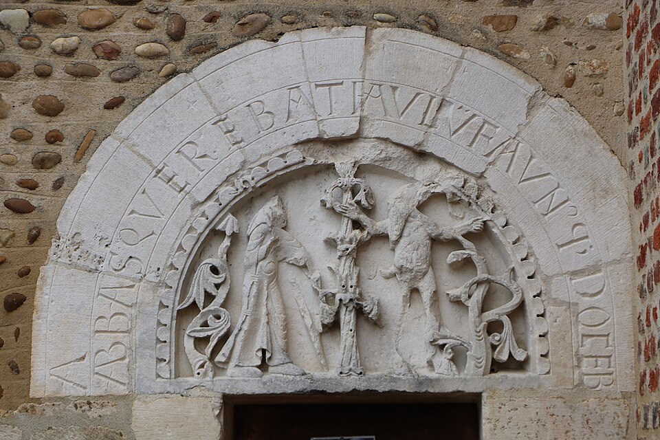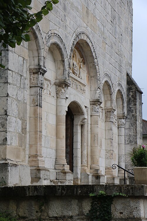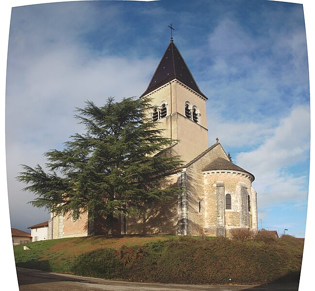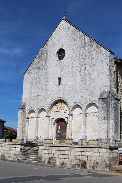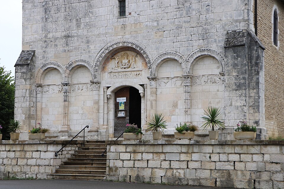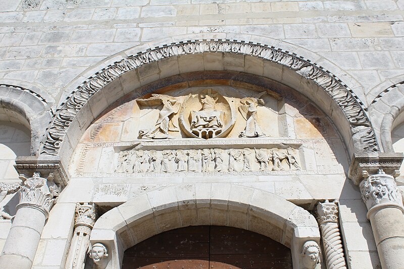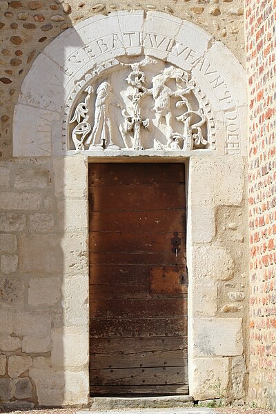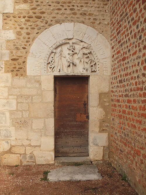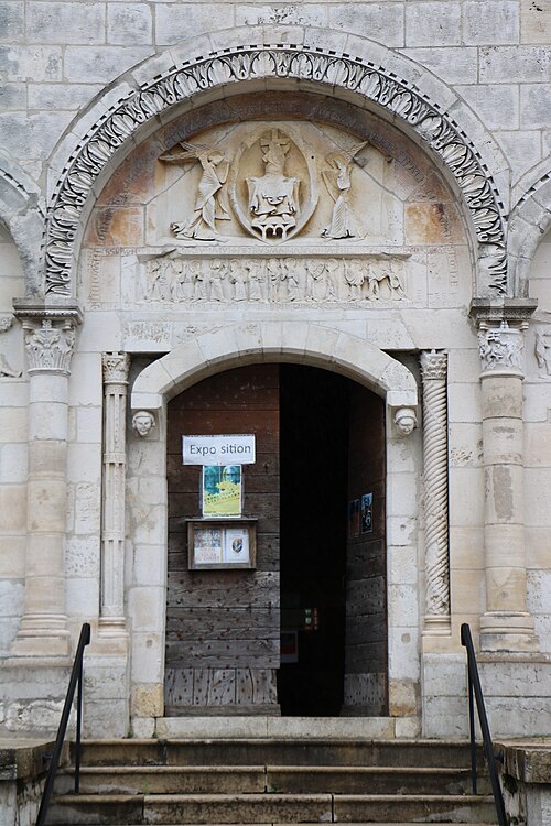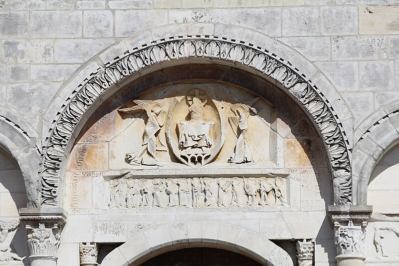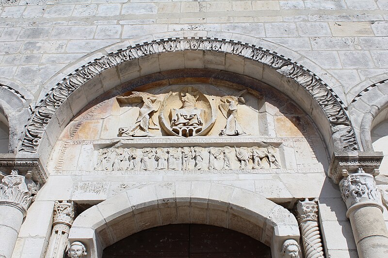 L'église Saint‑Paul, de type basilical, se situe à Saint‑Paul‑de‑Varax dans l'Ain. Construite entre 1103 et 1150 et souvent remaniée, l'édifice — classé au titre des monuments historiques en 1908, à l'exception du clocher — a vu son clocher d'origine détruit à la Révolution par les soldats du préfet Albite puis reconstruit au XIXe siècle. La façade occidentale en pierre blanche contraste avec le reste du bâtiment ; le portail en plein cintre et les arcades voisines sont ornés de colonnes, chapiteaux et archivoltes sculptés de motifs romans. Le tympan, dont l'arc est plus large que ceux des autres baies, porte une frise où figurent Marie et les apôtres ainsi qu'une mandorle montrant l'Ascension du Christ encadrée par deux anges ; on y lit aussi une inscription dédicatoire en latin honorant Jésus‑Christ, la Vierge, saint Paul et tous les saints de Dieu. D'autres frises racontent des épisodes de la vie de Paul, notamment sa conversion, la chute de Simon le magicien et sa mise à mort par Néron. L'intérieur présente une nef aux murs en galets disposés en arête‑de‑poisson ; une petite porte sud cintrée ouvre sur un tympan sculpté et les fonds baptismaux reposent sur un chapiteau romain. Les chapelles latérales, non placées en vis‑à‑vis, sont bâties en briques rouges locales appelées "carrons", tandis que le chevet et l'abside mêlent galets et pierres blanches.