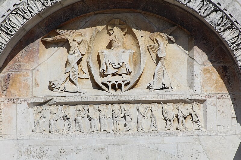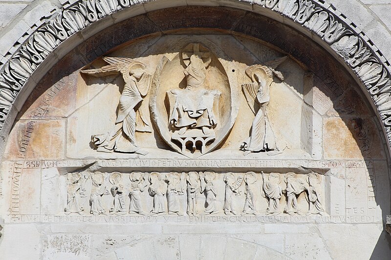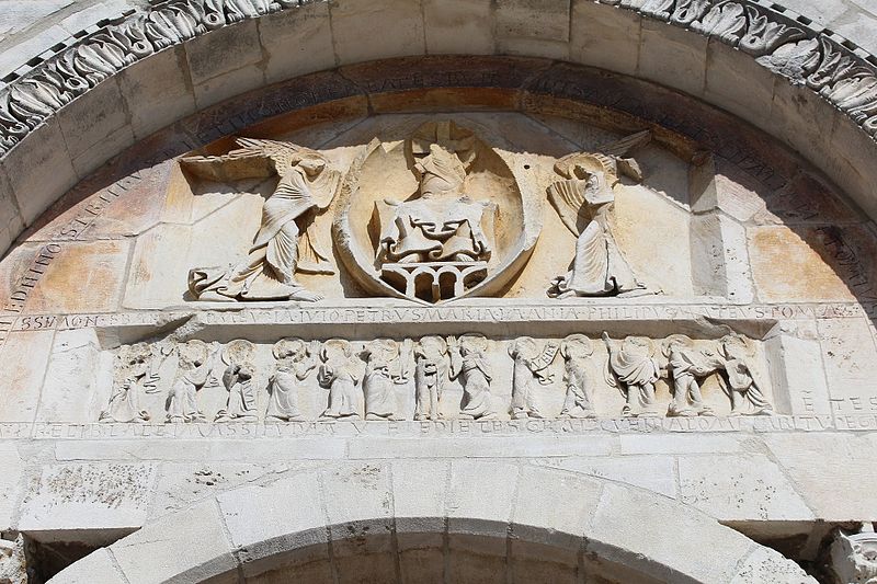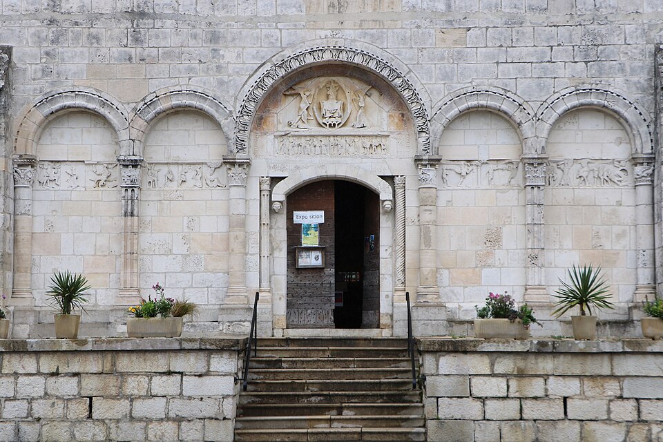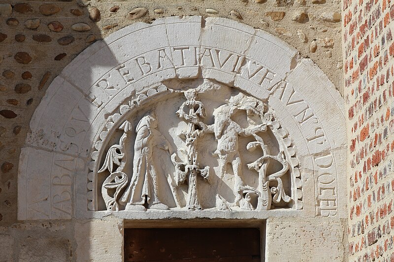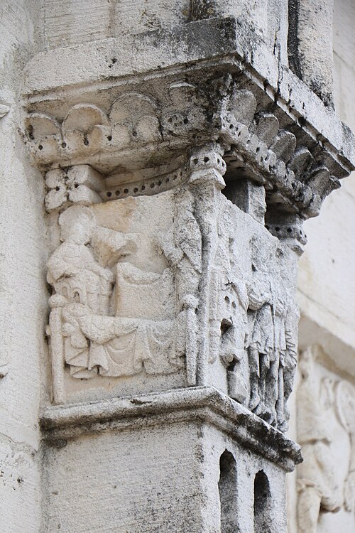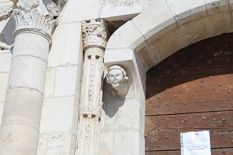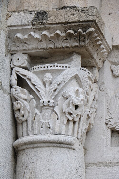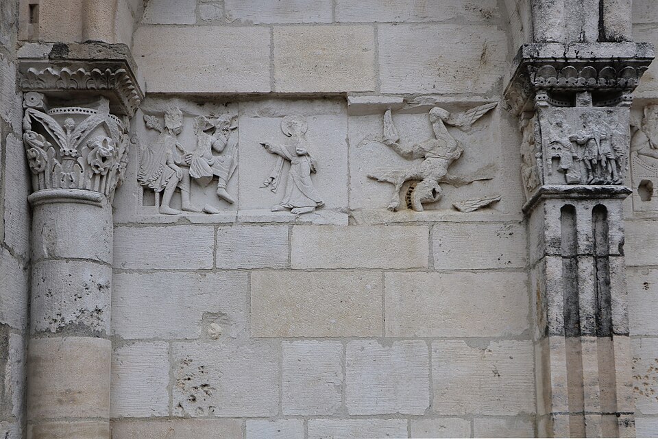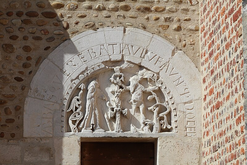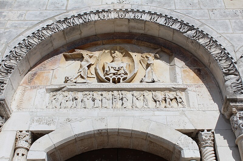L'église Saint‑Paul, de type basilical, se situe à Saint‑Paul‑de‑Varax dans l'Ain. Construite entre 1103 et 1150 et souvent remaniée, l'édifice — classé au titre des monuments historiques en 1908, à l'exception du clocher — a vu son clocher d'origine détruit à la Révolution par les soldats du préfet Albite puis reconstruit au XIXe siècle. La façade occidentale en pierre blanche contraste avec le reste du bâtiment ; le portail en plein cintre et les arcades voisines sont ornés de colonnes, chapiteaux et archivoltes sculptés de motifs romans. Le tympan, dont l'arc est plus large que ceux des autres baies, porte une frise où figurent Marie et les apôtres ainsi qu'une mandorle montrant l'Ascension du Christ encadrée par deux anges ; on y lit aussi une inscription dédicatoire en latin honorant Jésus‑Christ, la Vierge, saint Paul et tous les saints de Dieu. D'autres frises racontent des épisodes de la vie de Paul, notamment sa conversion, la chute de Simon le magicien et sa mise à mort par Néron. L'intérieur présente une nef aux murs en galets disposés en arête‑de‑poisson ; une petite porte sud cintrée ouvre sur un tympan sculpté et les fonds baptismaux reposent sur un chapiteau romain. Les chapelles latérales, non placées en vis‑à‑vis, sont bâties en briques rouges locales appelées "carrons", tandis que le chevet et l'abside mêlent galets et pierres blanches.