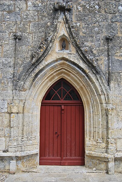 La porte présente un linteau décoré de cercles entrelacés et un tympan gravé d'un chrisme.