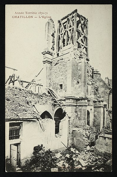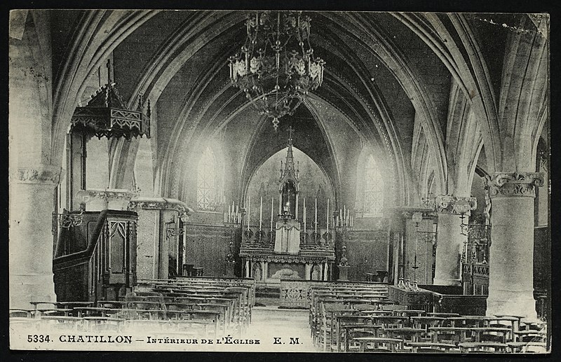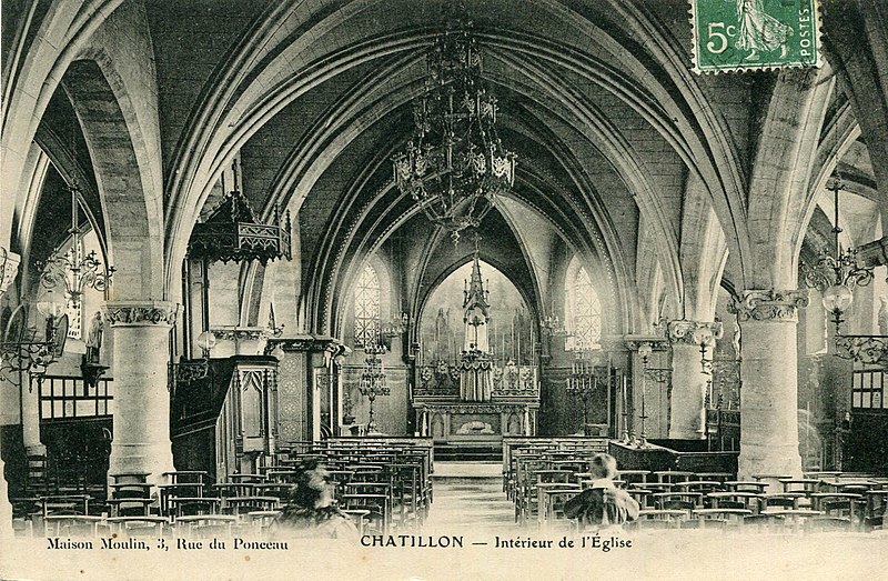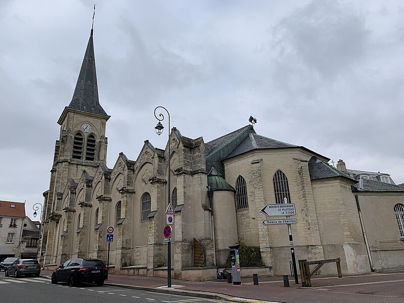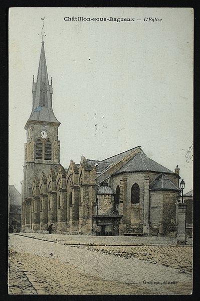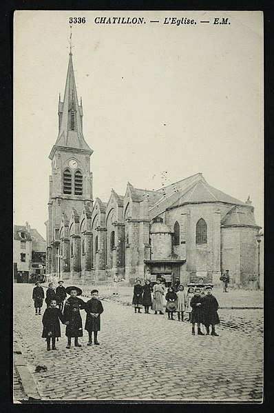 L'église Saint-Philippe-et-Saint-Jacques, située rue de Bagneux au centre de l'ancien village de Châtillon (Hauts-de-Seine), remplace une chapelle médiévale dédiée à saint Eutrope, peut‑être du XIVe siècle. La construction de l'édifice actuel a commencé au XVe siècle et s'est achevée vers 1530 ; il a été consacré le 17 juillet 1541 par Charles Boucher, évêque in partibus de Mégare. Le bas-côté droit a été restauré en 1610 et, en 1681, deux cloches offertes par Colbert furent bénies puis fondues pendant la Révolution. L'église a fait l'objet de réparations ponctuelles aux XVIIIe et XIXe siècles (1731, 1740, 1819, 1828-1832) ; parmi ces interventions les contreforts furent refaits, une nouvelle cloche acquise et le lambris du chœur supprimé. Entre 1843 et 1846, l'architecte Claude Naissant et l'entrepreneur E. Boncorps procédèrent à un agrandissement : démolition de l'ancien chevet, adjonction d'une travée à la nef et construction d'un nouveau clocher-porche de style Renaissance au sud‑ouest. En 1866 Naissant fit ériger un nouveau presbytère et une sacristie. Lors de la guerre de 1870 l'édifice fut partiellement détruit, entraînant la chute du clocher ; les travaux de reconstruction comprirent le rehaussement des contreforts, l'agrandissement des ouvertures, la pose de gargouilles et la reconstruction du clocher sur le côté sud. Les voûtes furent restaurées à la fin du XIXe siècle ; la tribune d'orgue fut installée en 1902, les toitures refaites par l'architecte L. Mériot et le clocher restauré en 1904. Le clocher actuel abrite une cloche dite "Madeleine" de 1832, provenant de l'ancien clocher détruit en 1870. L'église est inscrite au titre des monuments historiques depuis le 19 octobre 1928.