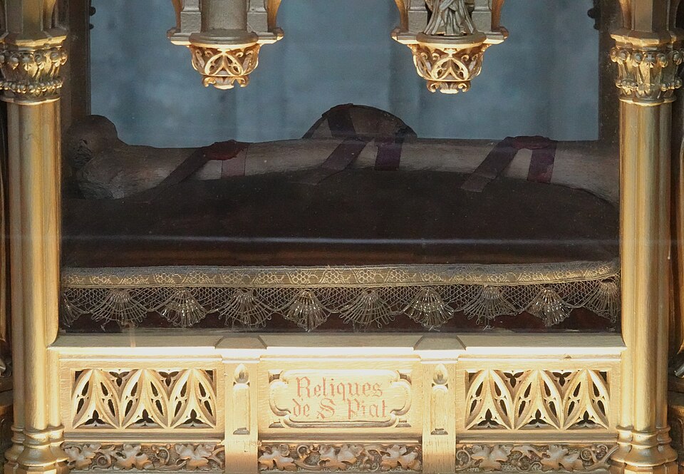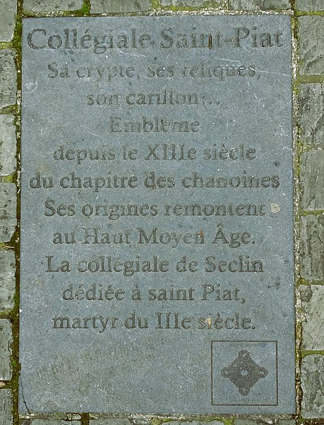 Sur le plan architectural, les colonnes du transept conservent des vestiges de l'époque romane, le chœur est modifié entre 1705 et 1725, et le déambulatoire reconstruit au XIIIe siècle dessert treize chapelles; la chapelle dite d'hiver, ancienne salle capitulaire située entre la sacristie et le transept sud, remonte au XIVe siècle. La crypte romane du VIIe siècle abrite le sarcophage de saint Piat, d'origine gallo-romaine selon certaines hypothèses, couvert d'une dalle de pierre bleue de Tournai du XIIIe siècle figurant le saint tenant sa calotte crânienne tandis que la main de Dieu le bénit. Au fond de la crypte, l'autel aménagé au XVIIIe siècle est encadré d'une armoire et d'une piscine liturgique creusées dans le mur, et un puits de plus de 11 mètres, creusé lors de la construction de la crypte, est réputé pour ses eaux guérissant les maux de tête; les murs portent des graffitis témoignant de l'histoire ancienne de la collégiale.