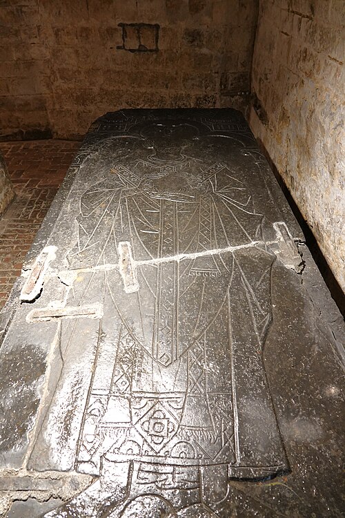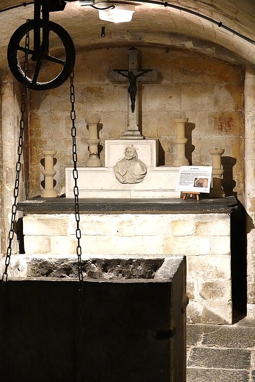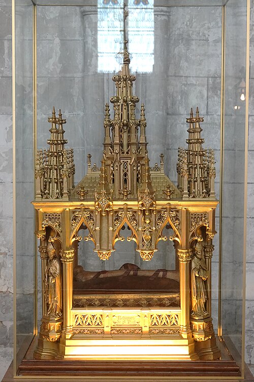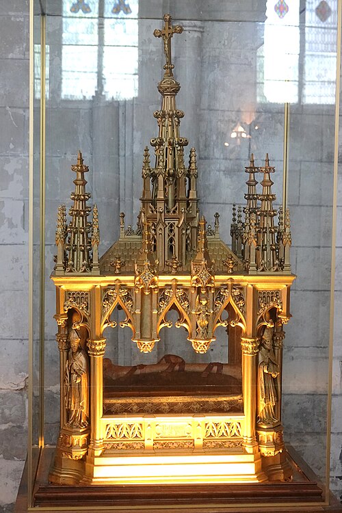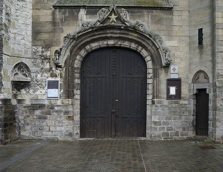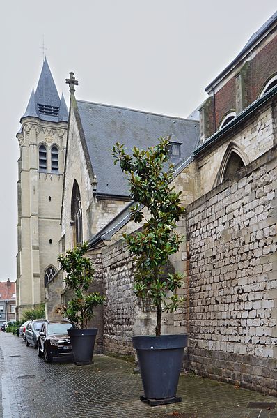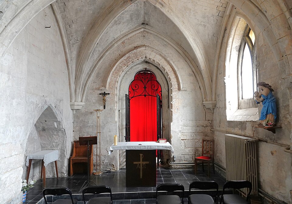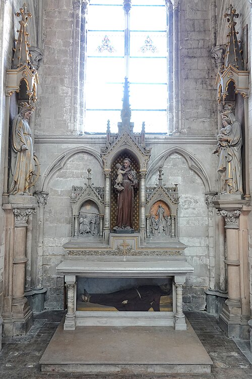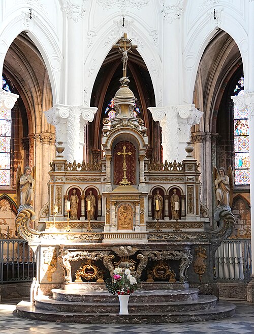 La salle capitulaire, accessible depuis le déambulatoire sud et datée du XVe siècle, conserve des voûtes et un fenestrage gothiques; elle servait aux réunions du chapitre et accueille aujourd'hui les messes en semaine. Le maître-autel en marbre, œuvre de Mathieu Jonniau datée de 1763, est inscrit aux inventaires départementaux et complété au XIXe siècle par un retable, un tabernacle et deux anges sculptés par Modeste Verlinden. Sous la table du maître-autel sont conservées des reliques, notamment celles de saint Fidentius et de sainte Dieudonnée, ainsi qu'un reliquaire central contenant des reliques non identifiées, tandis que cinq grandes toiles à l'huile, probablement du XVIIIe siècle et représentant le Christ et les quatre évangélistes, surmontent et entourent l'autel; ces toiles sont aujourd'hui encrassées et détériorées, une collecte étant en cours pour leur restauration.