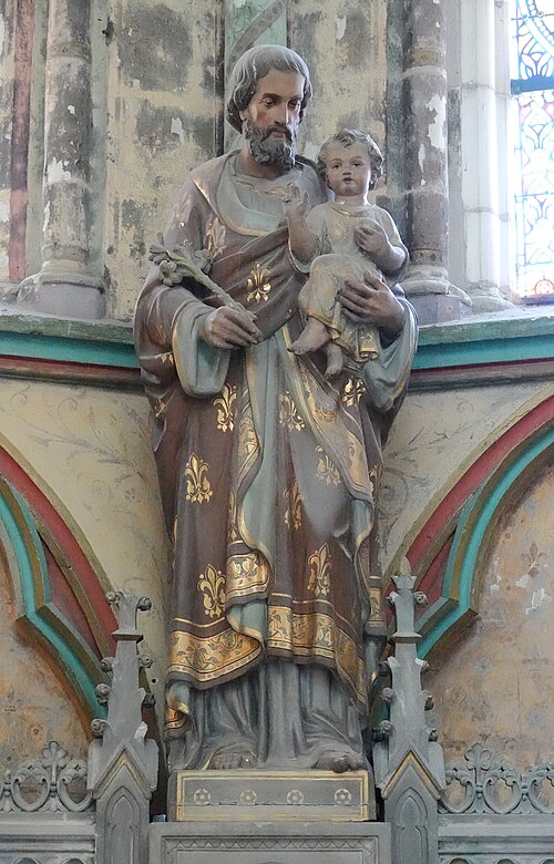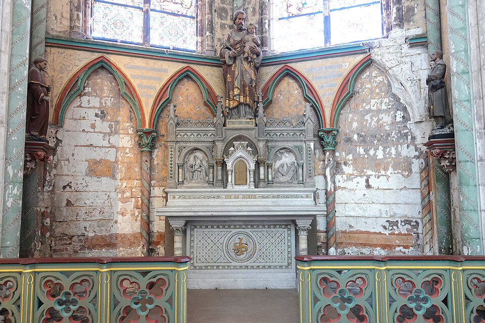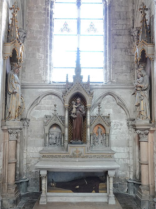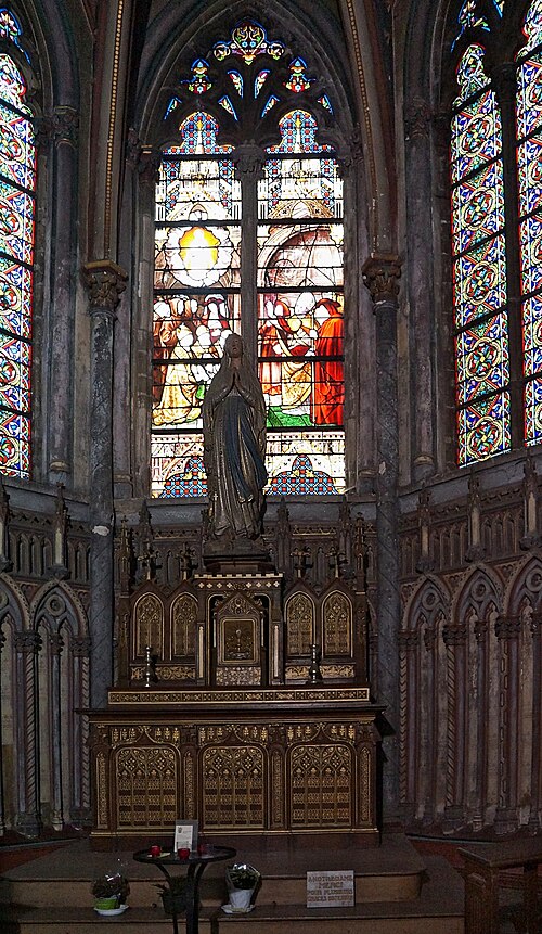 La chapelle Saint-Antoine-de-Padoue, au nord du déambulatoire, présente un autel réalisé par Verlinden avec un soubassement en marbre veiné et un retable en pierre blanche; ses reliefs représentent le miracle de la mule et saint Antoine secourant les affamés, et le tombeau de l'autel renferme un gisant en cire vêtu d'habits; la chapelle accueille également des statues de série, dont une Vierge à l'Enfant de la Sainterie de Vendeuvre et une sainte Catherine d'origine inconnue. La chapelle Saint-Joseph, au sud, abrite un autel néogothique en marbre et pierre attribué à Verlinden, décoré du monogramme de saint Joseph et de reliefs représentant le mariage de Marie et Joseph et la mort de saint Joseph; l'autel est aujourd'hui en mauvais état, les murs portent des peintures néogothiques fortement altérées et la chapelle conserve des statues en plâtre de saint Joseph de Cupertino et de saint Benoît-Joseph Labre. Les vitraux de la chapelle Saint-Joseph, réalisés par Louis Koch, évoquent la vie de Joseph et de Marie: la baie gauche illustre l'Adoration des Mages, l'Adoration des Bergers, le Mariage de Marie et Joseph et l'annonce faite à Joseph de ne pas répudier Marie, tandis que la baie droite montre l'Assomption, le Couronnement de la Vierge, le songe de Joseph précédant la fuite en Égypte et l'apparition de Notre-Dame de Lourdes.