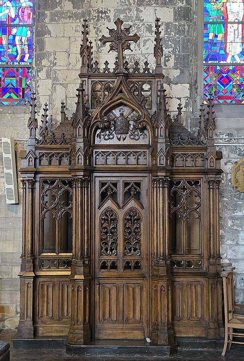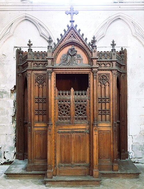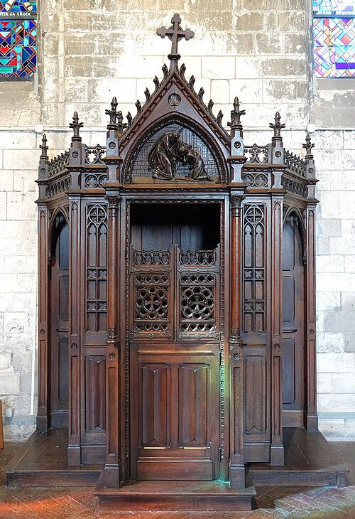 L'église possède cinq confessionnaux en chêne: trois réalisés par Modeste Verlinden entre 1874 et 1909 avec des tympans figurant Marie-Madeleine pénitente, le Bon Pasteur et le retour du Fils prodigue, et deux plus grands, datés de la fin du XIXe ou du début du XXe siècle, ornés des clés de saint Pierre et de la tiare papale. Les chapelles du déambulatoire, réaménagées probablement dans le dernier quart du XIXe siècle, reçoivent un mobilier néogothique et des peintures, mais souffrent de fortes dégradations dues à l'humidité.