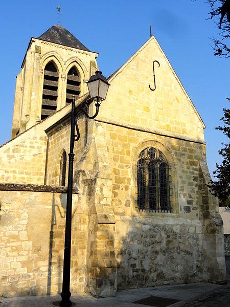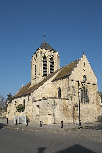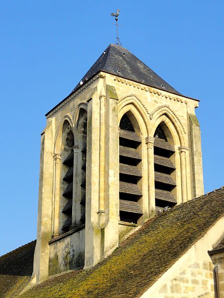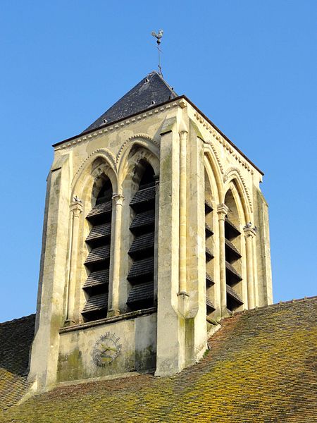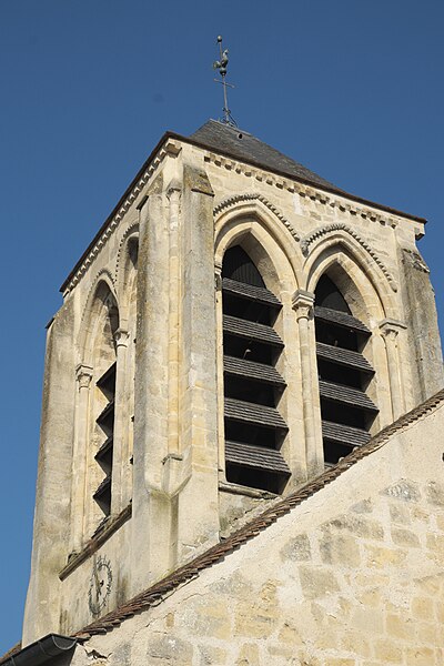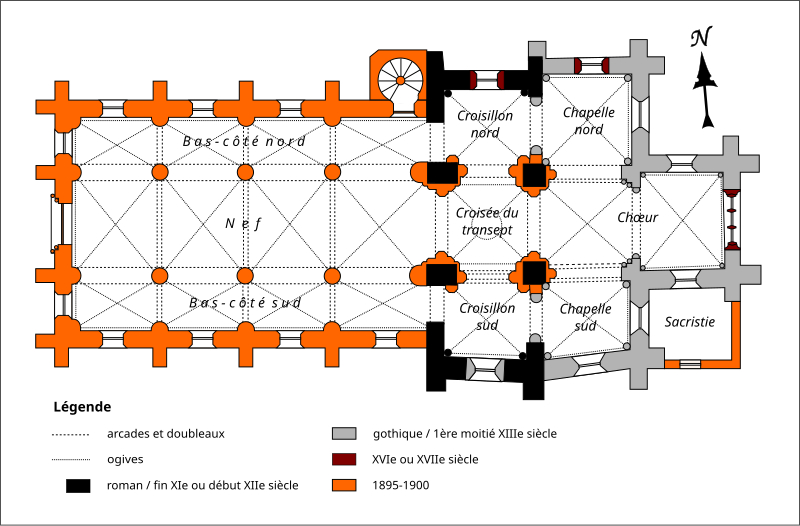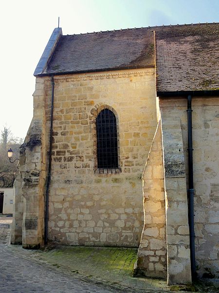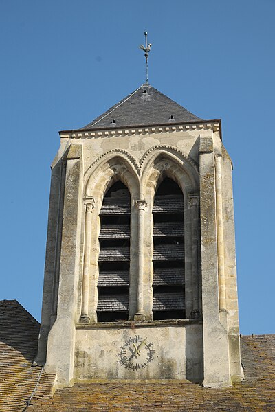 À l'extérieur le clocher est l'élément le plus remarquable : haut et élancé, il ne comporte qu'un seul étage de beffroi ouvert par deux hautes baies abat-son en tiers-point par face, inscrites dans des archivoltes portées par colonnettes et décorées d'un boudin et d'un cordon de têtes de clous, le tout couronné d'une corniche de modillons cubiques. Les façades de l'église sont sobres ; seuls le pignon occidental et le pignon du chevet se détachent, les croisillons et les chapelles étant couverts par des toits en appentis en continuité avec la toiture centrale. Des contreforts à ressauts, caractéristiques du gothique primitif, rythment les élévations et sont plus saillants au chevet où il n'y a pas de bas-côtés. La baie du chevet, remaniée à la Renaissance, est la seule fenêtre de l'église à disposer d'un remplage en plein cintre surmonté d'un oculus, tandis que plusieurs baies en arc brisé et quelques lancettes conservent des profils d'origine ou de remaniements anciens. Le portail occidental présente une double archivolte en tiers-point reposant sur deux paires de colonnettes à chapiteaux.