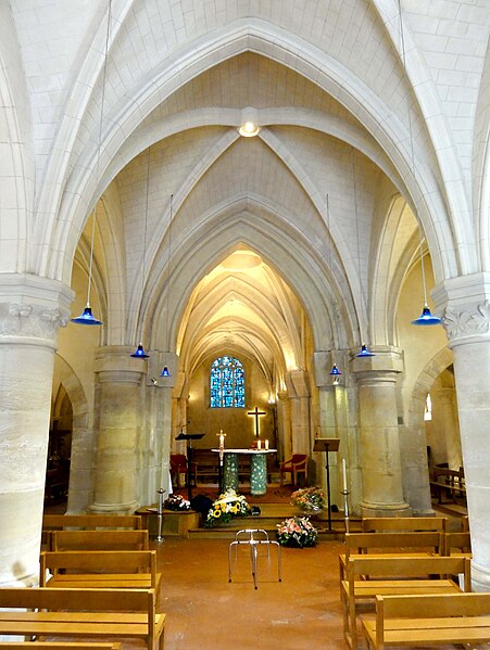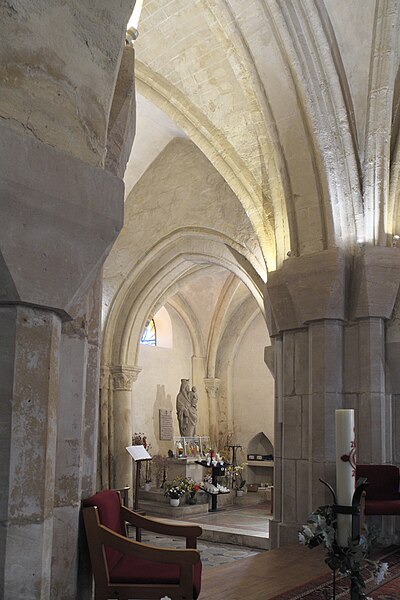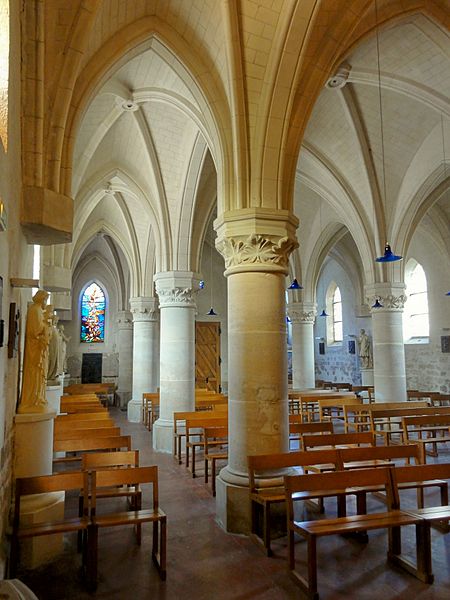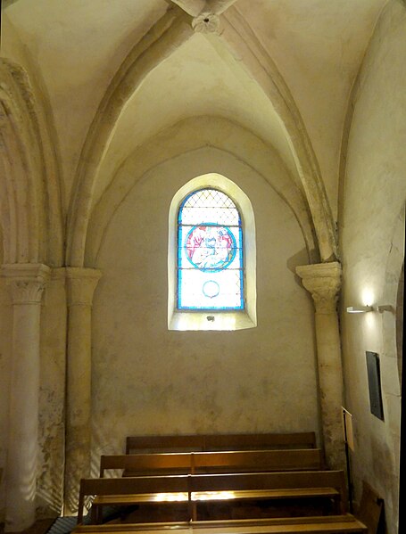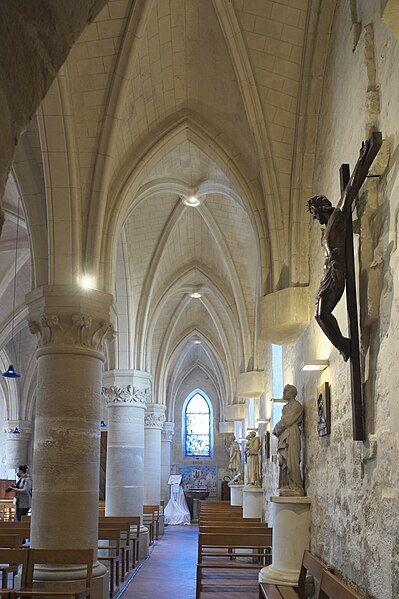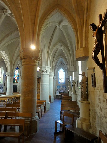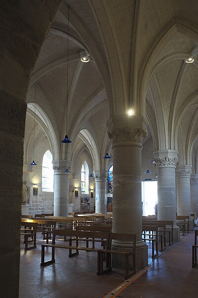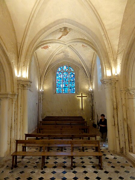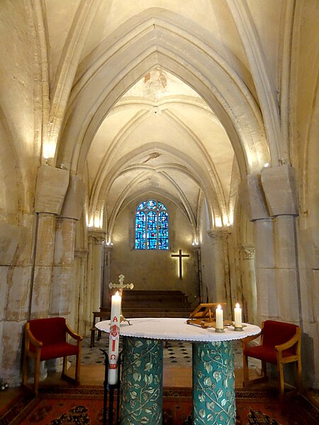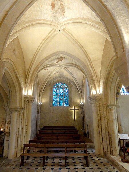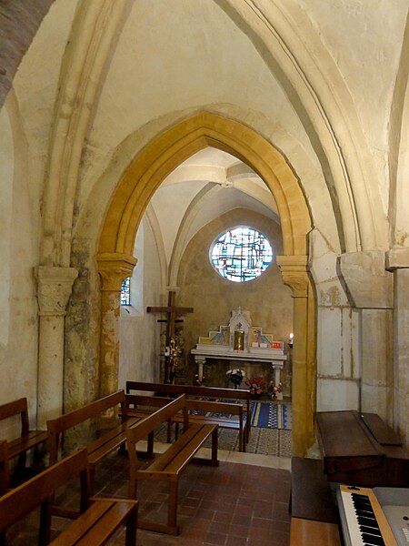 D'un point de vue architectural, l'édifice présente peu de singularités globales mais les parties anciennes ont un intérêt archéologique marqué. La croisée du transept et les deux travées du chœur forment un vaisseau central voûté à la même hauteur, soutenu par des doubleaux dont les chapiteaux sont souvent simples et non sculptés, vestiges des remaniements successifs. La voûte de la croisée, refaite au XIIIe siècle, est perce d'un trou de cloches et la travée est aujourd'hui suréquipée pour abriter le maître-autel sur une petite tribune. La première travée du chœur est dépourvue de formerets, tandis que la seconde conserve des peintures murales sous les voûtes représentant le tétramorphe ; ces fresques, dans lesquelles le taureau de saint Luc est remplacé par un cheval, ont été découvertes et restaurées en 2008. Le croisillon nord conserve les derniers chapiteaux romans sur place, dont un sculpté d'une fleur de lys et un autre représentant deux masques humains encadrés de palmettes ; ces éléments soutiennent une voûte de la fin du XIIe siècle dont les nervures sont composées de deux tores séparés par une arête. Le croisillon sud se distingue par une arcade plus pointue ornée d'une polychromie remise au jour en 2008 et par des chapiteaux gothiques sculptés de feuilles plates. Les deux chapelles latérales, voûtées plus basses que les croisillons, sont dévolues à saint Jacques au nord et à la Vierge au sud ; la chapelle de la Vierge abrite une Vierge à l'Enfant du XIVe siècle, haute de 50 cm, seul élément de mobilier classé, ainsi que deux pierres tombales à effigie relativement bien conservées.