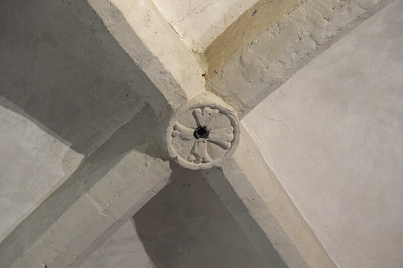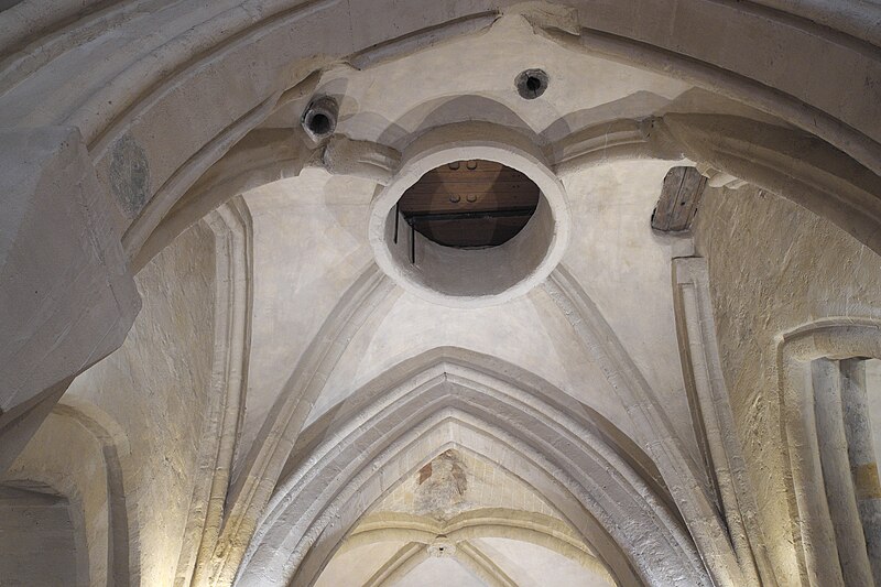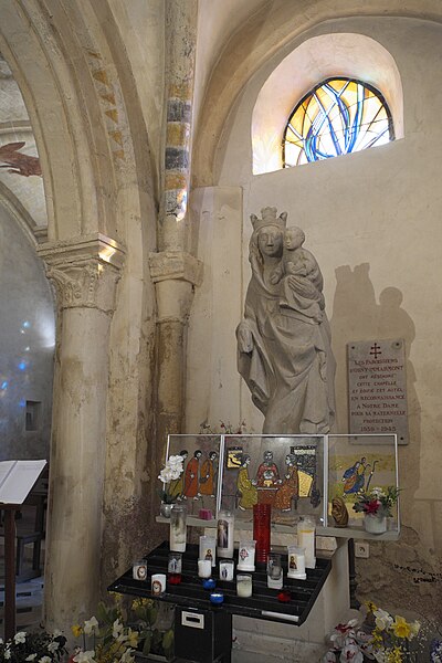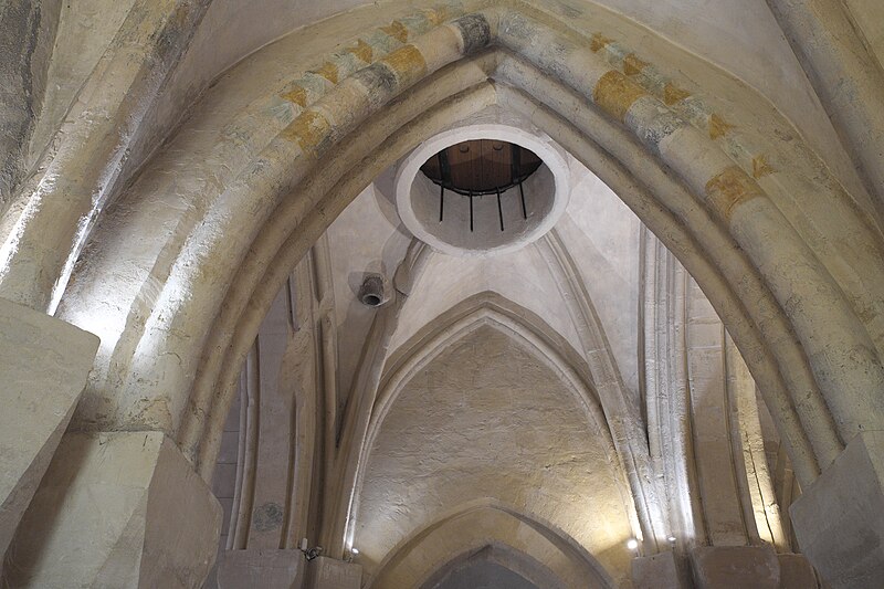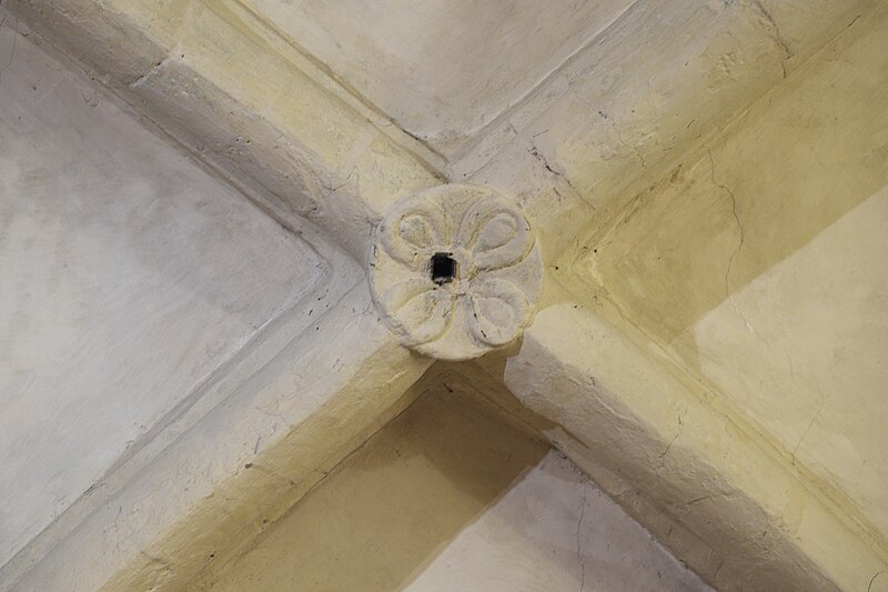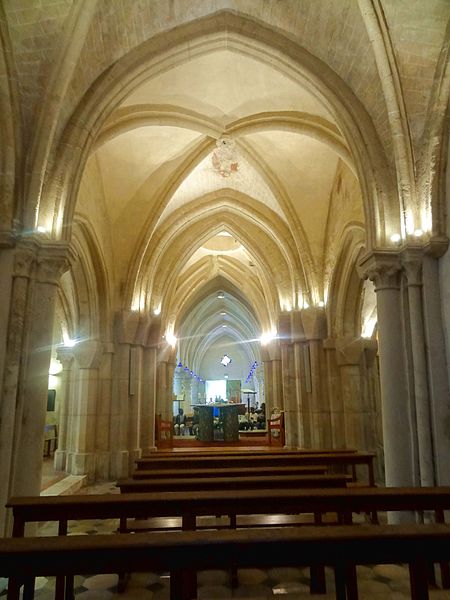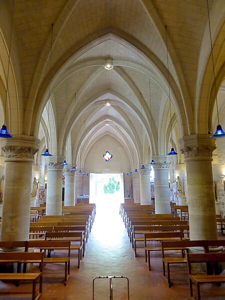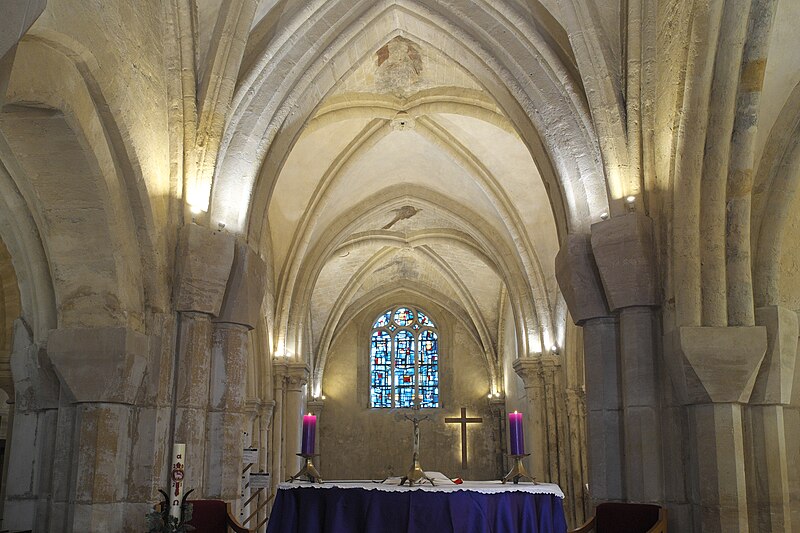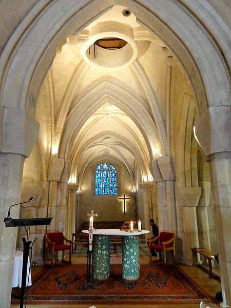 D'un point de vue architectural, l'édifice présente peu de singularités globales mais les parties anciennes ont un intérêt archéologique marqué. La croisée du transept et les deux travées du chœur forment un vaisseau central voûté à la même hauteur, soutenu par des doubleaux dont les chapiteaux sont souvent simples et non sculptés, vestiges des remaniements successifs. La voûte de la croisée, refaite au XIIIe siècle, est perce d'un trou de cloches et la travée est aujourd'hui suréquipée pour abriter le maître-autel sur une petite tribune. La première travée du chœur est dépourvue de formerets, tandis que la seconde conserve des peintures murales sous les voûtes représentant le tétramorphe ; ces fresques, dans lesquelles le taureau de saint Luc est remplacé par un cheval, ont été découvertes et restaurées en 2008. Le croisillon nord conserve les derniers chapiteaux romans sur place, dont un sculpté d'une fleur de lys et un autre représentant deux masques humains encadrés de palmettes ; ces éléments soutiennent une voûte de la fin du XIIe siècle dont les nervures sont composées de deux tores séparés par une arête. Le croisillon sud se distingue par une arcade plus pointue ornée d'une polychromie remise au jour en 2008 et par des chapiteaux gothiques sculptés de feuilles plates. Les deux chapelles latérales, voûtées plus basses que les croisillons, sont dévolues à saint Jacques au nord et à la Vierge au sud ; la chapelle de la Vierge abrite une Vierge à l'Enfant du XIVe siècle, haute de 50 cm, seul élément de mobilier classé, ainsi que deux pierres tombales à effigie relativement bien conservées.