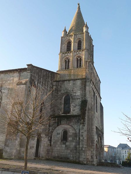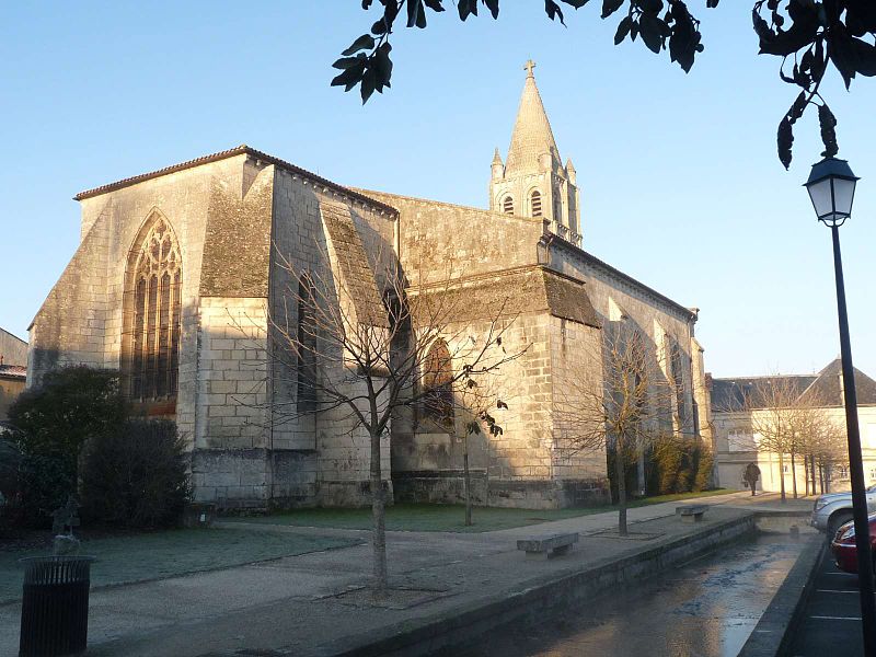 Du XIIe siècle subsistent le clocher et le porche occidental. Au-dessus de ce porche, une galerie aveugle composée d'arcatures caractéristiques de l'architecture charentaise romane masque la partie basse du clocher. Au XVe siècle, l'ancienne église fut démolie et un nouvel édifice élevé, comprenant une nef flanquée de bas-côtés très élevés et un chœur à chevet plat, le tout couvert par une toiture. La nef et les bas-côtés furent démolis puis reconstruits en 1863, mais les murs extérieurs conservent des élévations du XVe siècle. La façade occidentale présente un portail roman à trois rangs de claveaux, encadré de deux niches en plein cintre, et sa partie basse est couronnée d'une galerie de six arcatures. Au-dessus se détache un clocher formé de deux étages carrés, chacun percé de deux ouvertures par face ; le second étage est surmonté d'une flèche conique assortie de clochetons cylindriques aux angles. Selon P. Dubourg-Noves, le mur ouest du clocher-porche remonterait au début du XIe siècle et le clocher-porche aurait été principalement édifié dans la première moitié du XIIe siècle, pour être doté d'un portail et d'une arcature haute à la fin du XIIe siècle ou au début du XIIIe. L'édifice fut en grande partie détruit par les Protestants en 1562, sommairement réparé vers 1600, puis restauré et, pour la nef et le chœur, presque totalement reconstruit entre 1865 et 1868.