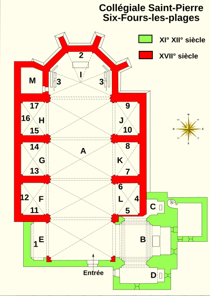 La partie romane, au sud de l'édifice actuel, date du XIIe siècle ; derrière sa façade ouest se trouve une citerne destinée à recueillir les eaux pluviales, le site étant dépourvu de source, et il ne s'agit pas d'un sanctuaire primitif du Ve siècle. Cette section mesure 25 m de long sur 15,90 m de large ; elle est construite en petit appareil régulier en calcaire d'Évenos, avec une nef de 6,30 m de large voûtée en berceau plein cintre et un chevet plat ; l'entrée principale au sud ouvre sous la tribune qui supporte l'orgue. La chapelle Sainte-Catherine, ancien collatéral droit et dite aussi chapelle de l'Enfant Jésus, abrite un autel primitif et une pierre aux armes de Jean Denans, notaire royal à Six-Fours de 1660 à 1714 et auteur d'un manuscrit conservé aux archives départementales du Var. La chapelle Sainte-Madeleine, ancien collatéral nord, possède un autel identique surmonté d'une statue de sainte Madeleine agenouillée.