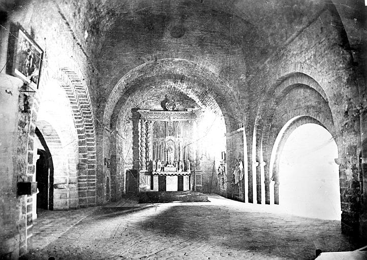 Dans le sous-sol du chœur, des fouilles menées en 1965 ont mis au jour un mur semi-circulaire interprété initialement comme une abside primitive du Ve siècle, interprétation aujourd'hui rejetée par les archéologues qui y voient une semelle de fondation liée à la pente du terrain. On y observe également un autel monolithique en calcaire bleu de 2,08 m sur 0,96 m sur 0,20 m, posé sur un bloc de 1,50 m de haut et pesant 1 250 kg ; son attribution au Ve siècle reste sans preuve. Une statue en bois de saint Paul datée du XVIe siècle occupe une fenêtre obstruée du chevet et, de part et d'autre de l'autel, deux alvéoles recevaient autrefois le pain et le vin et la sainte eucharistie pour les absents.