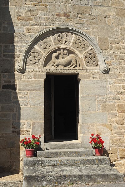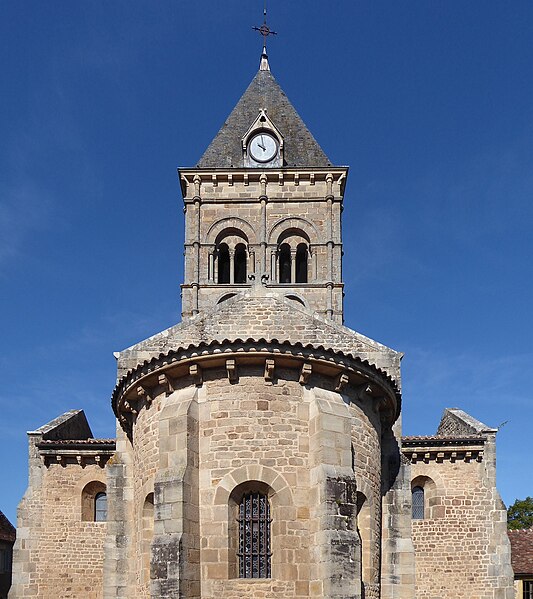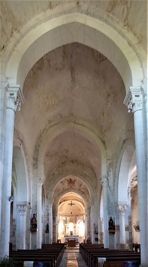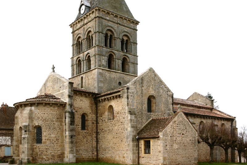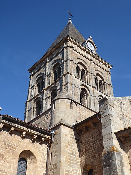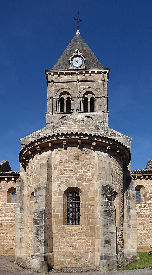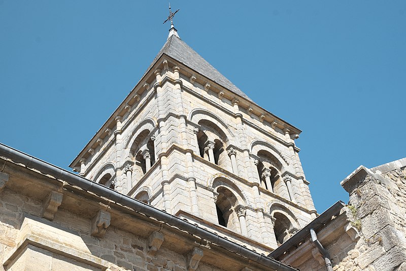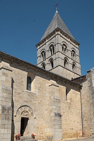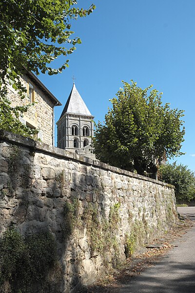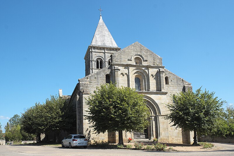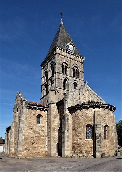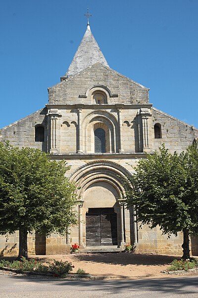 La façade occidentale tripartite présente un avant-corps central en saillie et des travées latérales en retrait ; la travée centrale est organisée en trois registres. Le registre inférieur montre un portail cintré encadré de deux colonnes et muni d'une archivolte à plusieurs rouleaux dont l'extrados porte une frise en damier. Le registre médian est encadré de pilastres cannelés, divisé en trois par des colonnes engagées, et ouvre par une baie cintrée à double ébrasement tandis que les parties latérales sont ornées de bandes lombardes. Le registre supérieur est percé d'une petite baie cintrée surmontée d'un larmier ; les travées latérales, soutenues par de puissants contreforts, n'offrent d'ornement que deux baies cintrées chacune. Sur la façade méridionale, le portail sud se distingue par ses piédroits harpés, un fin linteau sculpté, un tympan figurant l'agneau pascal, une archivolte à cinq fleurons et un larmier. La croisée du transept porte un clocher roman carré dont chaque face présente deux baies cintrées simples à l'avant-dernier étage et, au dernier étage, deux paires de baies géminées séparées par des colonnettes doubles. À l'est, le chevet se compose d'une abside semi-circulaire rythmée par des contreforts puissants ; la travée de chœur et les bras du transept sont mis en valeur par des pignons surhaussés.