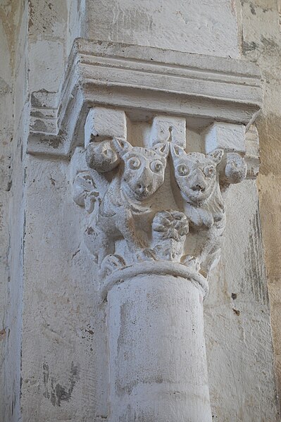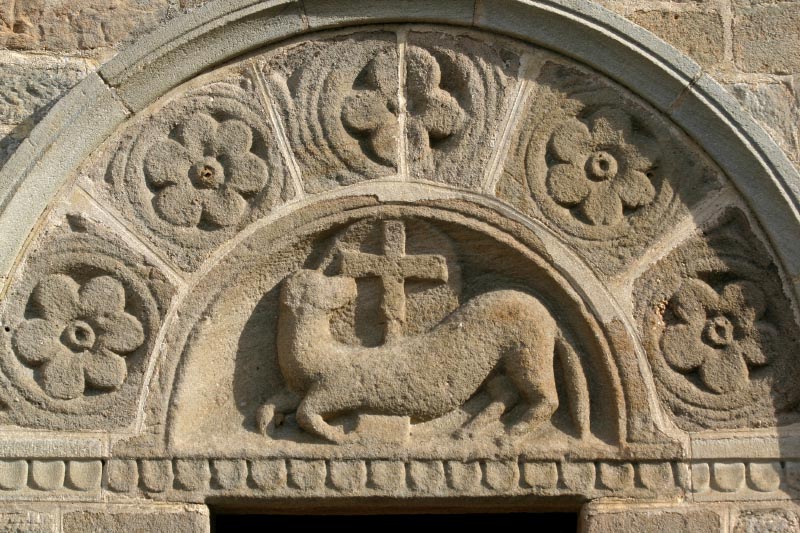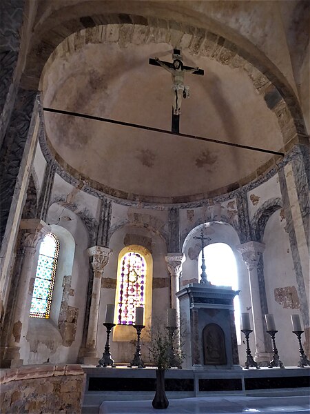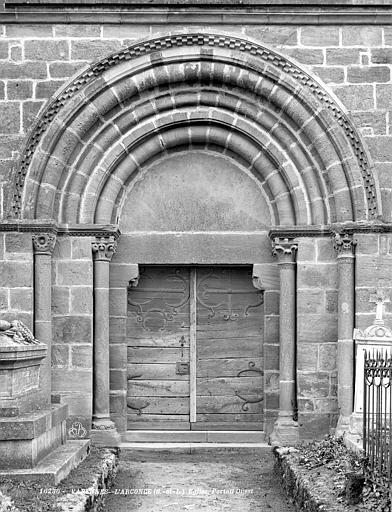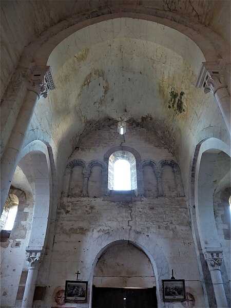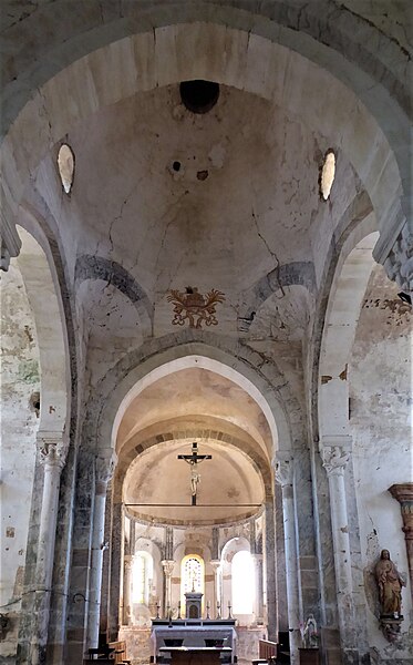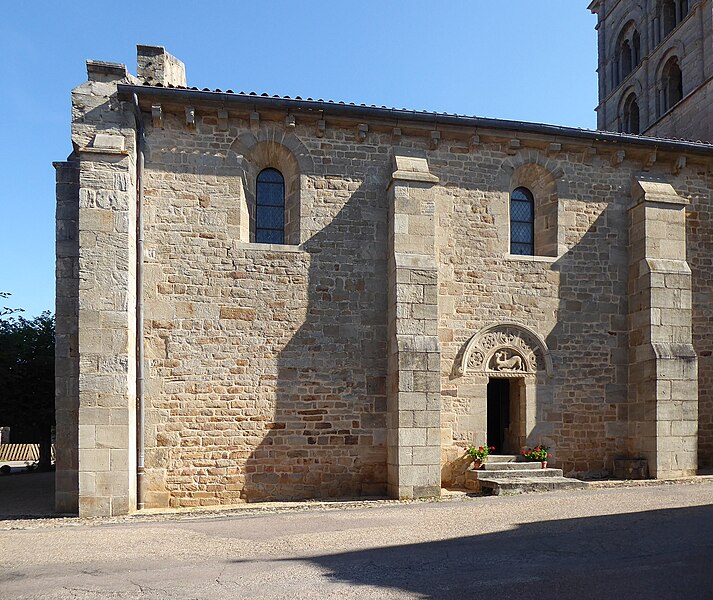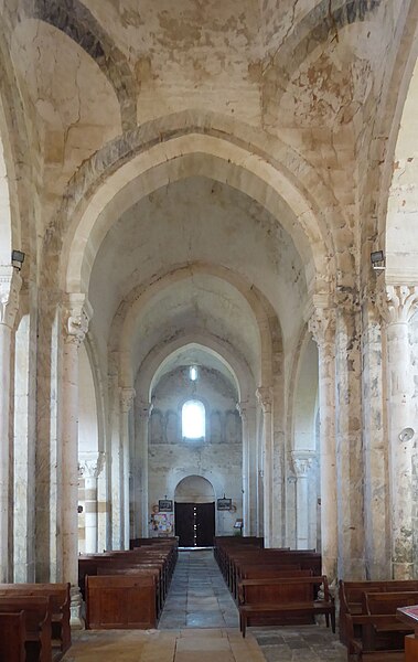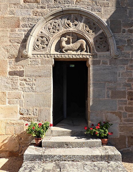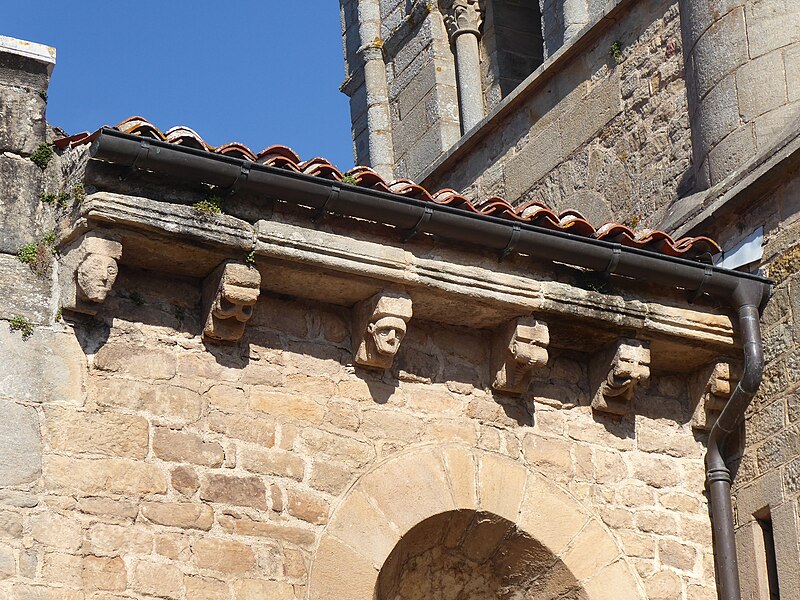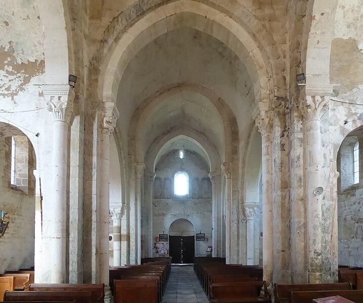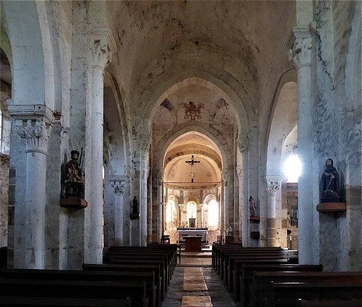 La façade occidentale tripartite présente un avant-corps central en saillie et des travées latérales en retrait ; la travée centrale est organisée en trois registres. Le registre inférieur montre un portail cintré encadré de deux colonnes et muni d'une archivolte à plusieurs rouleaux dont l'extrados porte une frise en damier. Le registre médian est encadré de pilastres cannelés, divisé en trois par des colonnes engagées, et ouvre par une baie cintrée à double ébrasement tandis que les parties latérales sont ornées de bandes lombardes. Le registre supérieur est percé d'une petite baie cintrée surmontée d'un larmier ; les travées latérales, soutenues par de puissants contreforts, n'offrent d'ornement que deux baies cintrées chacune. Sur la façade méridionale, le portail sud se distingue par ses piédroits harpés, un fin linteau sculpté, un tympan figurant l'agneau pascal, une archivolte à cinq fleurons et un larmier. La croisée du transept porte un clocher roman carré dont chaque face présente deux baies cintrées simples à l'avant-dernier étage et, au dernier étage, deux paires de baies géminées séparées par des colonnettes doubles. À l'est, le chevet se compose d'une abside semi-circulaire rythmée par des contreforts puissants ; la travée de chœur et les bras du transept sont mis en valeur par des pignons surhaussés.