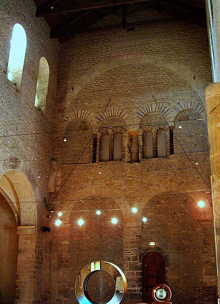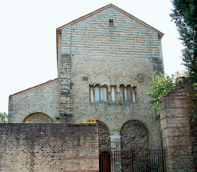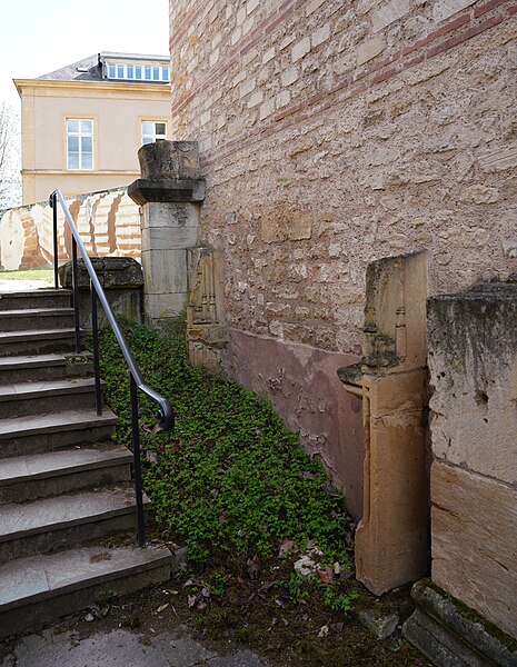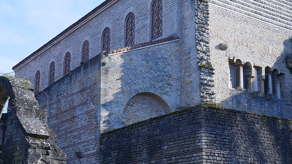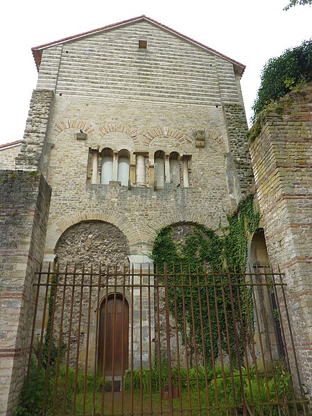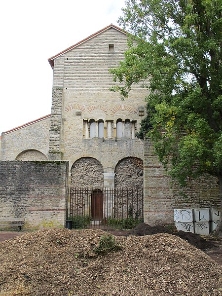 L’ancienne abbaye Saint-Pierre, dite Saint-Pierre-aux-Nonnains, est un édifice de Metz dont l’ossature provient d’un bâtiment gallo-romain du IVe siècle, identifié comme palestre d’un ensemble thermal ou basilique civile. Converti en église abbatiale avant le VIIe siècle, il accueillait une communauté bénédictine de femmes dédiée à saint Pierre. Les murs conservent des chaînages de briques séparant des assises de pierres taillées, selon la technique de l’opus mixtum. La salle principale, à une seule nef, mesure extérieurement 36,8 × 20 m ; à l’est elle comporte une abside extérieurement polygonale et intérieurement semi-circulaire, large de 9,85 m et profonde de 5,1 m, et l’accès se fait à l’ouest par une porte monumentale. La nef a été remaniée vers l’an 1000 dans un style roman lié à l’époque ottonienne, et des voûtes gothiques y ont été élevées aux XVe et XVIe siècles. Un chancel en pierre, aujourd’hui conservé aux musées de Metz, sépare le chœur de la nef ; il est constitué de panneaux et de piliers en calcaire assemblés par tenons et mortaises et présente des décors réalisés en semi-méplat. Les motifs du chancel associent images paléochrétiennes et influences « barbares » : compositions végétales (arbre de vie, palmettes, rinceaux), décors géométriques et entrelacs animaliers principalement serpents, ainsi qu’une représentation du Christ tenant un disque dont l’interprétation varie entre bénédiction, symbole du pouvoir, Eucharistie ou fibule. Le site a subi d’importantes transformations militaires : lors du siège de Metz en 1552 une partie de l’ensemble fut rasée, puis à partir de 1556 il fut converti en entrepôt et caserne, usage qui perdura jusqu’au XXe siècle. L’église fut classée monument historique en 1909 et les vestiges du cloître en 1932 ; la municipalité accepta la cession de bâtiments par l’armée en 1946 et des travaux de restauration ont été engagés à partir des années 1970 pour adapter l’édifice à une salle de concerts et d’expositions. Les fouilles et études ont été menées par plusieurs équipes : E. Knitterscheid en 1897-1898, Ludwig Reusch en 1942-1944, puis des campagnes françaises par J.-J. Hatt, C. Heitz et R. Will dans les années 1959-1977 ; elles ont mis au jour l’édifice romain, des aménagements palatins et balnéaires ainsi que des phases médiévales et militaires. Des briques estampillées portant des inscriptions retrouvées dans les murs et datées par archéo-magnétisme autour de 370–400 permettent d’affirmer la datation gallo-romaine de la fondation. Les vestiges antérieurs montrent l’existence d’une villa, d’une palestre et de thermes sous l’église, et les données archéologiques et documentaires conduisent à envisager une fondation de l’abbaye au VIIe siècle, même si certains éléments architecturaux et stylistiques ont conduit d’autres chercheurs à proposer une datation au VIIIe siècle. La restauration a privilégié la conservation maximale des structures anciennes et la remise en valeur d’un équilibre entre les apports romains, ottoniens, gothiques et les traces militaires, tout en tenant compte des caractéristiques acoustiques révélées par des découvertes archéologiques. L’édifice, l’un des plus anciens lieux de culte conservés en France, a ainsi retrouvé une fonction culturelle au cœur de la ville.