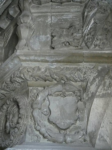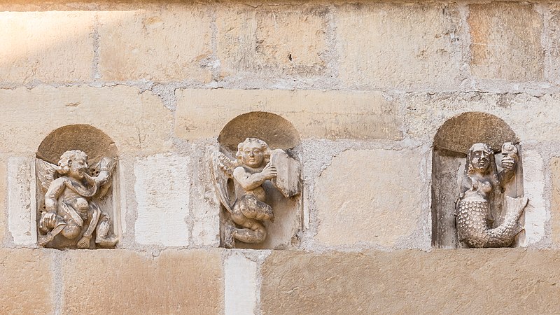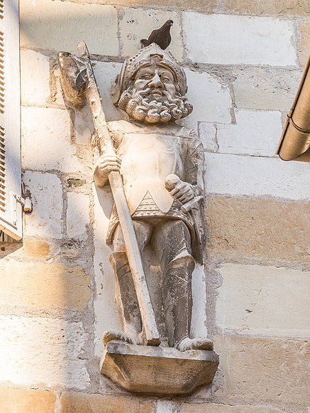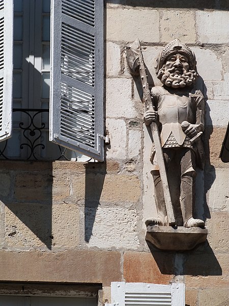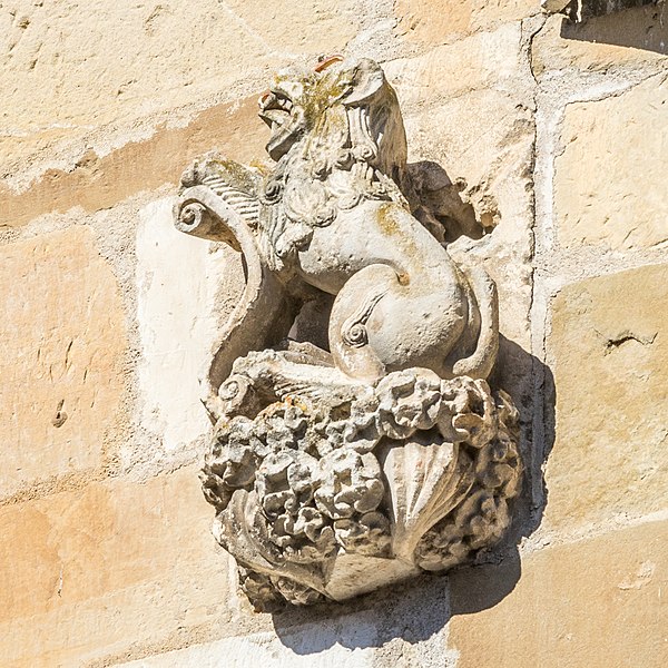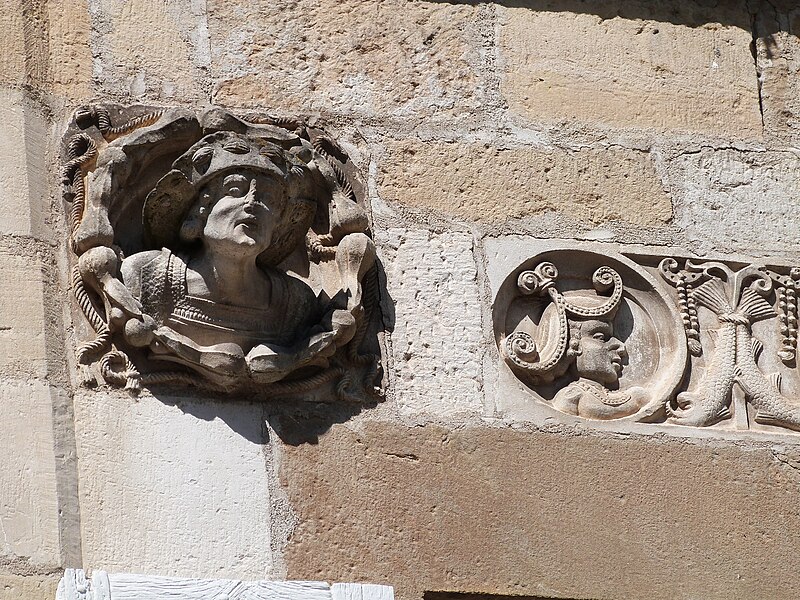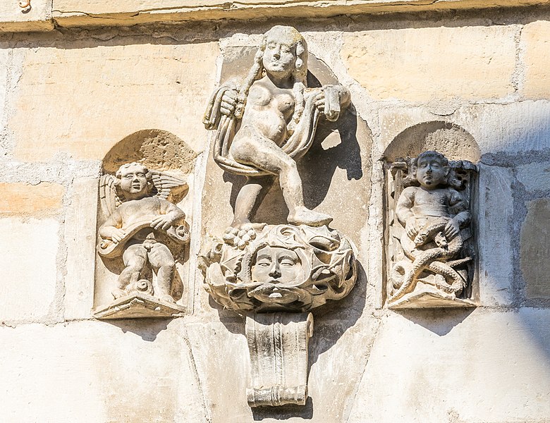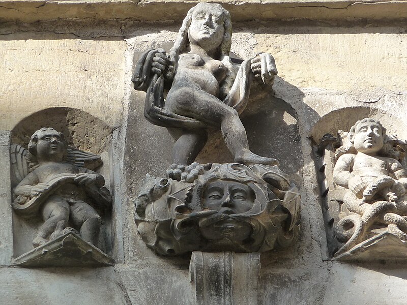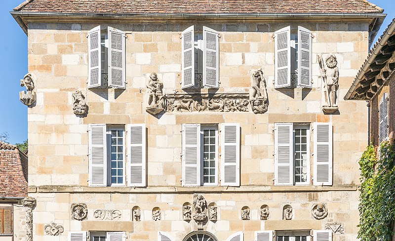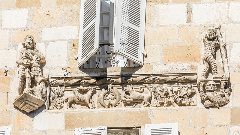 En l'absence de sources contemporaines, l'origine et le sens exacts des sculptures restent ouverts à l'interprétation, d'autant que leur disposition a pu être modifiée lors de leur réemploi. Les décors se déploient sur deux niveaux : entre le premier et le deuxième étage, on observe de grandes colonnes d'angle, des bustes et médaillons, des niches et la célèbre « nymphe bellocoise » accompagnée d'angelots ; entre le deuxième et le troisième étage figurent des statues d'angle, notamment des militaires comme un arquebusier et un veilleur installé dans une échauguette, ainsi qu'un grand hallebardier barbu. Une large frise du deuxième étage représente diverses scènes de combat entre un homme et un fauve, entourée de personnages — composition qui peut évoquer le combat d'Héraclès contre le lion de Némée. De nombreux éléments sculptés datent du XVIe siècle, soulignant le caractère composite et historique de la façade.