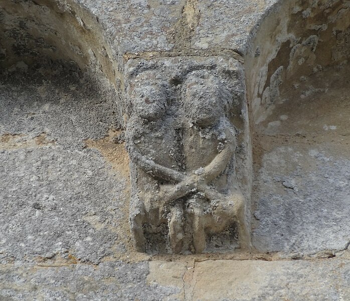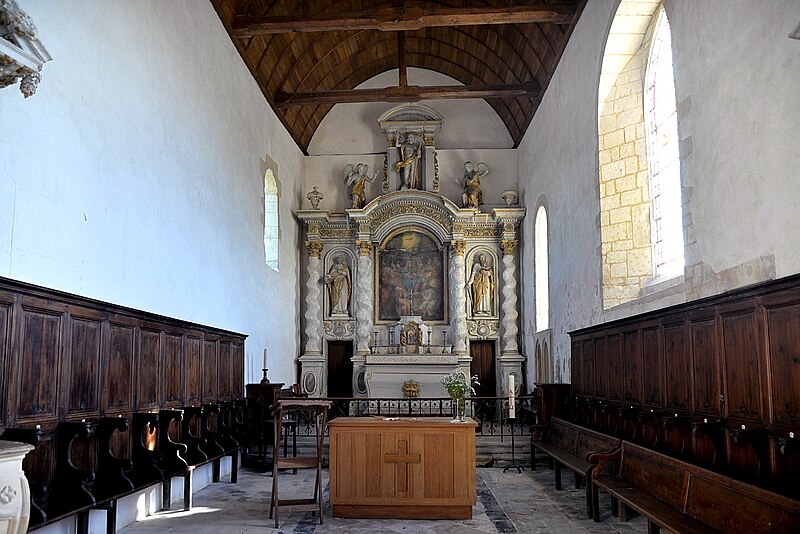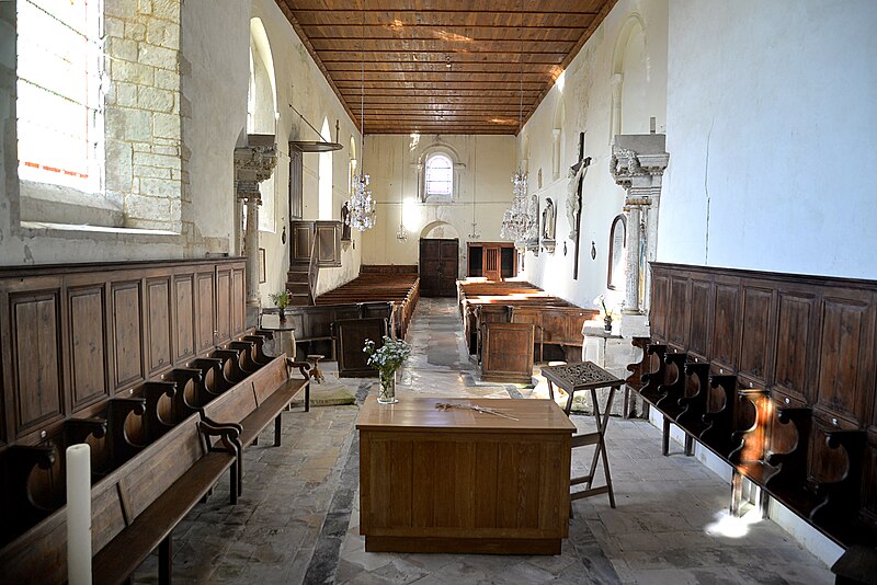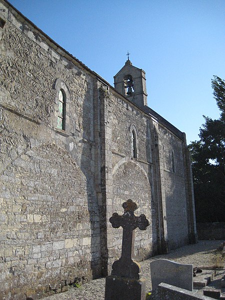 La nef compte trois travées séparées par des contreforts et ses murs gouttereaux sont appareillés en arête-de-poisson. La façade nord a conservé ses petites fenêtres romanes et laisse apparaître des traces d'arcades, vestiges d'un ancien bas-côté ou d'une chapelle. La façade sud conserve une fenêtre romane et une corniche ornée de modillons sculptés de motifs animaliers, grotesques ou grivois. Le chevet plat en pierre de taille est éclairé par deux fenêtres côté sud et une au nord ; il est séparé de la nef, côté sud, par un fort contrefort qui renferme un escalier à vis. La porte du mur sud a été murée et deux portes disposées de part et d'autre de l'autel donnent accès à la sacristie accolée au pignon est du chevet.
