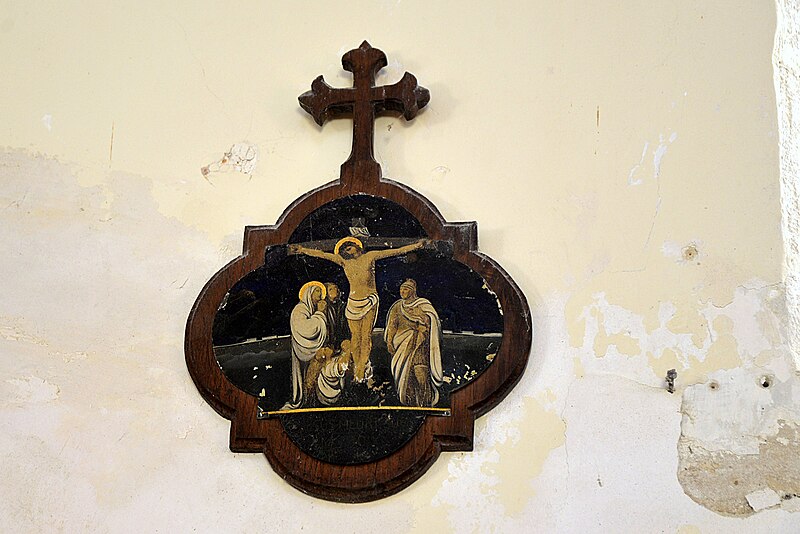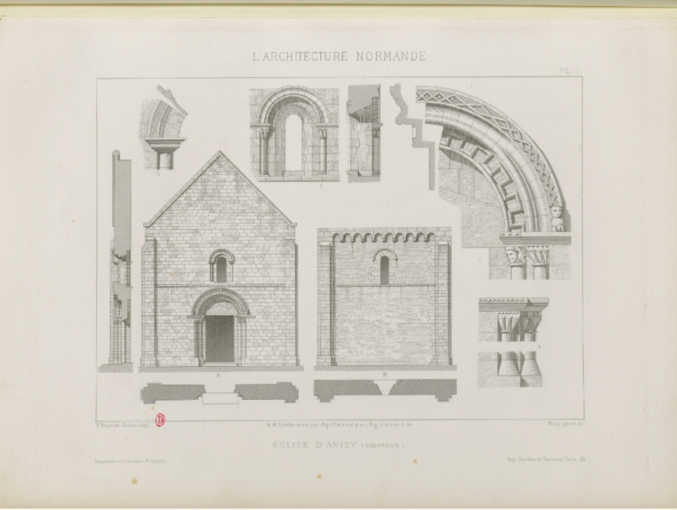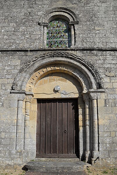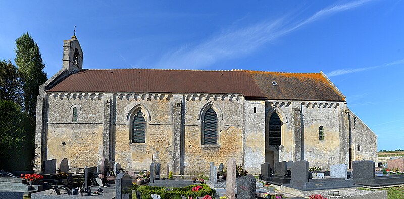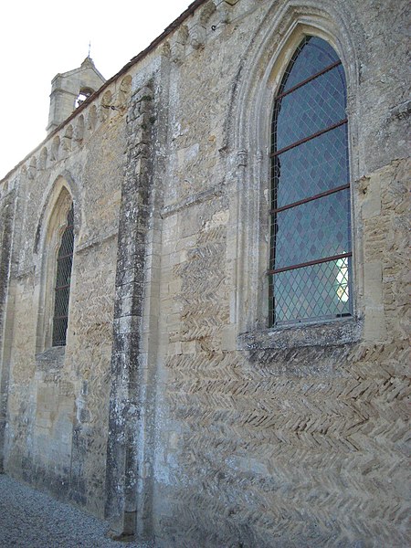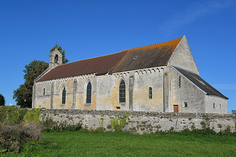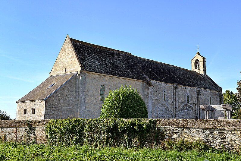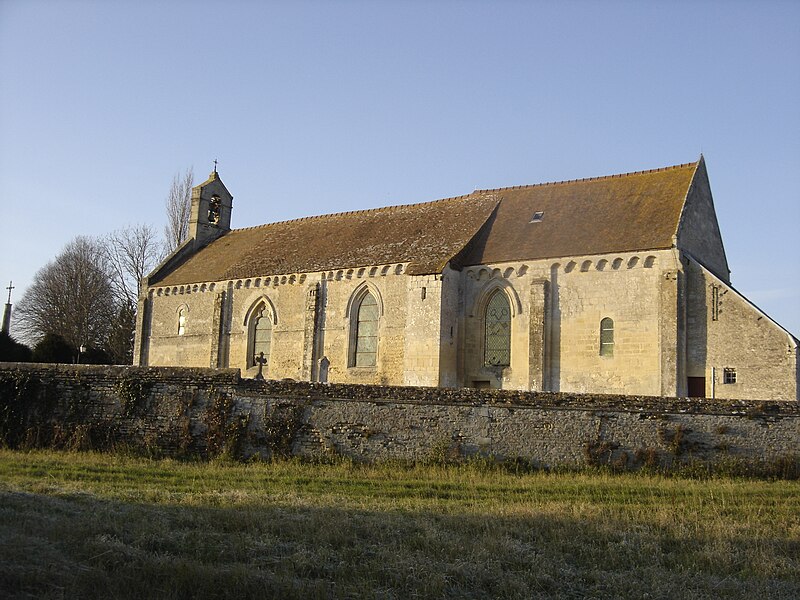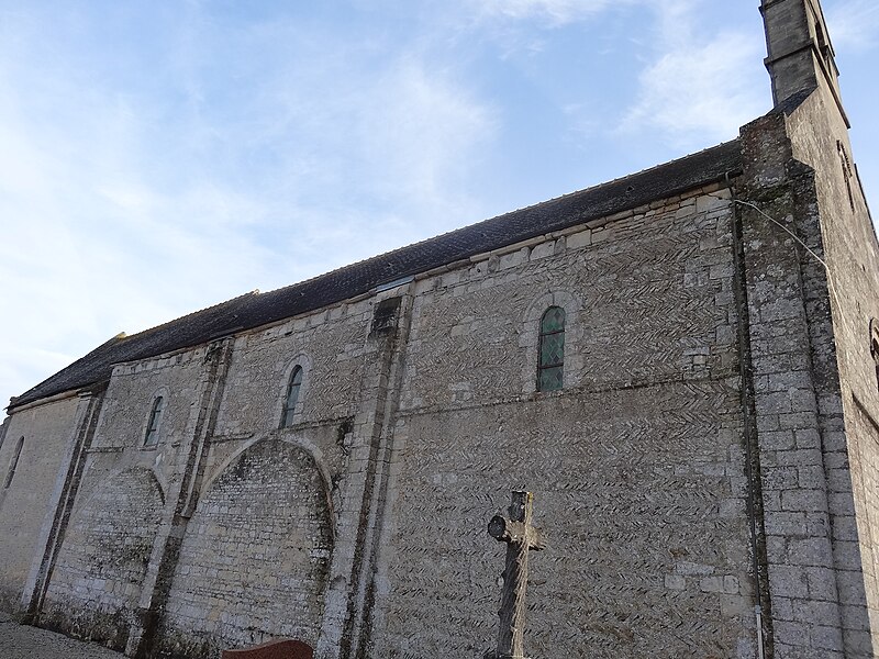 La construction est rectangulaire et orientée, le chevet étant dans le prolongement de la nef. Un clocher-mur surmonte le portail occidental ; la sacristie est adossée au chevet, en appentis à l'est. Selon Victor Ruprich-Robert, la nef remonte au XIIe siècle. La façade occidentale en pierre de taille est divisée par un bandeau continu ; l'arc en plein cintre du portail porte un rang de frettes crénelées et un rouleau d'archivolte décoré de losanges et d'une figure assise. Les colonnes qui encadrent la porte sont coiffées de chapiteaux à godrons et présentent un oiseau fantastique près d'une tête humaine. Deux baies en plein cintre s'ouvrent au-dessus du portail ; la plus petite a été percée au XIXe siècle lorsque le clocher-mur fut refait pour n'accueillir qu'une seule cloche.