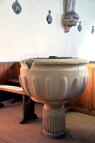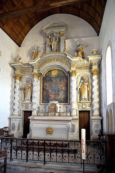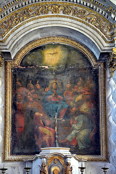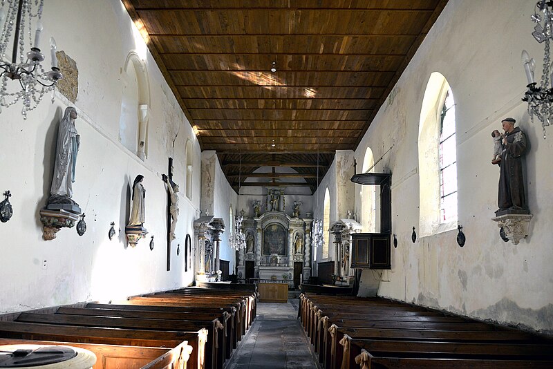 L'intérieur est d'un seul tenant et lumineux grâce aux grandes fenêtres à arcs brisés ouvertes aux XIVe ou XVe siècles. La nef est couverte d'un simple plafond plat tandis que le chœur est abrité sous un berceau lambrissé. Le maître-autel et son retable, de style baroque avec dorures et colonnes torses, datent du XVIIe siècle ; des statues de saint Pierre et saint Paul, dominées par celle du Christ, encadrent un tableau représentant la Pentecôte, et le retable occupe toute la largeur du mur est. Deux autels secondaires du XVIIIe siècle, réalisés dans le même style, sont dédiés à la Vierge et à saint Joseph. La richesse du décor baroque est contrebalancée par l'austérité du mobilier : chaire en bois, rangées de bancs dans la nef et stalles le long des murs du chœur.