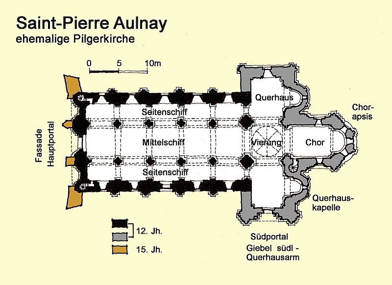 L'harmonie des proportions se traduit aussi par des dimensions mesurées : longueur totale 45,30 m, longueur des nefs 27,80 m, largeur totale 13,60 m, nef principale 6 m, bas‑côtés 3 m, transept 22,70 m, croisée 6 × 6 m, abside longueur 10 m largeur 5,80 m et murs extérieurs d'environ 1,90 m d'épaisseur. La sculpture romane d'Aulnay est une des réalisations majeures de l'ouest de la France ; l'analyse stylistique permet d'attribuer les travaux à trois ateliers successifs qui ont animé différents secteurs de l'édifice.