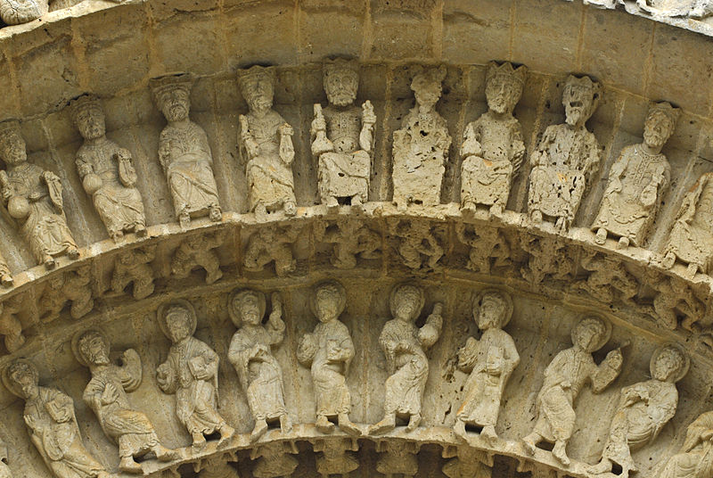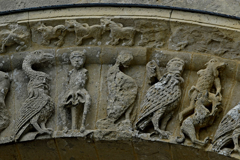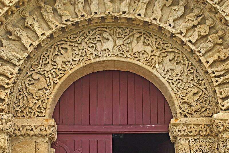 Le portail sud, construit en quatre voussures, présente une profusion d'images : animaux et entrelacs, les douze apôtres et douze prophètes, les vieillards de l'Apocalypse, et en voussure extérieure un bestiaire inspiré du Physiologus. Le portail ouest propose un programme structuré et pédagogique mêlant les travaux saisonniers et les signes du zodiaque, la parabole des vierges sages et folles, la Psychomachie opposant vertus et vices, et, au centre, un ensemble angélique autour de l'agneau pascal ; l'ensemble met l'accent sur le parcours spirituel du fidèle et privilégie des figures féminines.