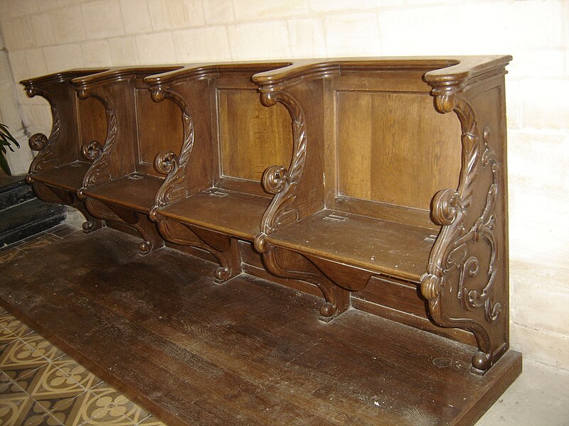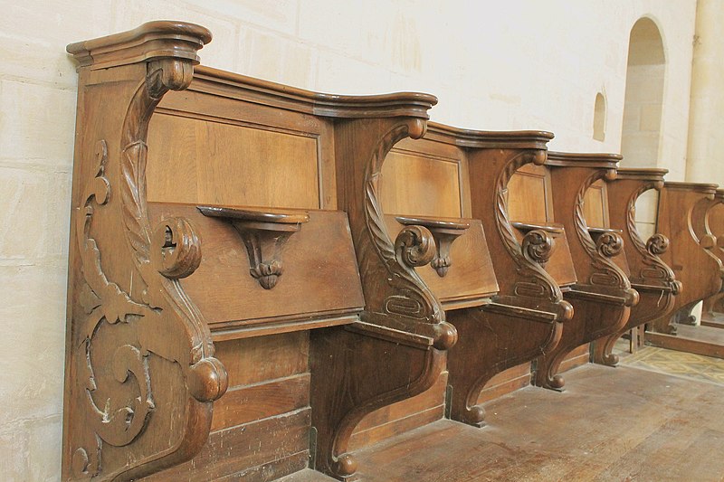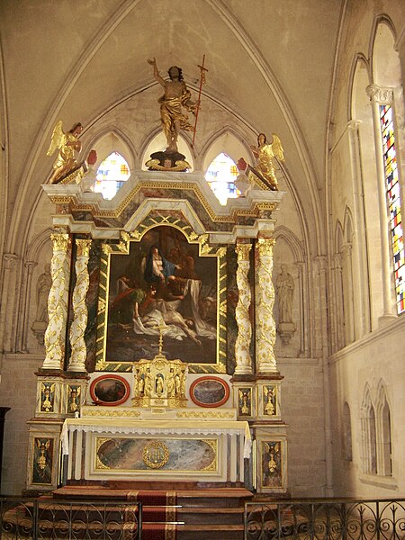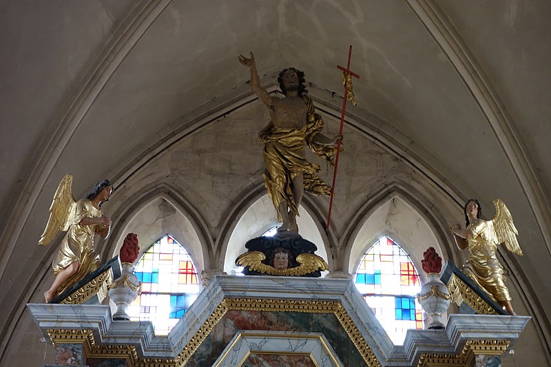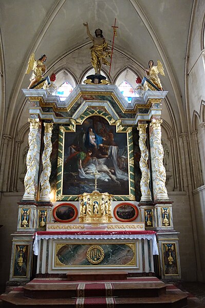 Le mobilier majeur est un retable baroque du XVIIe siècle offert par Louis‑Hercule Vauquelin : il occupe le fond du chœur, cache en grande partie les lancettes du chevet et met en valeur le tabernacle conformément aux prescriptions du concile de Trente. Le grand tableau, inspiré d'une descente de croix de Jean Jouvenet, frappe par son réalisme et est dominé par trois statues — un Christ ressuscité et deux anges adorateurs — entourées de putti en haut‑relief typiques du baroque, tandis que des colonnes torsadées et des dorures renforcent l'aspect spectaculaire voulu pour l'enseignement religieux. Le chœur et le clocher sont inscrits au titre des monuments historiques depuis le 24 janvier 1927.