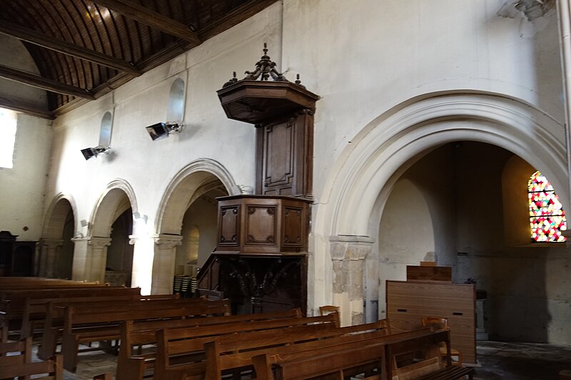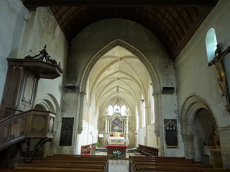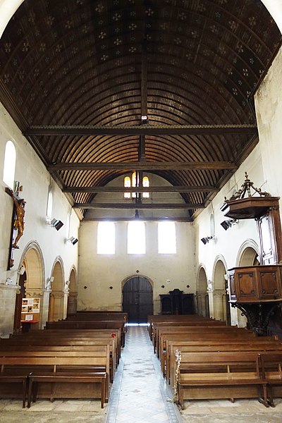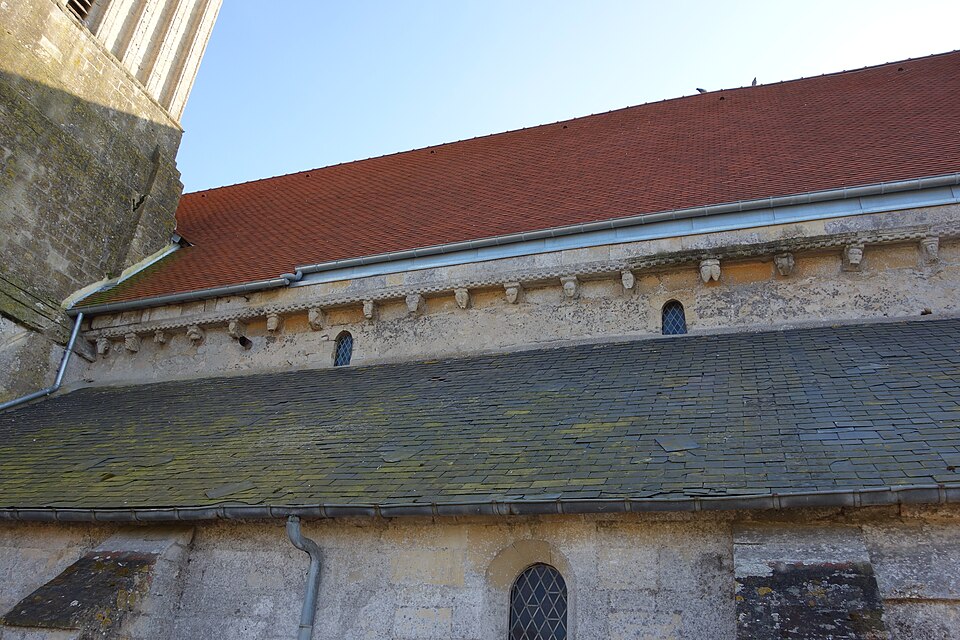 L'architecture associe une nef romane du XIe siècle flanquée de bas‑côtés, un chœur du XIIIe siècle, une petite chapelle du XIIe siècle adossée au nord et une tour en grande partie du XIIe siècle. La nef, restaurée après 1874, est élevée sur deux niveaux ; le bas‑côté sud, en quatre travées, est épaulé de contreforts et percé de trois très petites baies, tandis que des modillons néo‑romans du XIXe siècle reprennent des motifs médiévaux. Le bas‑côté nord, plus court, comporte deux travées et deux fenêtres cintrées ouvertes après 1846 ; au‑dessus court une corniche à billettes soutenue par des modillons d'origine, dont l'un représente un bélier. Le pignon occidental, en trois niveaux, a vu sa grande porte transformée : l'ouverture initiale en arc brisé a été remplacée par un plein‑cintre dont l'archivolte est ornée de billettes et de dents‑de‑scie imitées du décor roman. À l'intérieur, la nef comprend trois travées, une charpente lambrissée décorée et s'ouvre sur les bas‑côtés par de massives arcades en plein‑cintre ; l'accès au chœur se fait par un arc triomphal en arc brisé.