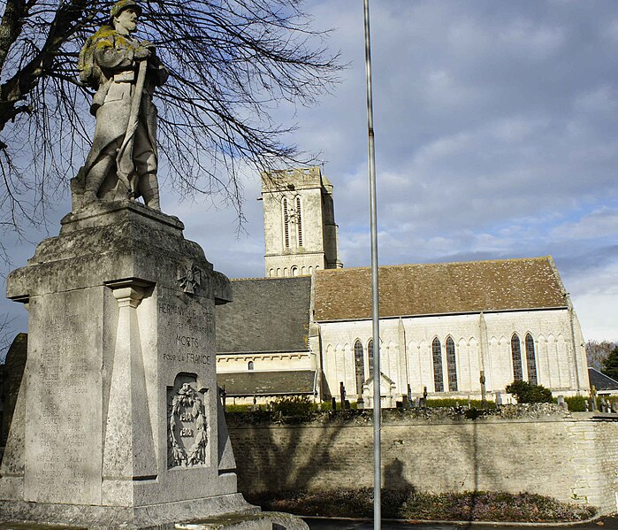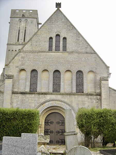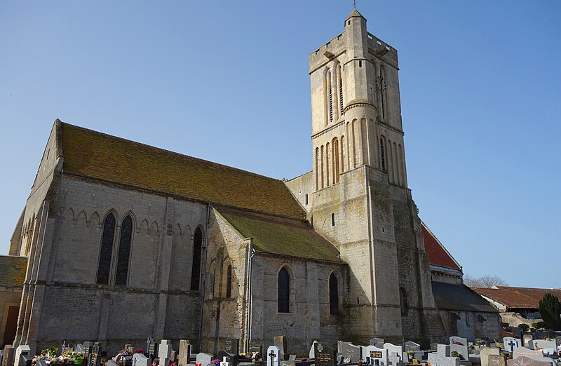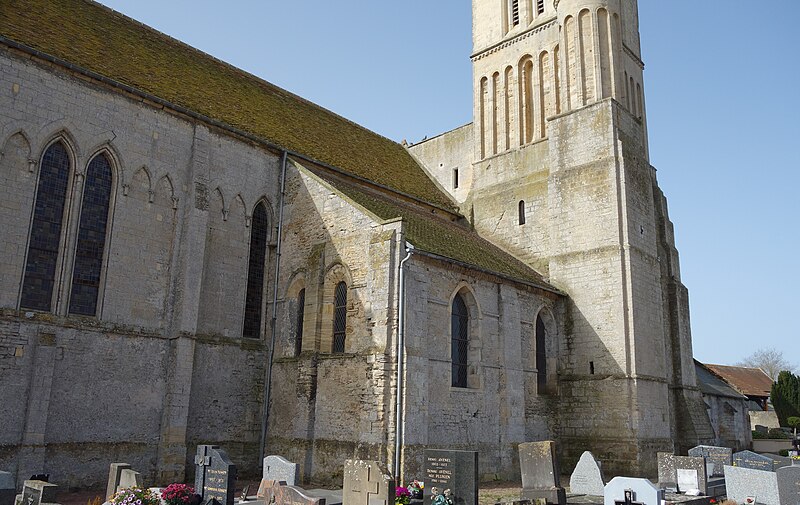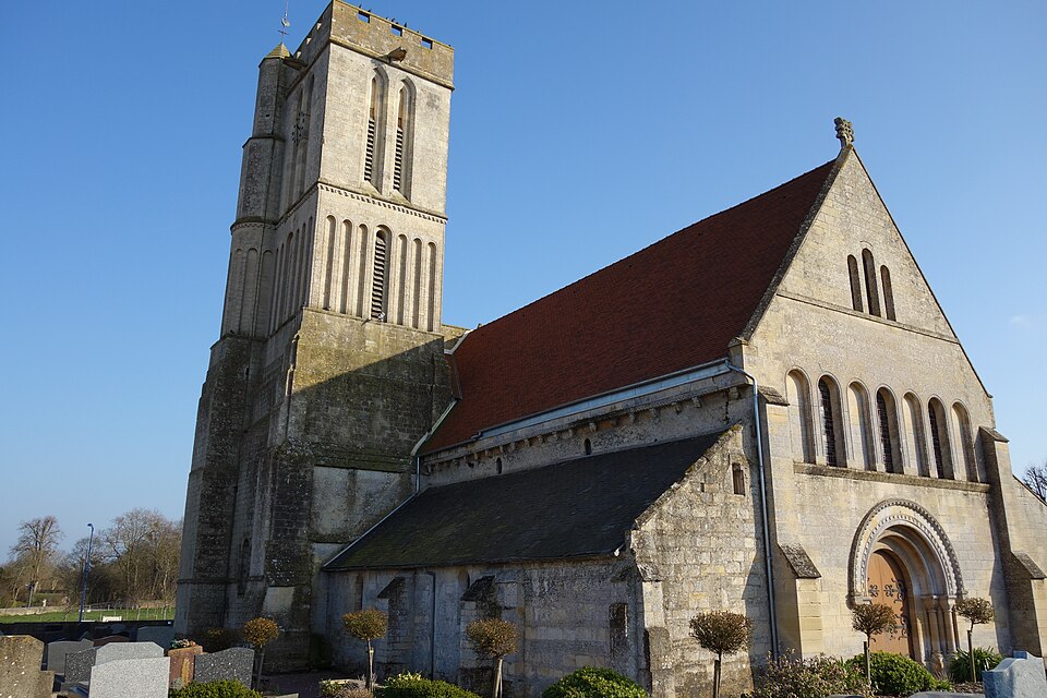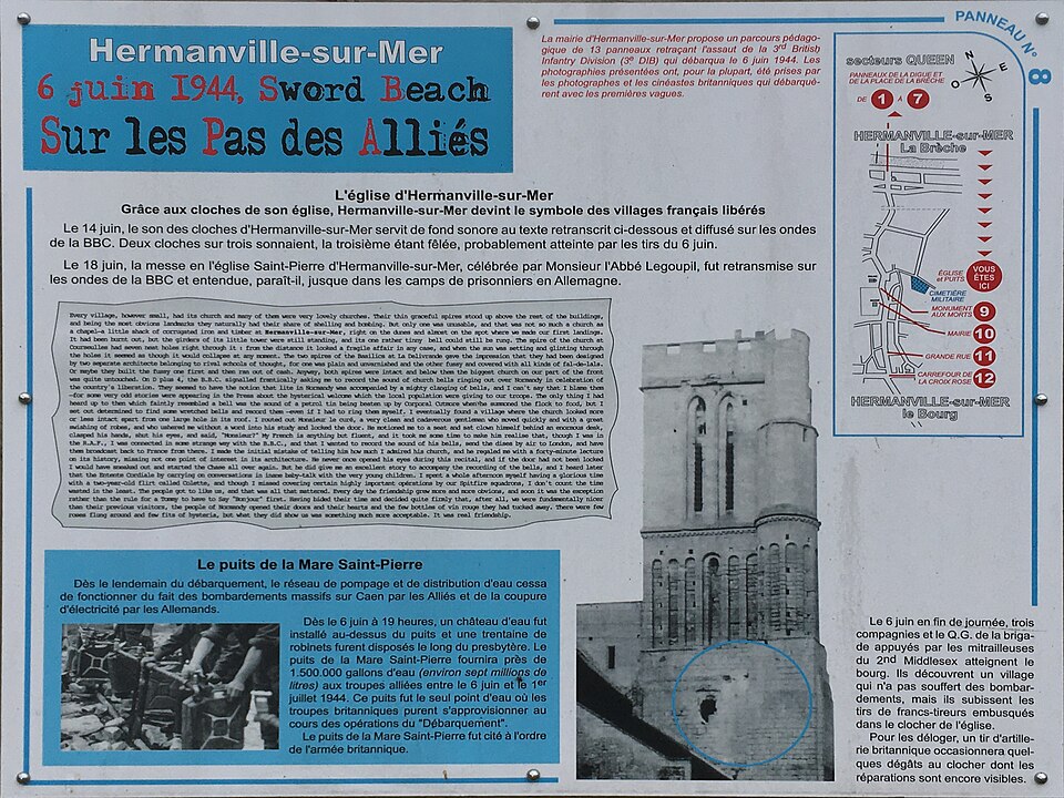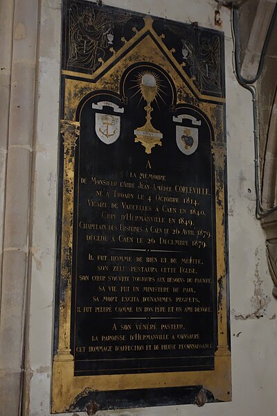 L'église Saint-Pierre d'Hermanville‑sur‑Mer, dans le Calvados, est un édifice catholique dont la nef en pierre remonte au XIe siècle. Depuis le XVe siècle, la paroisse compte une confrérie de charité sous l'invocation de saint Nicolas, patron des mariniers. Jusqu'à la Révolution, le patronage de l'église appartenait à un seigneur laïc qui désignait le curé ; en 1677 Louis‑Hercule Vauquelin, bachelier en théologie, succéda à l'abbé Formont grâce à l'appui de son frère, marquis d'Hermanville. La dîme de la paroisse était importante, trois obitiers étaient attachés au service, et Louis‑Hercule Vauquelin participa au maintien du maître d'école et fit don d'un grand retable qui masquait le mur plat du chevet et ses lancettes. Au début du XIXe siècle, l'abbé Victor Delaunay remit en état le triplet du chevet et ses vitraux ; l'abbé Jean‑Amédée Colleville poursuivit ensuite la restauration. L'engouement pour le patrimoine médiéval en Normandie entraîna parfois des restaurations lourdes, et en 1914 la proposition de classement fut rejetée. Pendant le débarquement de 1944, le clocher fut atteint par un obus dont la trace, bouchée, reste visible ; les cloches célébrèrent le débarquement le 14 juin et la première messe en territoire libéré fut dite le 18 juin, retransmise par la BBC.