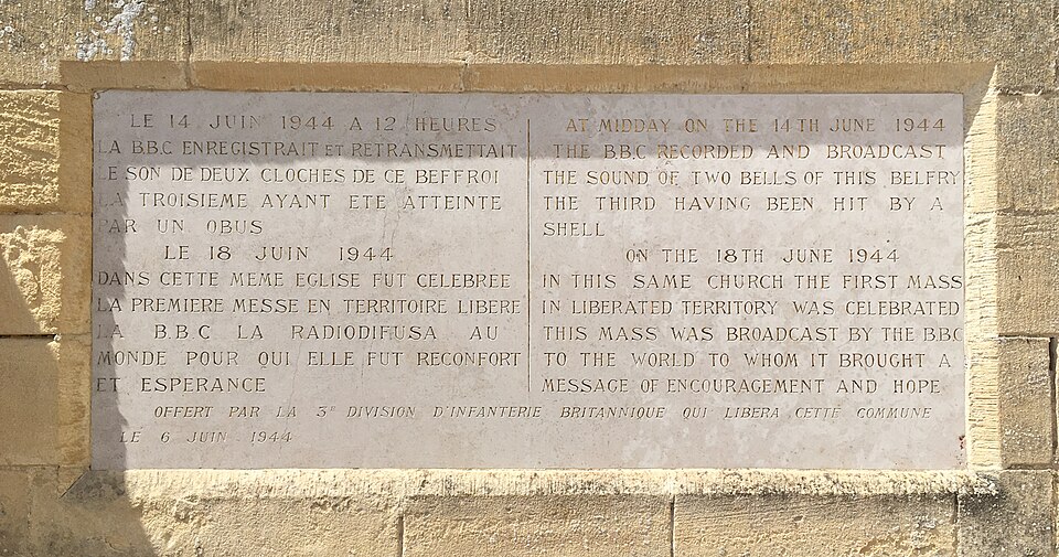 Le soubassement de la tour est roman et s'appuie sur la dernière travée de la nef, offrant un espace voûté et éclairé communiquant avec le bas‑côté nord. La tour, de plan carré, est pourvue d'une tourelle d'escalier dont la base quadrangulaire est suivie d'une construction ronde puis hexagonale coiffée d'une poivrière ajoutée après le passage d'A. de Caumont. Le deuxième niveau, roman, présente sur chaque face une baie unique entourée d'arcatures en plein‑cintre retombant sur de simples pilastres ; une corniche à billettes le sépare d'un troisième niveau du XVe siècle percé de lancettes munies d'abat‑sons, et un parapet crénelé plus récent couronne l'ensemble. Trois cloches rythment la journée en sonnant tous les quarts d'heure et annoncent les offices.