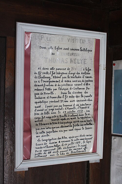 L'église Saint-Pierre de Biville, située dans le bourg de Biville, commune nouvelle de La Hague (Manche, Normandie), abrite le tombeau du bienheureux Thomas Hélye, lieu d'un important pèlerinage depuis le XIIIe siècle. Le chœur gothique a été reconstruit dans la seconde moitié du XIIIe siècle pour accueillir ses reliques, qui reposent au centre du chœur. Le clocher et le porche datent du XVIIe siècle ; selon les sources, ils furent édifiés en 1632 grâce aux offrandes des pèlerins, après l'épidémie de peste de 1628‑1630. La nef a été remaniée au XVIIe siècle, rasée en 1920 puis remplacée entre 1922 et 1926 par une réplique à trois nefs de la salle des chevaliers du Mont‑Saint‑Michel, dans un style néo‑gothique. Les vitraux, conçus par Louis Barillet en collaboration avec Thomas Hansen et Jacques Le Chevallier, ont été réalisés entre 1930 et 1957 ; certaines sources les situent plus précisément entre 1935 et 1937. Ils figurent la vie du bienheureux Thomas Hélye — son baptême, son ordination, sa prêtrise et mission, sa dernière prière, le pèlerinage autour de son tombeau — et évoquent aussi la libération par les GI en 1944. Parmi le mobilier se trouvent des bas‑reliefs du XVIe siècle représentant l'Éducation de la Vierge, sainte Barbe et saint Thomas Becket, ainsi qu'un tombeau en marbre blanc comportant un bas‑relief funéraire du XVIIIe siècle consacré à Thomas Hélye. L'église conserve également un calice et une chasuble de soie datée du XIIIe siècle. Le porche est classé au titre des monuments historiques par arrêté du 12 septembre 1922 ; l'ensemble de l'église, à l'exception du porche classé, a été inscrit par arrêté du 21 décembre 1994. L'édifice, de par son histoire, son décor et son rôle de lieu de pèlerinage, constitue un élément marquant du patrimoine religieux de la Manche.