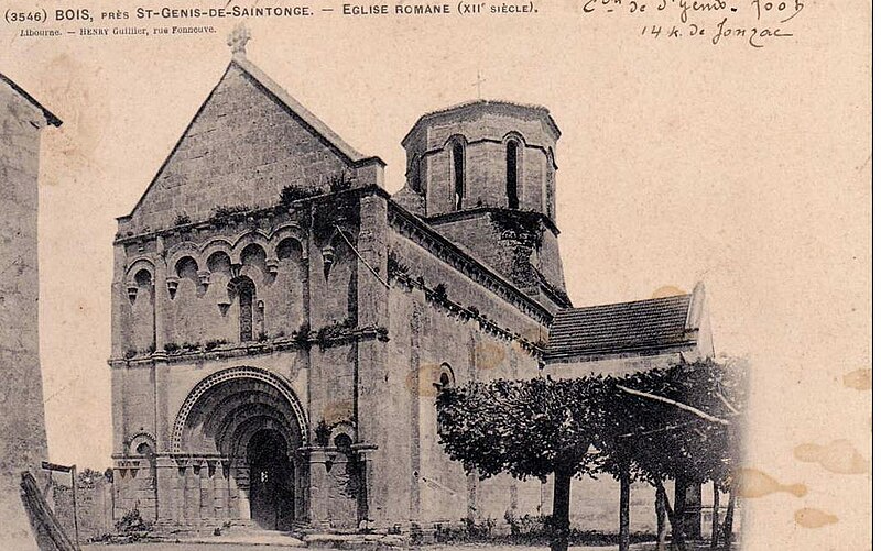 L'église Saint-Pierre, de style roman saintongeais, se situe à Bois en Saintonge, dans le département de la Charente-Maritime (Nouvelle-Aquitaine). Elle a été édifiée au XIIe siècle en pierre de taille assemblée en grand appareil régulier. Deux chapelles latérales ont été ajoutées au XIVe siècle. L'édifice est dominé par une tour octogonale couverte de tuiles orange, percée de fines baies cintrées à abat-sons et reliées entre elles par un cordon de pierre. À l'ouest, la façade se compose de trois registres : le registre inférieur présente un profond portail en plein cintre flanqué de part et d'autre de cinq colonnes supportant une archivolte ornée de cinq voussures, et des niches à colonnes et archivolte occupent les côtés. Le registre médian est animé d'une arcature de six arcades à colonnes, percée en son centre d'une fenêtre à colonnettes qui éclaire la nef. Ces deux registres sont réunis verticalement par deux contreforts latéraux et par deux colonnes engagées séparant le portail des niches. Le registre supérieur est plat et surmonté d'une croix de pierre. À l'est, le chevet plat est percé d'une grande fenêtre ogivale ornée d'un remplage. À l'intérieur, la croisée du transept est surmontée d'une coupole reposant sur des pendentifs. L'église Saint-Pierre est classée au titre des monuments historiques depuis le 21 janvier 1907.