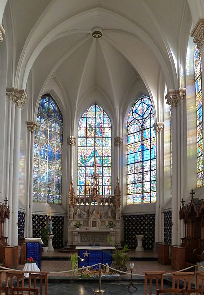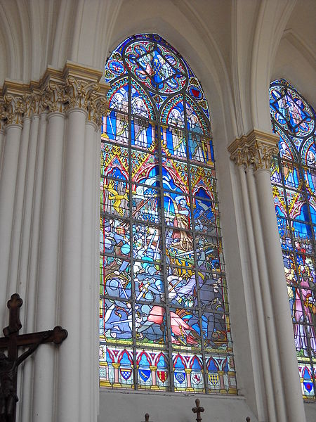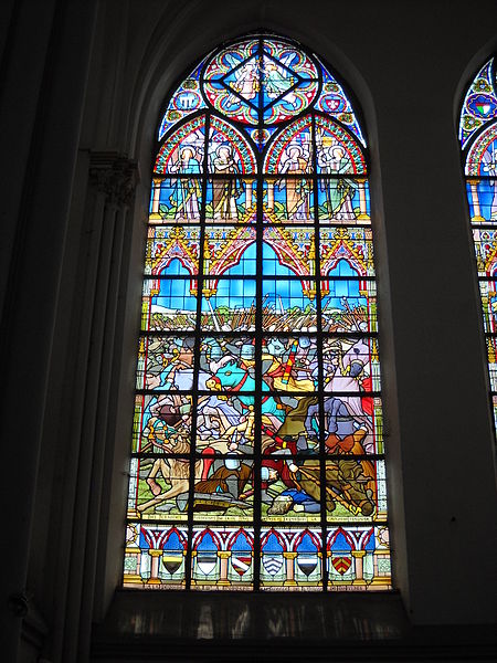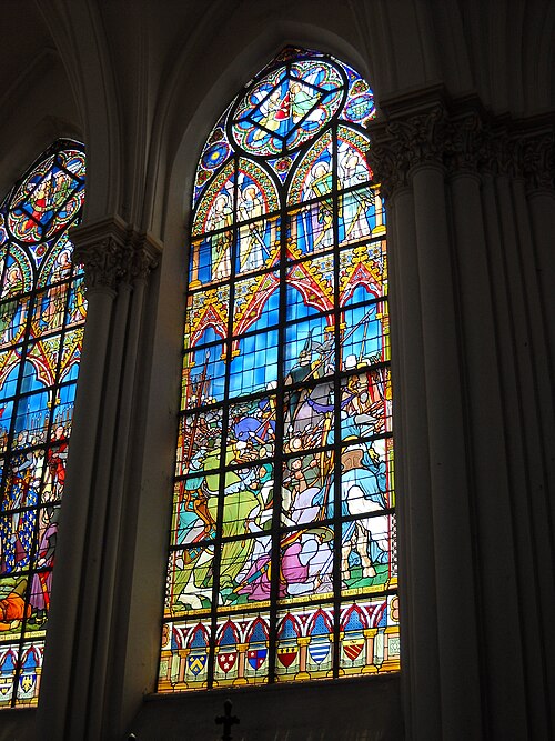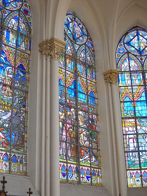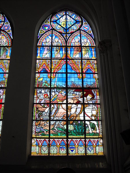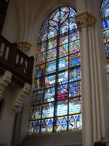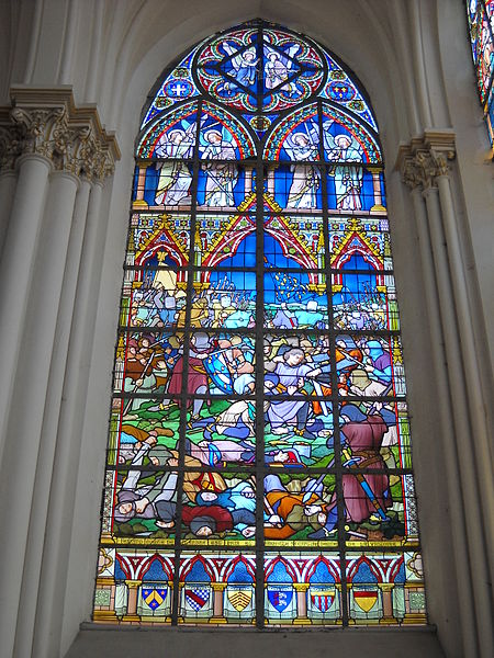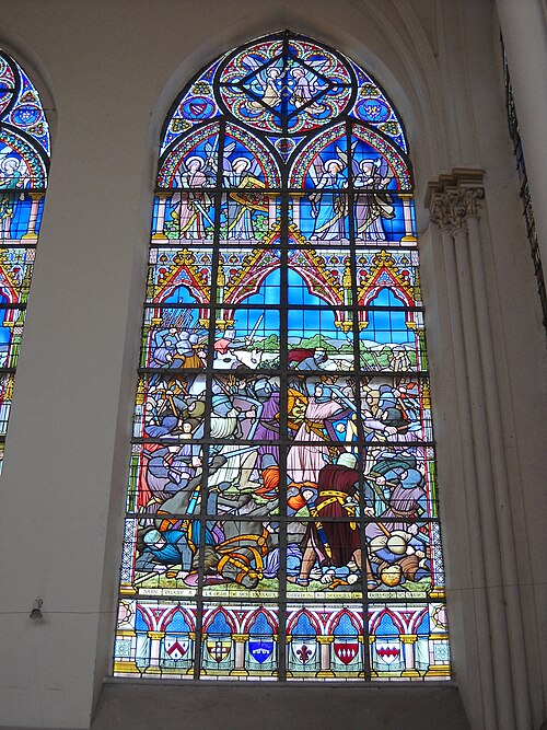 L'église Saint-Pierre de Bouvines est l'église paroissiale de la commune de Bouvines, dans le département du Nord, et dépend de l'archidiocèse de Lille. En 1878, la commune, sous l'autorité du maire Félix Dehau, décida de reconstruire l'édifice jugé vétuste et exigu. Les travaux, entrepris en 1880, s'achevèrent en 1886 et l'église fut consacrée en 1910 ; les premiers vitraux furent posés à partir de 1889. L'architecte Auguste Normant s'inspira de l'architecture médiévale et conçut l'édifice comme une sorte de sainte-chapelle, sans reliques, destinée à mettre en valeur ses vitraux. Le plan comprend une nef sans collatéraux, séparée du chœur par un transept, et l'ensemble est couvert de voûtes sur croisées d'ogives. Les vingt et un vitraux, chacun mesurant huit mètres de haut sur 3,2 mètres de large, ont été dessinés par Pierre Fritel et réalisés par Charles et Emmanuel Champigneulle, Emmanuel travaillant dans son atelier de Bar-le-Duc. Le premier vitrail fut posé en 1889 et le dernier en 1906 ; ils ont été restaurés vers 1990 par le maître-verrier Brouard de Ronchin. Ces verrières, conçues d'après des cartons de Fritel, illustrent la bataille de Bouvines et ses épisodes tels que le conseil de guerre à Valenciennes, les prières avant l'affrontement, les combats, la capture des principaux chefs coalisés et l'entrée triomphale à Paris, suivant la chronique de Guillaume Le Breton. Chaque vitrail se compose de trois parties : une partie supérieure ornée de médaillons avec des anges, une partie centrale figurant un épisode de la bataille et une partie inférieure portant les blasons des donateurs. La réalisation de ces vitraux a coûté 350 000 francs, soit cinq fois le prix de l'église. Protégée au titre des monuments historiques, l'église et ses vitraux ont fait l'objet d'arrêtés en 1981, ces derniers ayant été annulés lorsque l'édifice fut finalement classé dans son ensemble en 2010. À l'occasion du 800e anniversaire de la bataille de Bouvines, une messe y fut célébrée le 27 juillet 2014 par Mgr Laurent Ulrich, en présence de descendants de Philippe-Auguste, dont Louis de Bourbon.