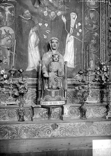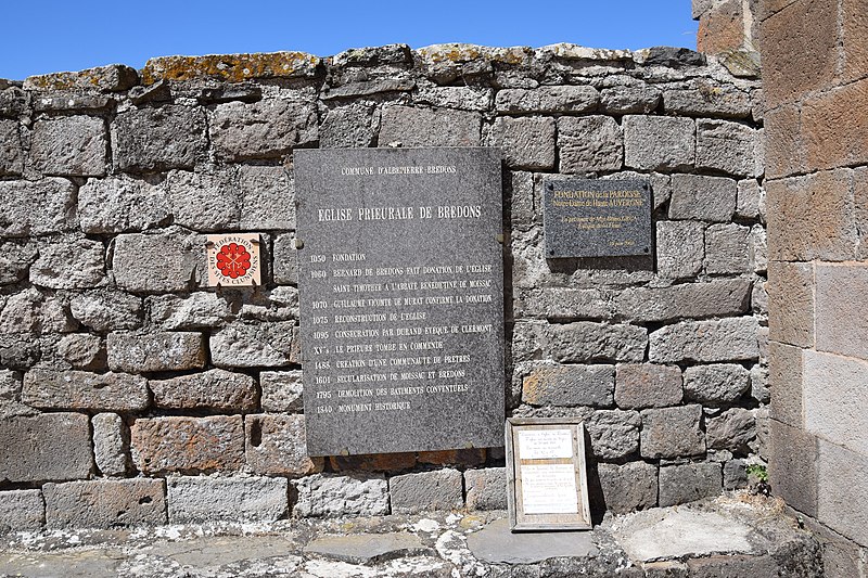 L'église Saint-Pierre de Bredons, de style roman-byzantin, se situe sur la commune d'Albepierre-Bredons dans le département du Cantal. Elle se dresse sur un dyke dominant la vallée de l'Alagnon et la ville de Murat. Le prieuré fut fondé en 1067 par Durand de Bredon, abbé de Moissac de 1048 à 1071. L'église a été bâtie en 1074 par Guillaume, vicomte de Murat, et Bernard d'Henry, seigneur de Bredons, et la première édification fut consacrée en 1095. Elle fut desservie par des religieux de l'ordre de Saint-Benoît dépendant de l'abbaye de Moissac. L'édifice fait l'objet d'un classement au titre des monuments historiques depuis la liste de 1840. Le trésor du prieuré a notamment livré une rare statue-reliquaire en noyer, retrouvée en 1954 derrière le maître-autel et conservée au musée de la Haute-Auvergne à Saint-Flour. Datée de la première moitié du XIIe siècle, cette statue est polychrome, partiellement recouverte de plaques métalliques, et représente saint Pierre assis sur un trône, vêtu d'une tunique plissée et bénissant les fidèles de la main gauche avec deux doigts levés. L'église a subi plusieurs vols, le plus important ayant eu lieu la nuit du 29 juin 2002, lorsque près d'une cinquantaine d'objets furent dérobés; depuis, un seul objet a été retrouvé en Allemagne et d'autres seraient dispersés dans des collections privées. Parmi les pièces volées figurent, outre la Vierge à l'Enfant romane dite Notre-Dame de Sion volée en 1959, la Notre-Dame-de-Lorette, une niche à baldaquin soutenue par deux angelots, une toile attribuée à Drouais accompagnée de statues de saint Blaise et de saint Timothée, la Remise du Rosaire de Nicolas Gargan (XVIIe siècle), des statues de Marie-Madeleine, de la Vierge et de Jean (XVIIIe siècle), une toile représentant saint Paul remettant les épîtres à saint Timothée, des statues d'Adam et Ève avec un angelot et un cartouche, des statues de Jésus et de la Vierge accompagnées d'un angelot et d'un cartouche intitulé « La Vie vient du bois », ainsi que des bas-reliefs et un crucifix; parmi ces derniers, le bas-relief d'Aaron a été le seul retrouvé en 2009. Depuis 2021, des travaux de rénovation concernent la façade et un échafaudage enveloppe l'extérieur de l'église. L'édifice est construit en pierre basaltique et couvert de lauzes. Parmi les éléments visibles du monument figurent le flanc sud de l'église, une vue partielle de la façade du prieuré, le portail d'entrée et le retable d'Antoine Boyer.