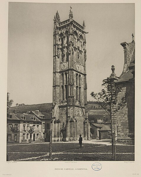 L'église paroissiale Saint-Pierre de Carville, située à Darnétal dans l'agglomération de Rouen (Normandie), remplace une première église du XIIe siècle et a été édifiée à la fin du XVe siècle et au début du XVIe siècle. Sa tour-clocher carrée, finement sculptée dans un gothique flamboyant proche du style du sculpteur rouennais Roulland Le Roux, se trouve aujourd'hui séparée du reste du bâtiment. La tour fut incendiée en 1562 pendant les guerres de Religion et resta en mauvais état jusqu'au XVIIe siècle ; à cette époque trois travées occidentales furent supprimées et la nef partiellement fermée, ce qui explique la séparation actuelle. L'édifice a connu de nombreux remaniements et présente une architecture peu homogène, mais son volume intérieur, composé d'un vaisseau central flanqué de bas-côtés, demeure sobre et équilibré. Le chevet conserve des vitraux du XVIe siècle ainsi que des peintures en faux-marbre. La façade principale, de type « à la romaine », est plus récente et se situe à l'endroit où la nef se prolongeait autrefois jusqu'à la tour ; le flanc de cette dernière porte encore les traces de la toiture et des joints qui la rattachaient au reste de l'église. Sept vitraux, réalisés d'après des cartons de Georges Mirianon, illustrent la vie de Jésus : l'Adoration des mages, la Sainte Famille, Jésus et les docteurs, la pêche miraculeuse, le coup de lance du centurion, la Transfiguration et les Béatitudes. La tour, dite « Henri IV », est classée au titre des monuments historiques depuis 1875 ; l'église a été inscrite en 2011 puis classée le 22 avril 2015. Malgré ses remaniements, les éléments gothiques de l'édifice témoignent de la richesse du bourg à la fin du Moyen Âge. L'église, aujourd'hui inutilisée comme lieu de culte, est fermée depuis 2005 en raison d'infiltrations et attend une restauration.