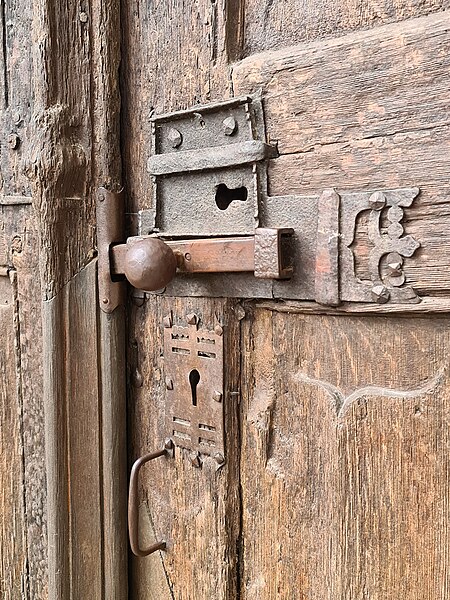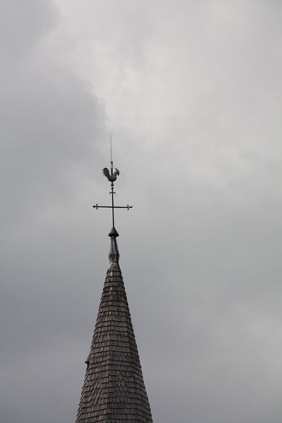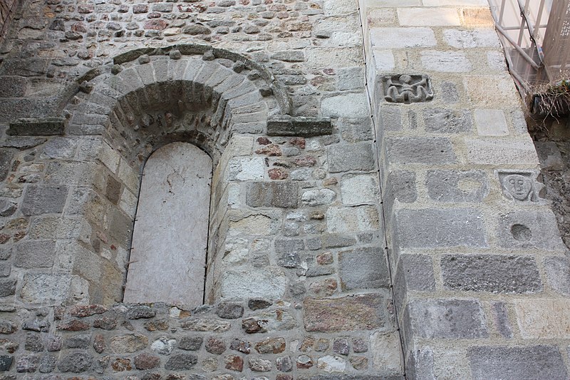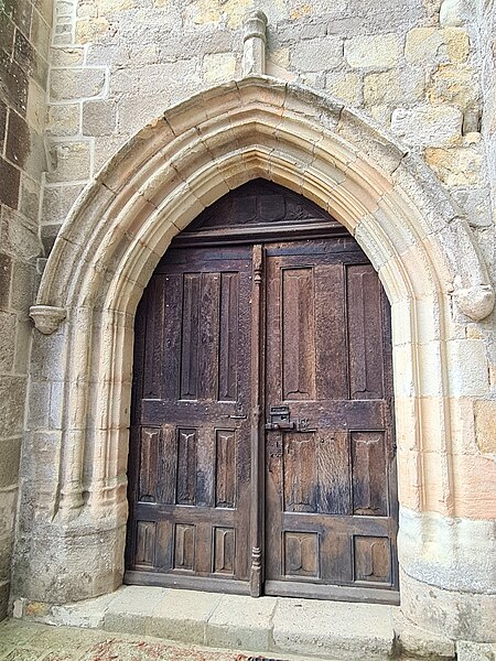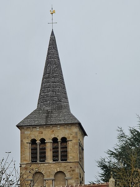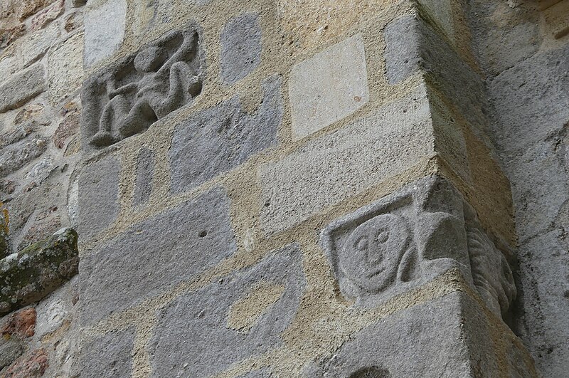 Sur le plan extérieur, le clocher présente trois niveaux de baies, dont des fenêtres géminées et des abat-sons sous la flèche ; des pierres de réemploi sculptées en bas‑relief (acrobate, tête, basilic) ornent un contrefort nord. La porte du bas-côté nord, couverte par un arc flamboyant, conserve une serrure ancienne du XVIe siècle et un décor aux fleurs de lys des ducs de Bourbon.