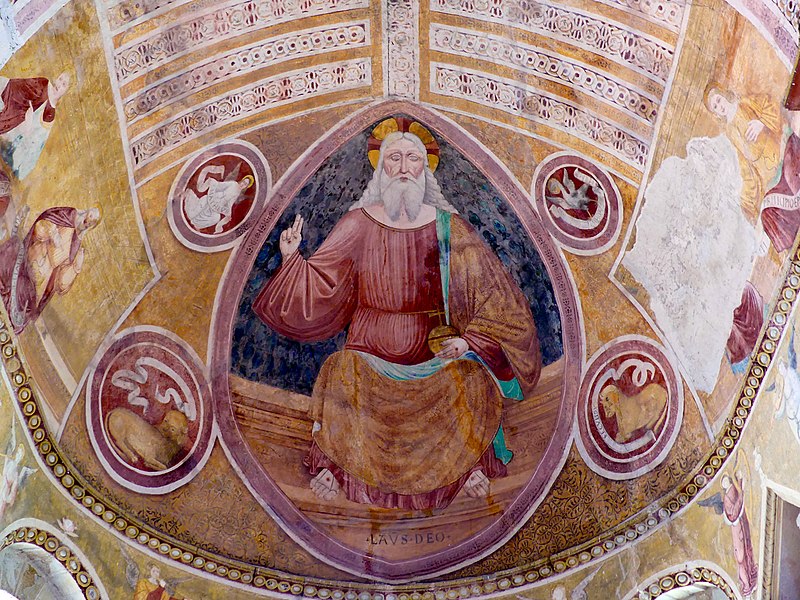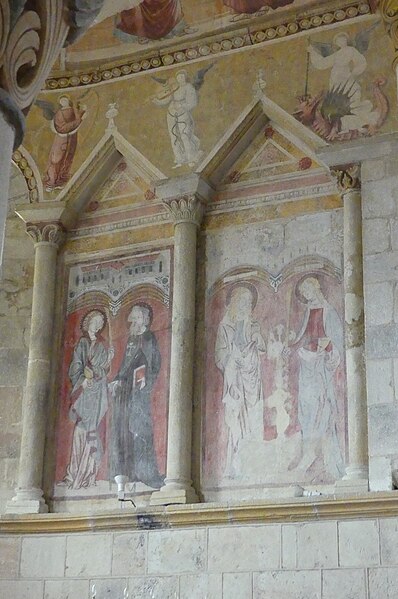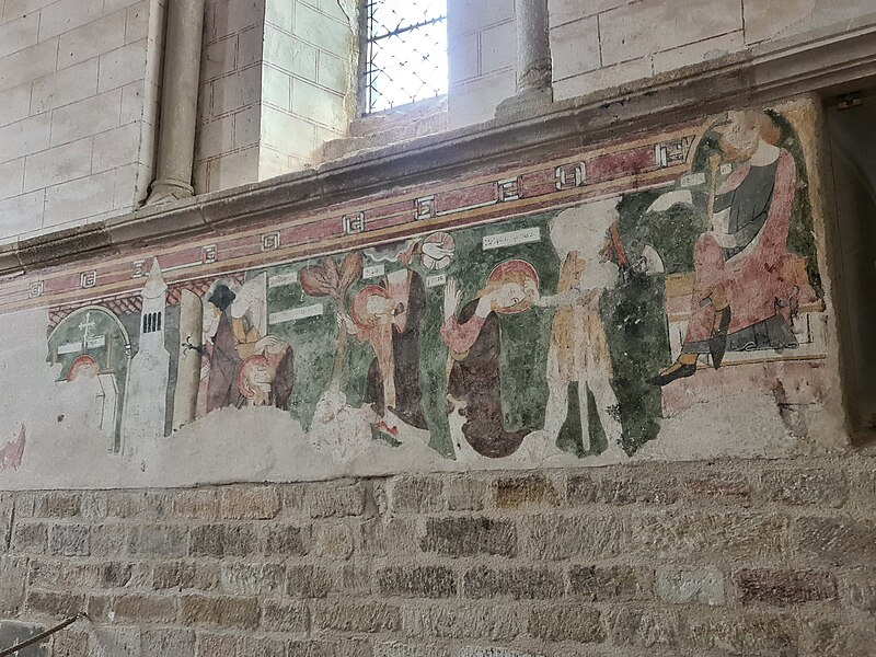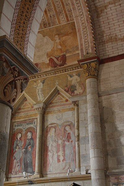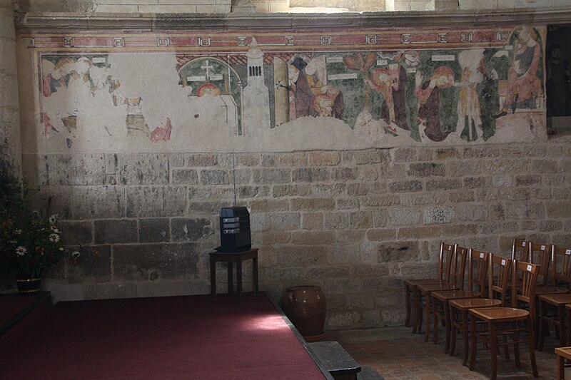 Les peintures murales, mises au jour et restaurées à partir de la fin des années 1960 et dans les années 1970, comprennent deux campagnes picturales principales (XIVe et XVe–XVIe siècles) ainsi qu'un décor plus ancien sous-jacent. Sur le mur sud de la nef une longue frise en six tableaux, à lire de droite à gauche, relate le martyre de saint Principin et porte des cartouches nominant les personnages ; cette fresque, redécouverte en 1971, est un document iconographique majeur. Le chœur est orné d'un Christ en majesté dans une mandorle entouré du tétramorphe, d'anges musiciens et de rangées de saints ; cet ensemble, en grande partie de la Renaissance, comprend aussi des figures plus anciennes.