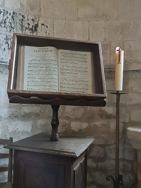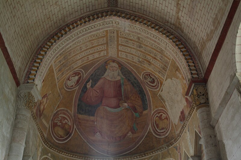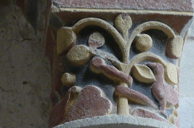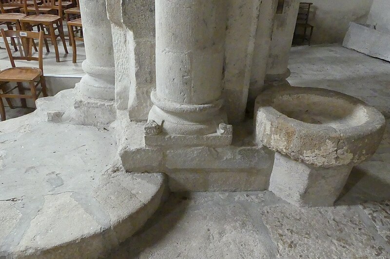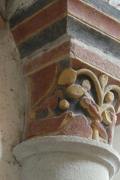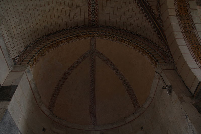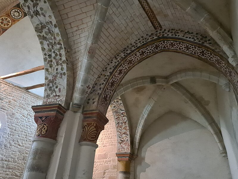 L'intérieur offre une nef principale haute, formée de travées inégales voûtées en berceau brisé, avec arcs-doubleaux en ogive reposant sur des chapiteaux sculptés de motifs végétaux ; la travée qui supporte le clocher comporte une coupole sur pendentifs renforcée par huit nervures autour d'un oculus. Le bas-côté, plus bas, est voûté en croisée d'ogives ; les deux nefs s'achèvent par des absides en cul-de-four brisé. La deuxième pile cruciforme contient les fonts baptismaux et un chapiteau historié unique représentant le Paradis terrestre en trois tableaux.
