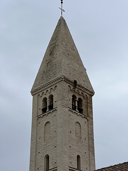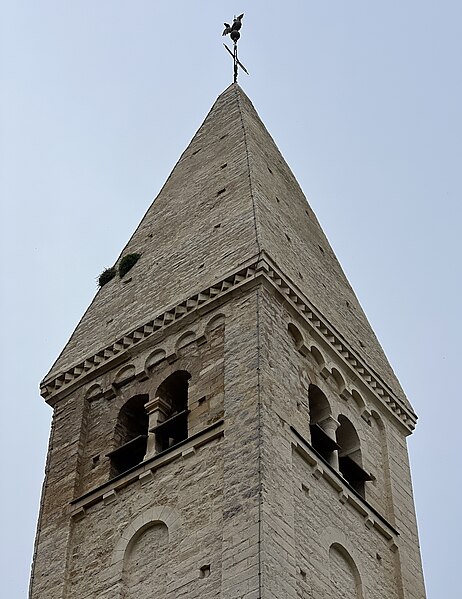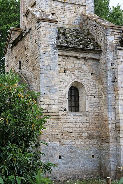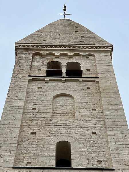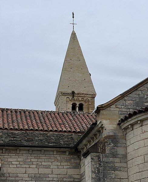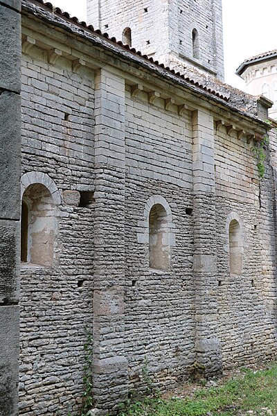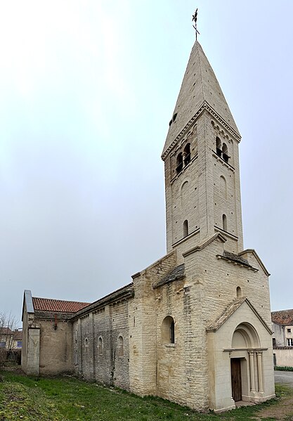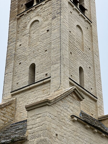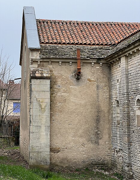 La façade nord, soutenue par des contreforts effilés et percée de nombreux trous de boulin, présente un portail en ressaut encadré de colonnes aux chapiteaux sculptés, surmonté d'un tympan à ornement polylobé. La façade orientale est couronnée par le clocher roman, coiffé d'une flèche ; chaque face du clocher comporte trois registres : une baie cintrée simple au premier niveau, une baie aveugle au second et, au troisième, des baies géminées à colonnettes inscrites dans un décor de bandes lombardes. Parmi les éléments de style néo-roman figurent le portail de la façade orientale et le chevet occidental, formé d'une abside semi-circulaire rythmée par des pilastres interrompus avant la corniche.