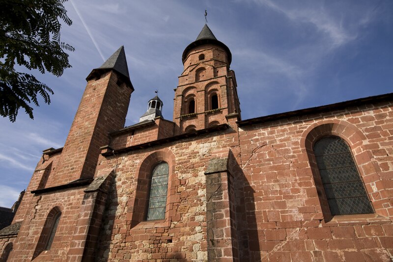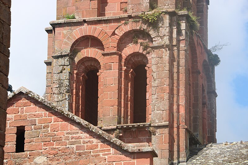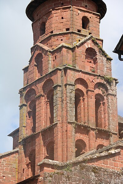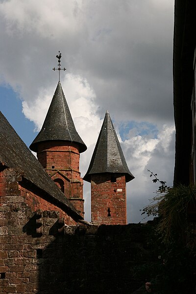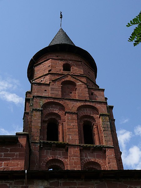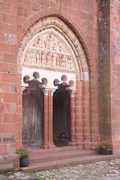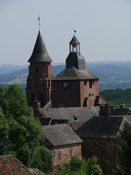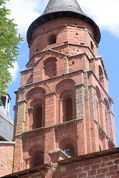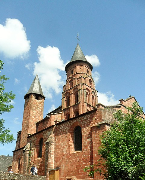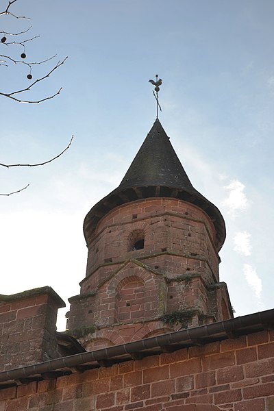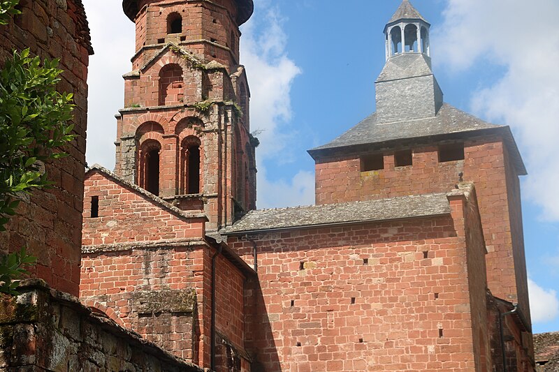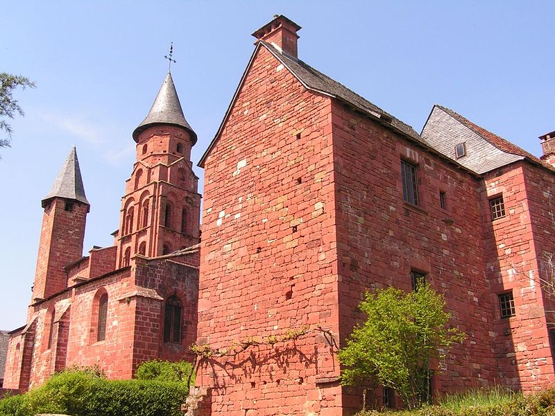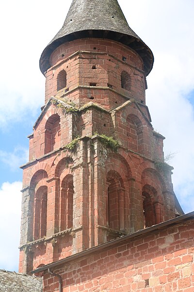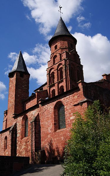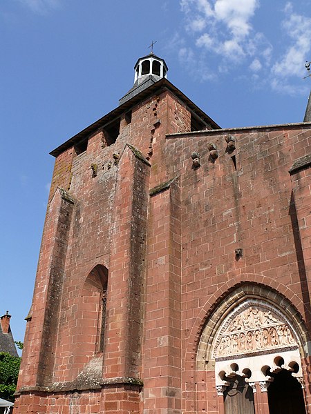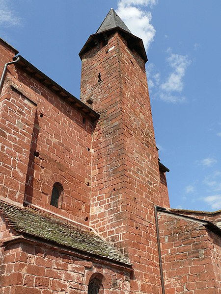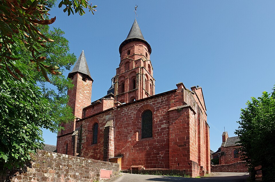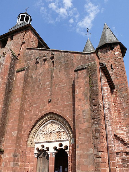 L'église Saint-Pierre (ou Saint-Sauveur) de Collonges-la-Rouge, en Corrèze, est bâtie en grès rouge vers 1060-1070 et a été agrandie entre le XIIe et le XVe siècle. Elle a été fortifiée à la fin du XIVe siècle puis à nouveau au cours des guerres de Religion au XVIe siècle, période durant laquelle on ajoute la tour carrée au sud dite « tour du guetteur ». À la même époque médiévale on ajoute une deuxième nef, plus courte, et quatre chapelles de dimensions inégales, qui lui confèrent son plan irrégulier. Pour enrayer le déclin du village, la municipalité entreprend des travaux de conservation dès 1902 et obtient le classement de l'édifice au titre des monuments historiques le 4 avril 1905. Le clocher roman, peut-être le plus ancien du groupe régional des clochers à gâbles limousins, daterait du début du XIIe siècle. Sa base est carrée et comporte deux étages soulignés par de hautes baies en plein cintre dont les ouvertures sont accentuées par arcs, piliers et colonnes à chapiteaux sculptés. Deux niveaux octogonaux surmontent ces assises carrées, la transition étant masquée par des gâbles, et le dernier étage reçoit une couverture conique qui remplace l'ancienne flèche en grès. Cette structure rare, l'un des types les plus archaïques du clocher limousin, ne subsiste que dans quatre exemplaires régionaux. Le portail se distingue par un tympan en calcaire de Nazareth, de teinte claire, qui contraste avec le grès rouge de l'église. Ce tympan, attribué à des sculpteurs toulousains au XIIe siècle, aurait été démonté et scellé dans le pignon pour le préserver des violences pendant les guerres de Religion, puis remis en place lors de la restauration de 1923. Ses sculptures en demi-relief représentent, selon les spécialistes, soit l'Ascension, soit le Retour du Christ ; au centre du registre supérieur le Christ tenant le Livre aux sept sceaux est encadré d'anges, et le registre inférieur montre la Vierge entourée de onze apôtres. Les deux arcs trilobés qui supportent le tympan reposent sur quatre chapiteaux à palmettes perlées ; le chapiteau droit, décoré d'un montreur d'ours, est d'origine, les trois autres étant des copies réalisées lors d'une restauration. L'intérieur s'ouvre sur une nef romane très dépouillée, tandis que la nef de gauche, de style gothique, est éclairée par des vitraux. La tradition locale rapporte que, pendant les guerres de Religion, le culte catholique se tenait dans la nef principale et le culte protestant dans la chapelle Saint-Jacques, chaque camp cherchant à perturber l'office de l'autre. L'autel principal, peint en bleu et doré, réunit des éléments de différentes époques : un autel du XIXe siècle, un gradin en partie du XVIIe siècle, un tabernacle du XVIIIe siècle et un retable reconstitué au XIXe siècle ; il a été classé en 1978 et restauré en 1984-1985. L'autel de la chapelle sud, son gradin, son tabernacle et son retable en bois sculpté et doré, représentant la Passion, datent du XVIIe siècle et sont inscrits aux monuments historiques. Une clôture de chapelle en bois sculpté et ajouré, ornée de coquilles, rinceaux, volutes, feuilles d'acanthe et atlantes, attribuée à la fin du XVIIe siècle ou au début du XVIIIe, est inscrite comme objet classé depuis 1982. La statue en bois du Christ gisant, datée du XVIe siècle et retrouvée dans une haie en 1971, est inscrite aux monuments historiques, de même que la Vierge de Pitié en bois doré et peint (XVIIe ou XVIIIe) et la Vierge à l'Enfant (XVIIIe). Un Christ en croix en bois sculpté, monté sur une croix rapportée et datant du XVIIe siècle, est également inscrit. L'édifice conserve ainsi un ensemble d'éléments architecturaux et mobiliers illustrant les évolutions stylistiques et les aménagements défensifs qui ont marqué son histoire.