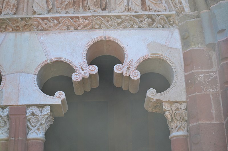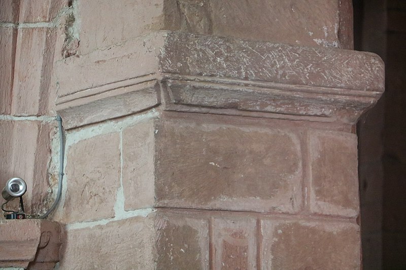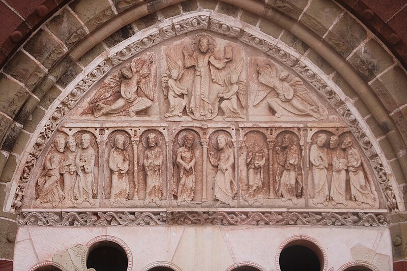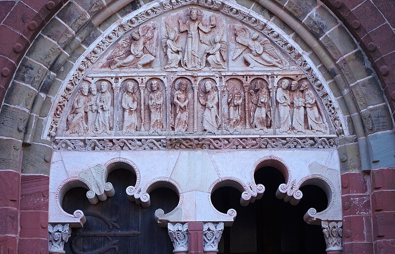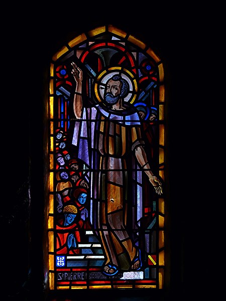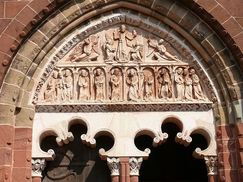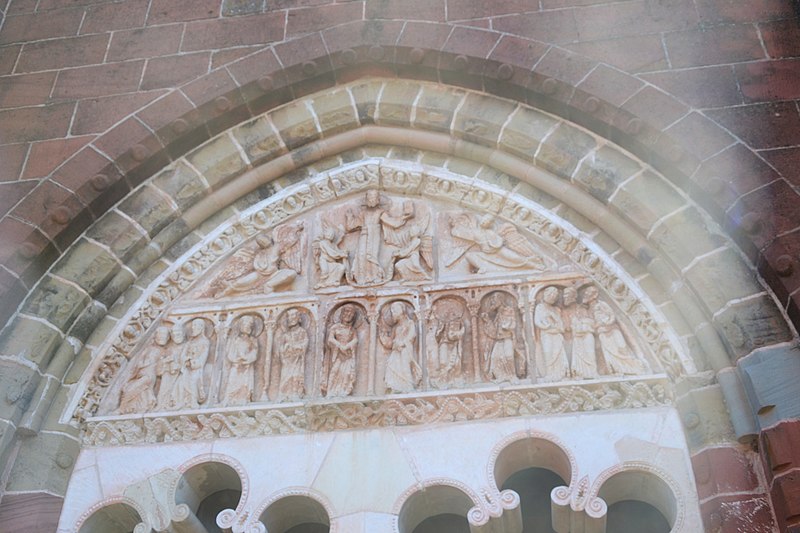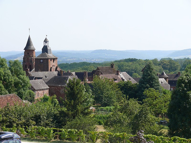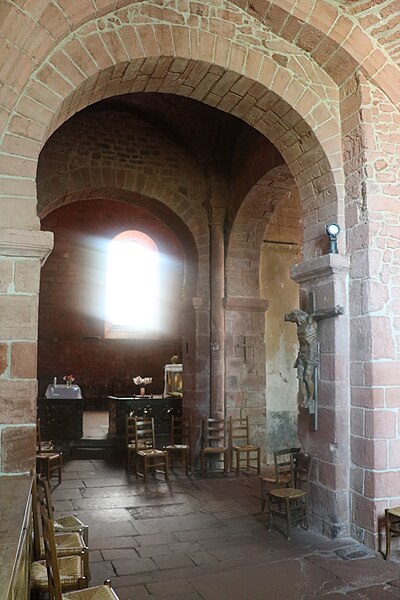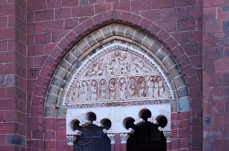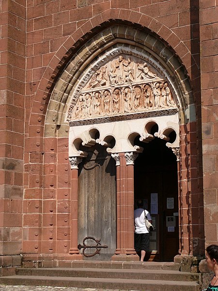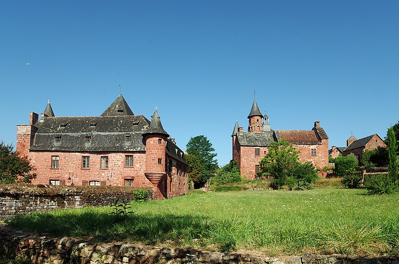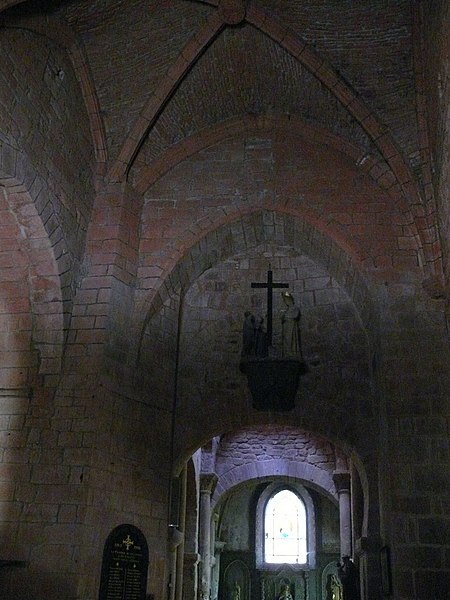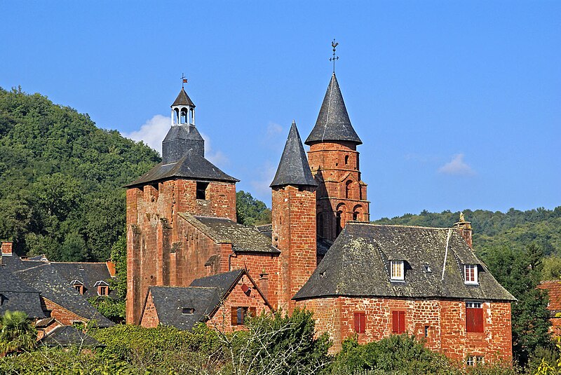 L'église Saint-Pierre (ou Saint-Sauveur) de Collonges-la-Rouge, en Corrèze, est bâtie en grès rouge vers 1060-1070 et a été agrandie entre le XIIe et le XVe siècle. Elle a été fortifiée à la fin du XIVe siècle puis à nouveau au cours des guerres de Religion au XVIe siècle, période durant laquelle on ajoute la tour carrée au sud dite « tour du guetteur ». À la même époque médiévale on ajoute une deuxième nef, plus courte, et quatre chapelles de dimensions inégales, qui lui confèrent son plan irrégulier. Pour enrayer le déclin du village, la municipalité entreprend des travaux de conservation dès 1902 et obtient le classement de l'édifice au titre des monuments historiques le 4 avril 1905. Le clocher roman, peut-être le plus ancien du groupe régional des clochers à gâbles limousins, daterait du début du XIIe siècle. Sa base est carrée et comporte deux étages soulignés par de hautes baies en plein cintre dont les ouvertures sont accentuées par arcs, piliers et colonnes à chapiteaux sculptés. Deux niveaux octogonaux surmontent ces assises carrées, la transition étant masquée par des gâbles, et le dernier étage reçoit une couverture conique qui remplace l'ancienne flèche en grès. Cette structure rare, l'un des types les plus archaïques du clocher limousin, ne subsiste que dans quatre exemplaires régionaux. Le portail se distingue par un tympan en calcaire de Nazareth, de teinte claire, qui contraste avec le grès rouge de l'église. Ce tympan, attribué à des sculpteurs toulousains au XIIe siècle, aurait été démonté et scellé dans le pignon pour le préserver des violences pendant les guerres de Religion, puis remis en place lors de la restauration de 1923. Ses sculptures en demi-relief représentent, selon les spécialistes, soit l'Ascension, soit le Retour du Christ ; au centre du registre supérieur le Christ tenant le Livre aux sept sceaux est encadré d'anges, et le registre inférieur montre la Vierge entourée de onze apôtres. Les deux arcs trilobés qui supportent le tympan reposent sur quatre chapiteaux à palmettes perlées ; le chapiteau droit, décoré d'un montreur d'ours, est d'origine, les trois autres étant des copies réalisées lors d'une restauration. L'intérieur s'ouvre sur une nef romane très dépouillée, tandis que la nef de gauche, de style gothique, est éclairée par des vitraux. La tradition locale rapporte que, pendant les guerres de Religion, le culte catholique se tenait dans la nef principale et le culte protestant dans la chapelle Saint-Jacques, chaque camp cherchant à perturber l'office de l'autre. L'autel principal, peint en bleu et doré, réunit des éléments de différentes époques : un autel du XIXe siècle, un gradin en partie du XVIIe siècle, un tabernacle du XVIIIe siècle et un retable reconstitué au XIXe siècle ; il a été classé en 1978 et restauré en 1984-1985. L'autel de la chapelle sud, son gradin, son tabernacle et son retable en bois sculpté et doré, représentant la Passion, datent du XVIIe siècle et sont inscrits aux monuments historiques. Une clôture de chapelle en bois sculpté et ajouré, ornée de coquilles, rinceaux, volutes, feuilles d'acanthe et atlantes, attribuée à la fin du XVIIe siècle ou au début du XVIIIe, est inscrite comme objet classé depuis 1982. La statue en bois du Christ gisant, datée du XVIe siècle et retrouvée dans une haie en 1971, est inscrite aux monuments historiques, de même que la Vierge de Pitié en bois doré et peint (XVIIe ou XVIIIe) et la Vierge à l'Enfant (XVIIIe). Un Christ en croix en bois sculpté, monté sur une croix rapportée et datant du XVIIe siècle, est également inscrit. L'édifice conserve ainsi un ensemble d'éléments architecturaux et mobiliers illustrant les évolutions stylistiques et les aménagements défensifs qui ont marqué son histoire.
