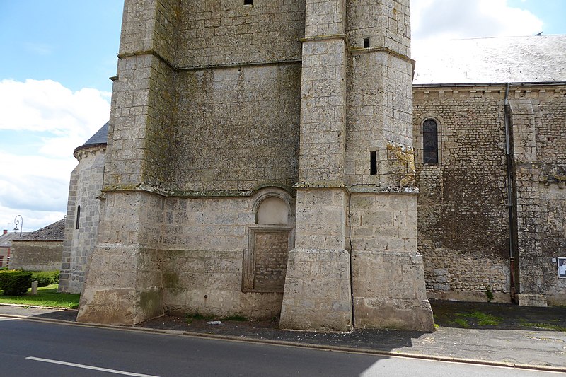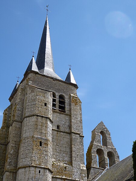 Elle présente la particularité de compter deux clochers : un mur-clocher à trois baies, appelé localement campanier, au-dessus du chœur, et, au nord, une tour à contreforts datée du XVIe siècle. L'église a été surélevée vers 1860 : la toiture à deux pans a alors été remplacée par une flèche en charpente. L'ensemble se distingue parmi les églises rurales du canton par la qualité de la pierre et de l'appareillage. La nef est couverte d'une voûte de briques du XIXe siècle ; cependant la charpente, assez bien conservée, remonte au XVIIe siècle et peut-être au XVIe. Le comble du chœur paraît plus ancien, peut-être du XVe siècle. Les vues du monument font apparaître la tour et le chevet, des perspectives depuis le nord-ouest et l'est, la base nord de la tour-clocher avec ses ouvertures murées, ainsi que le mur-clocher et les clochetons.