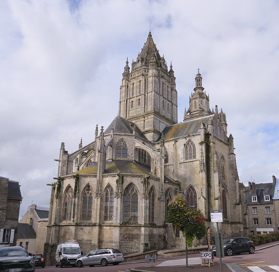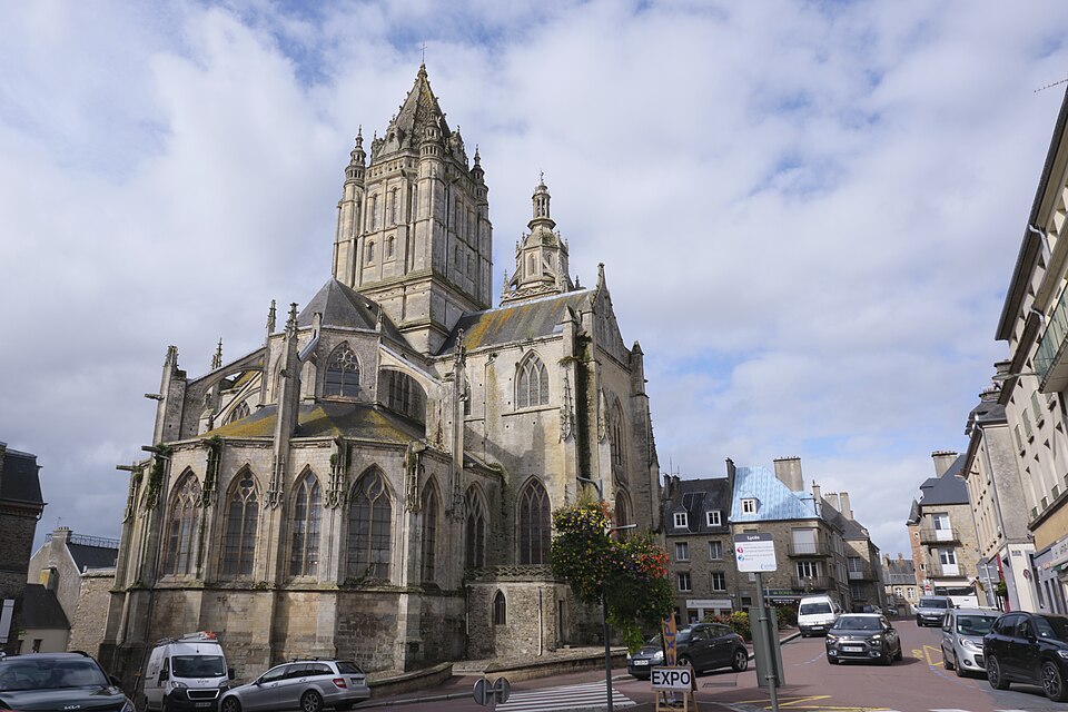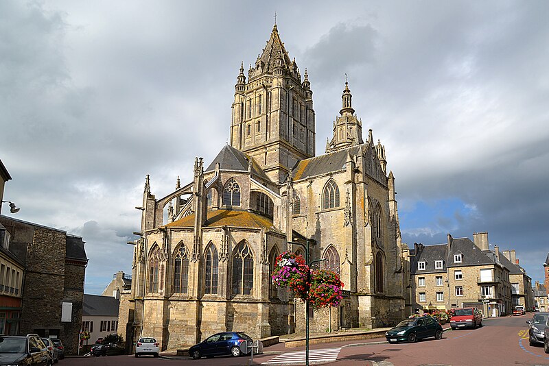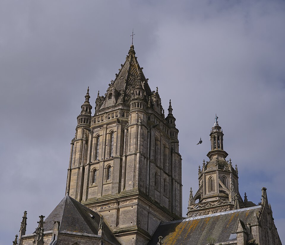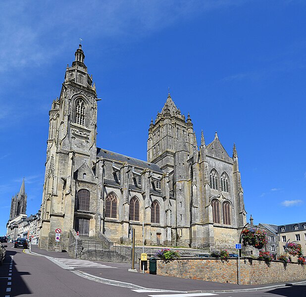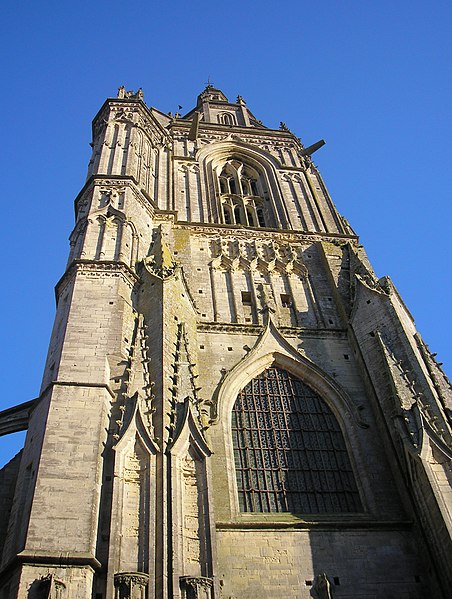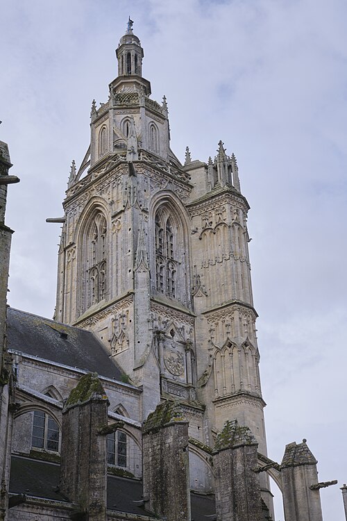 Très dépouillée d'ornementation, l'église a toutefois conservé des vestiges de l'édifice antérieur : chapiteaux à crochets du XIIIe siècle, arcatures en tiers-point et corniches à crochets visibles au bas du clocher occidental, au sommet des murs de la nef, des bas-côtés, des croisillons et du chœur. Quatre piles de la croisée soutiennent, au‑dessus de pendentifs, une tour-lanterne octogonale de la Renaissance inspirée de celle de Notre-Dame de Coutances. Selon une inscription, cette tour fut commencée en 1550 et achevée en 1581, financée par des quêtes et des aumônes obtenues après des indulgences accordées par le pape Alexandre VI ; les comptes de la fabrique citent les maîtres maçons Richard Vatin et Guillaume Le Roussel. La forme singulière du couronnement, rapprochée d'une tiare pontificale, évoque cette participation pontificale, et le portail principal fut ajouté vers 1550. Le chœur appartient au XVIe siècle et le maître-maçon Nicolas Saurel travaillait encore au rond-point en 1581.