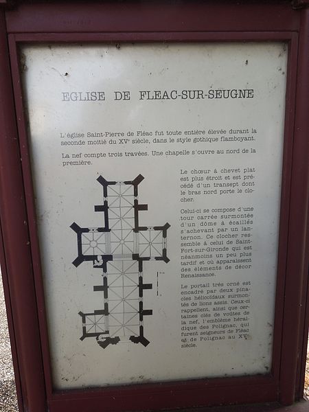 L'église paroissiale Saint-Pierre de Fléac-sur-Seugne remonterait à une fondation du XIIe siècle, mais l'édifice a été largement rebâti à la fin du XVe siècle, les parties les plus anciennes datant de cette période. L'édifice est classé au titre des monuments historiques depuis 1904. Le clocher, daté du XVIe siècle, se présente en dôme recouvert d'écailles et est surmonté d'un lanternon. Le portail Renaissance présente deux colonnes torses et porte le blason des Polignac, figuré par deux lions, seigneurs de Fléac au XVe siècle. La nef, composée de trois travées, est couverte d'une voûte ogivale en pierre dont la clé est décorée. Le baptistère, aménagé dans le mur nord, est éclairé par une ouverture tréflée. Le bras gauche du transept est voûté en ogive ; son centre est percé pour permettre l'accès aux cloches. L'abside, de plan carré, se termine par un chevet plat doté de trois fenêtres, dont une à meneaux. Les vitraux, réalisés par l'atelier Charlemagne de Toulouse, représentent la Pentecôte, l'Ascension, l'adoration des bergers et la vocation de Pierre. L'édifice adopte un plan en croix latine et s'appuie sur des contreforts. Parmi les éléments remarquables figurent le clocher, le baptistère, une chapelle latérale, la façade nord et la nef.