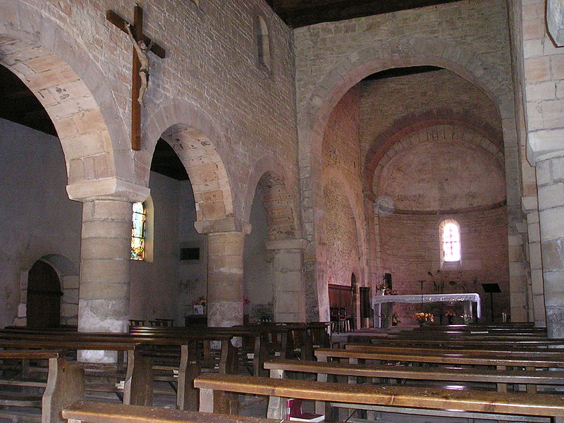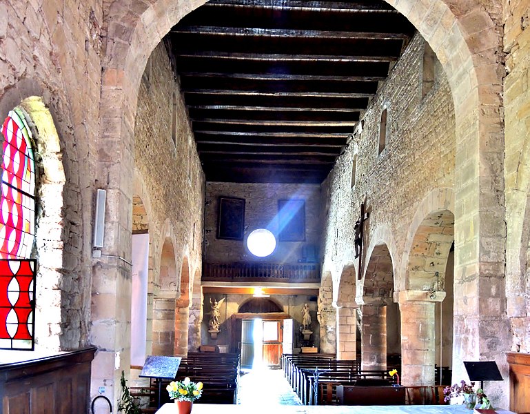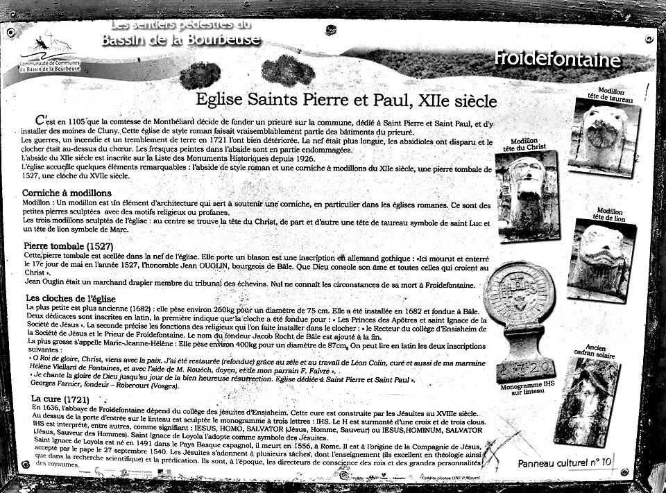Au sud-est de Belfort, dans le Sundgau, l'église romane de Froidefontaine est dédiée à saint Pierre. Elle dépendait du prieuré clunisien fondé en 1105 par Ermentrude, veuve du comte Thierry de Montbéliard et sœur du pape Calixte II et de l'archevêque de Besançon Hugues II. Le prieuré, construit au XIIe siècle, connut une période de déshérence aux XVIe et début XVIIe siècles. Il fut attribué vers 1636 au collège des Jésuites d'Ensisheim par l'archiduc Léopold de Habsbourg (1614-1662), héritier de l'avouerie du prieuré. De ce renouveau communal date le bâtiment situé au nord de l'église, construit en 1720. Des travaux de réparation et de reconstruction de la nef ont également été menés au début du XVIIe siècle. Lorsque l'ordre des Jésuites fut supprimé en Alsace en 1765, les biens du collège d'Ensisheim furent attribués au Collège royal de Colmar jusqu'à la Révolution française. Au début du XIXe siècle, le prieuré connut de nouvelles transformations : deux bâtiments abbatiaux furent détruits et les travées occidentales de la nef furent partiellement démolies. Une nouvelle façade fut dessinée en 1833 par l'architecte belfortain Aristide Poisat. Avant la Révolution, l'église avait déjà perdu certains éléments romans — l'absidiole sud et le bras de transept sud, identifiés par sondage archéologique — ainsi que sa toiture à deux pans; il est possible que le clocher ait précédemment été placé à la croisée du transept. Des travaux menés en 1953 puis entre 1970 et 1980 ont encore modifié l'édifice. L'église présente un vaisseau de type basilical avec une nef et des bas-côtés sur quatre travées, plusieurs travées occidentales faisant défaut. La nef comporte quatre travées d'arcade en plein cintre reposant sur des piles cylindriques munies de tablettes carrées chanfreinées et d'une base octogonale taillée net. Les colonnes de la première travée, plus massives, portent des chapiteaux cubiques surmontés de tailloirs moulurés. Le chœur s'ouvre sur une abside en demi-cercle voûtée en cul-de-four; l'arc de l'abside repose sur des impostes sculptées. À l'extérieur, l'abside est ornée d'une corniche ouvragée intégrant trois têtes sculptées. Divers éléments sculptés ont par ailleurs été retrouvés aux abords de l'église. René Tournier rattache stylistiquement Froidefontaine à l'influence rhénane, rapprochement compatible avec d'autres églises romanes du Sundgau telles que l'église Saint-Jacques-le-Majeur de Feldbach.